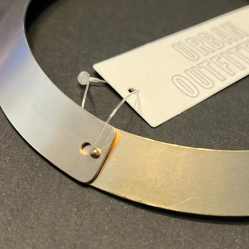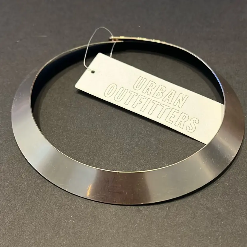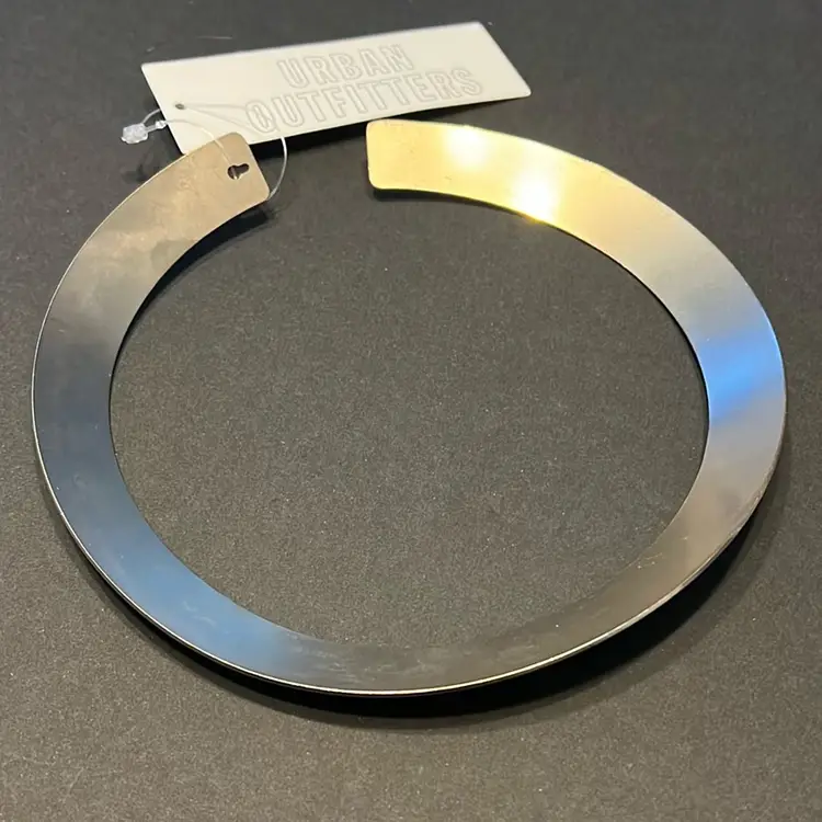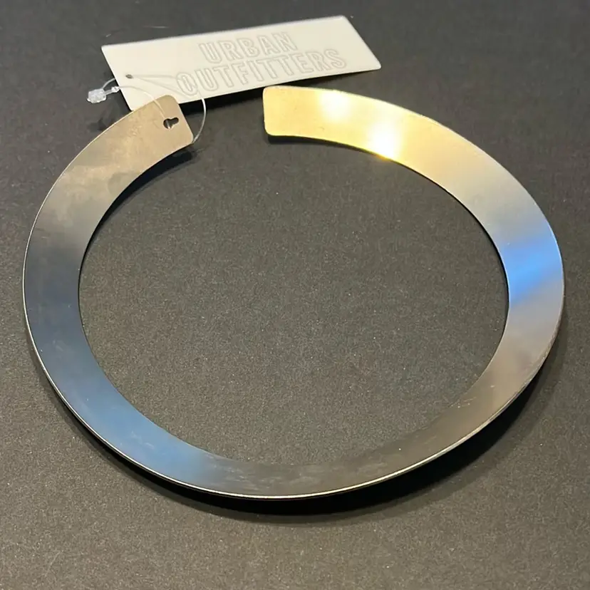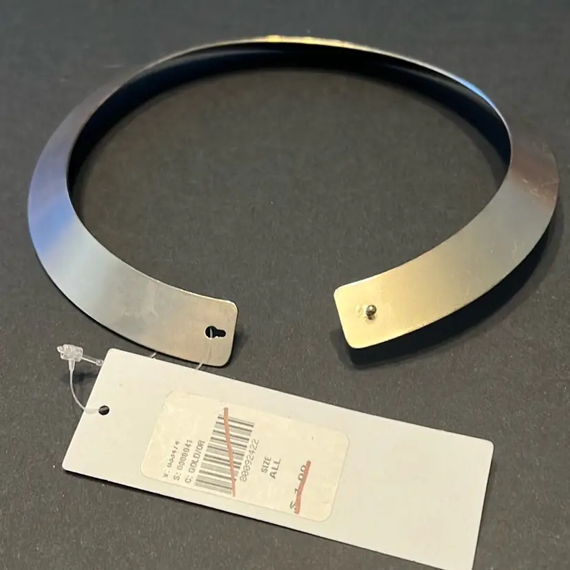 Round metal, choker, goldish, silver tone. New with tags. Bag A