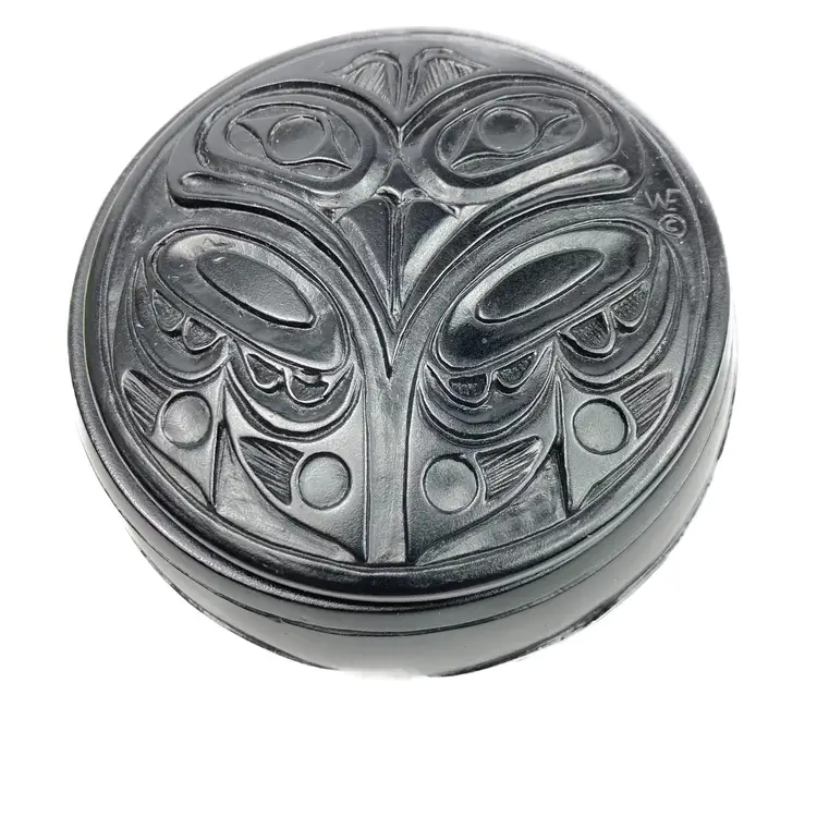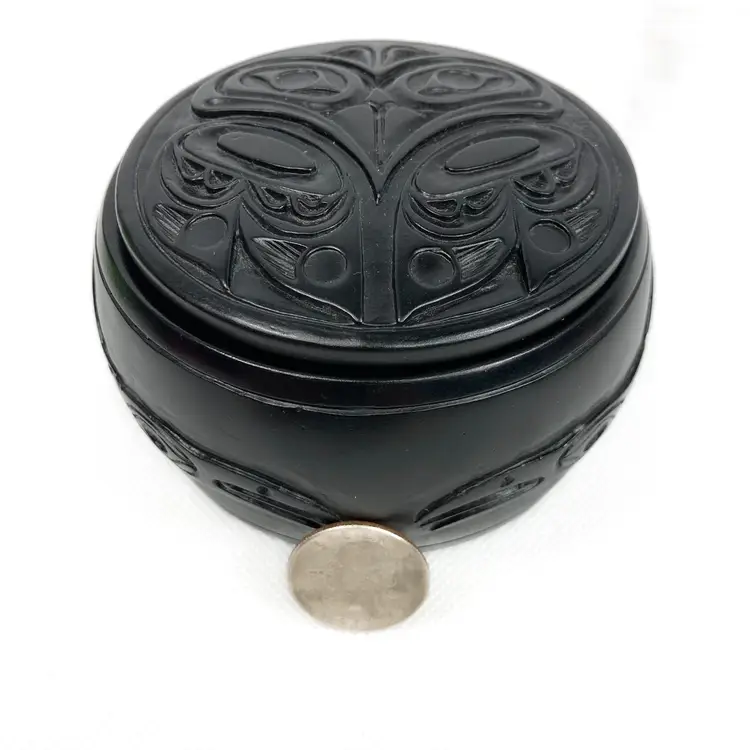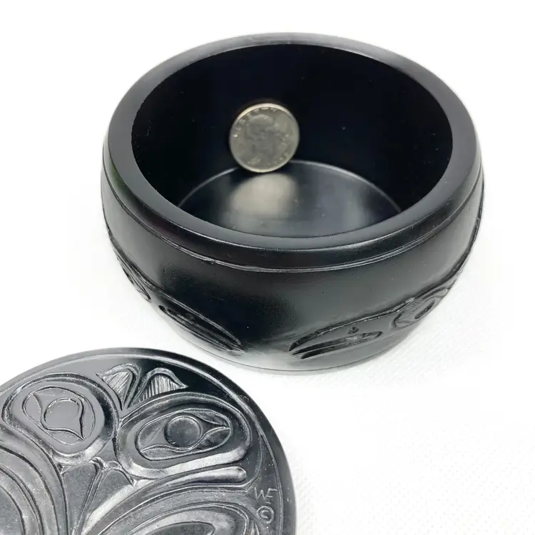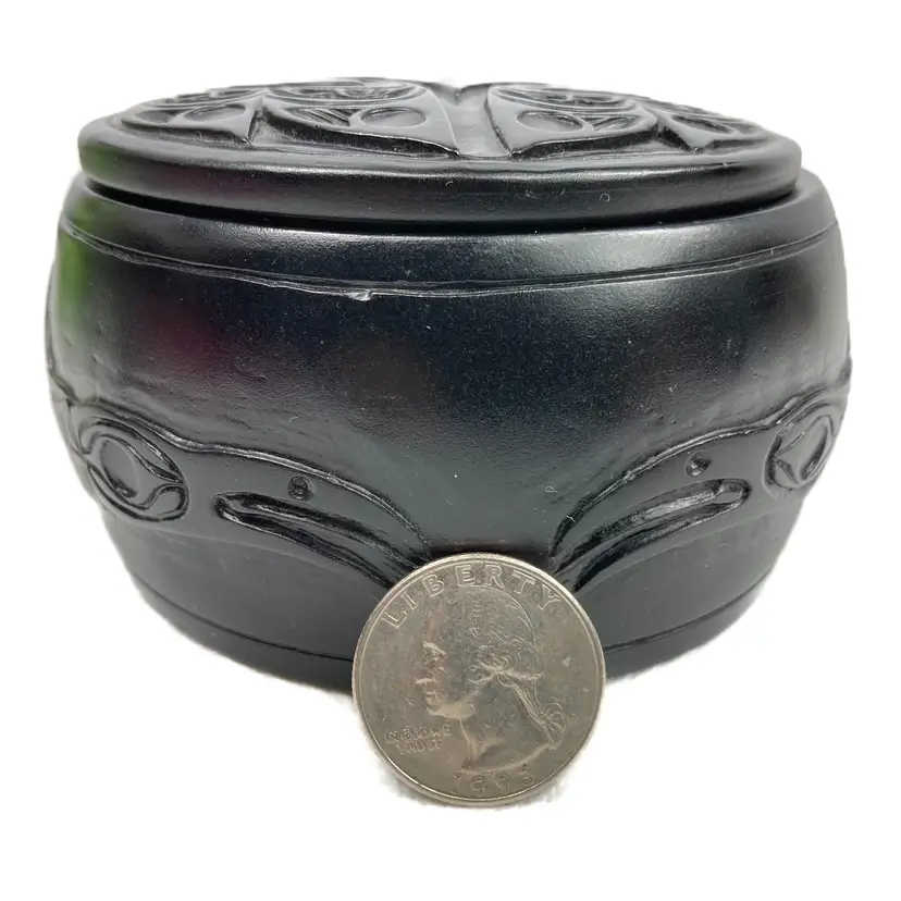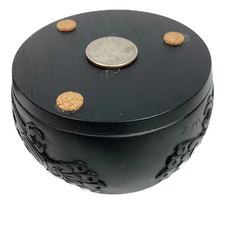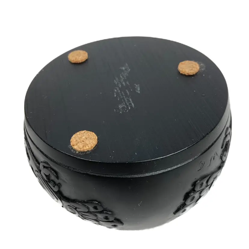 Pre-owned in great condition. No cracks or scratches noted. Signed WF on both the lid and on the base. Base is about 12.5" around. Round box is about 2.25" deep and the lid measures 3.5" across. Fits in the palm of an adult hand. Heavy little trinket box-weighs a little over 15 oz. See quarter in photos for scale.