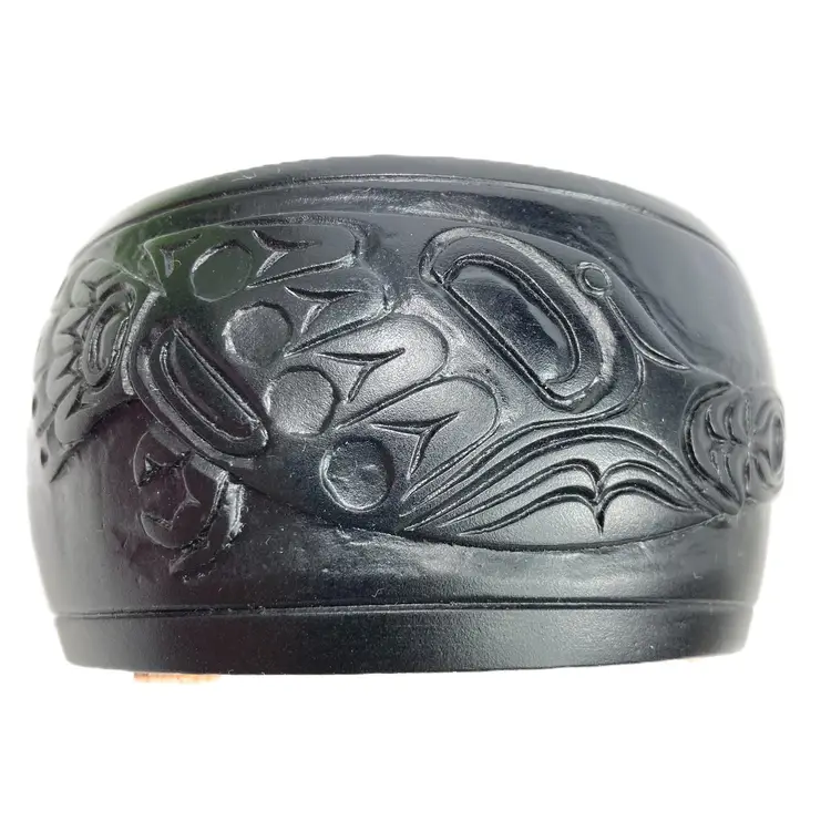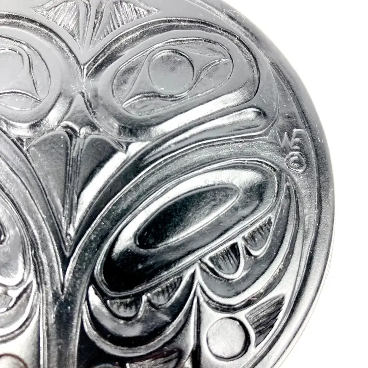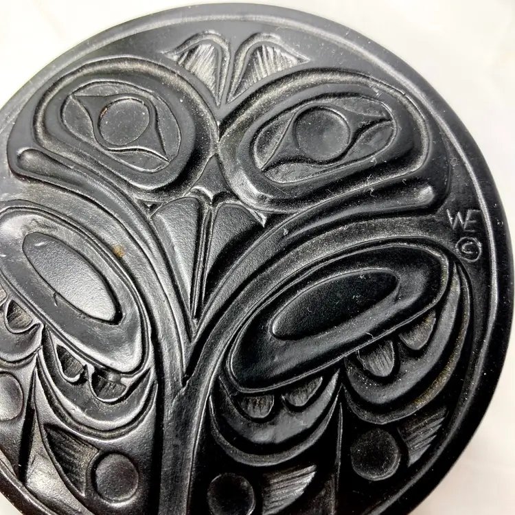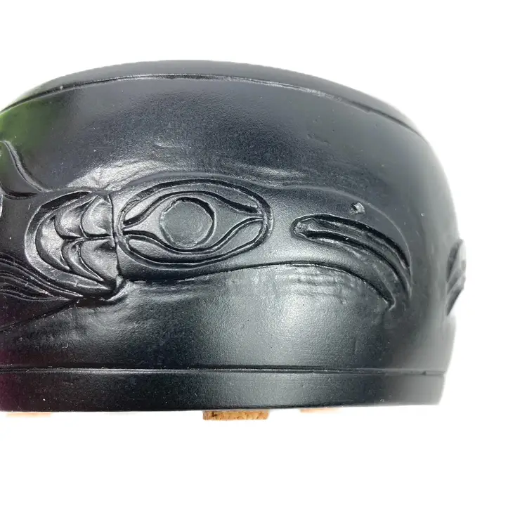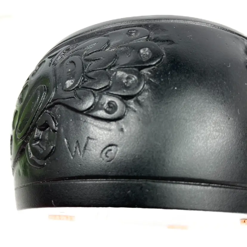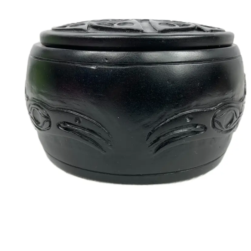 Pre-owned in great condition. No cracks or scratches noted. Signed WF on both the lid and on the base. Base is about 12.5" around. Round box is about 2.25" deep and the lid measures 3.5" across. Fits in the palm of an adult hand. Heavy little trinket box-weighs a little over 15 oz. See quarter in photos for scale.