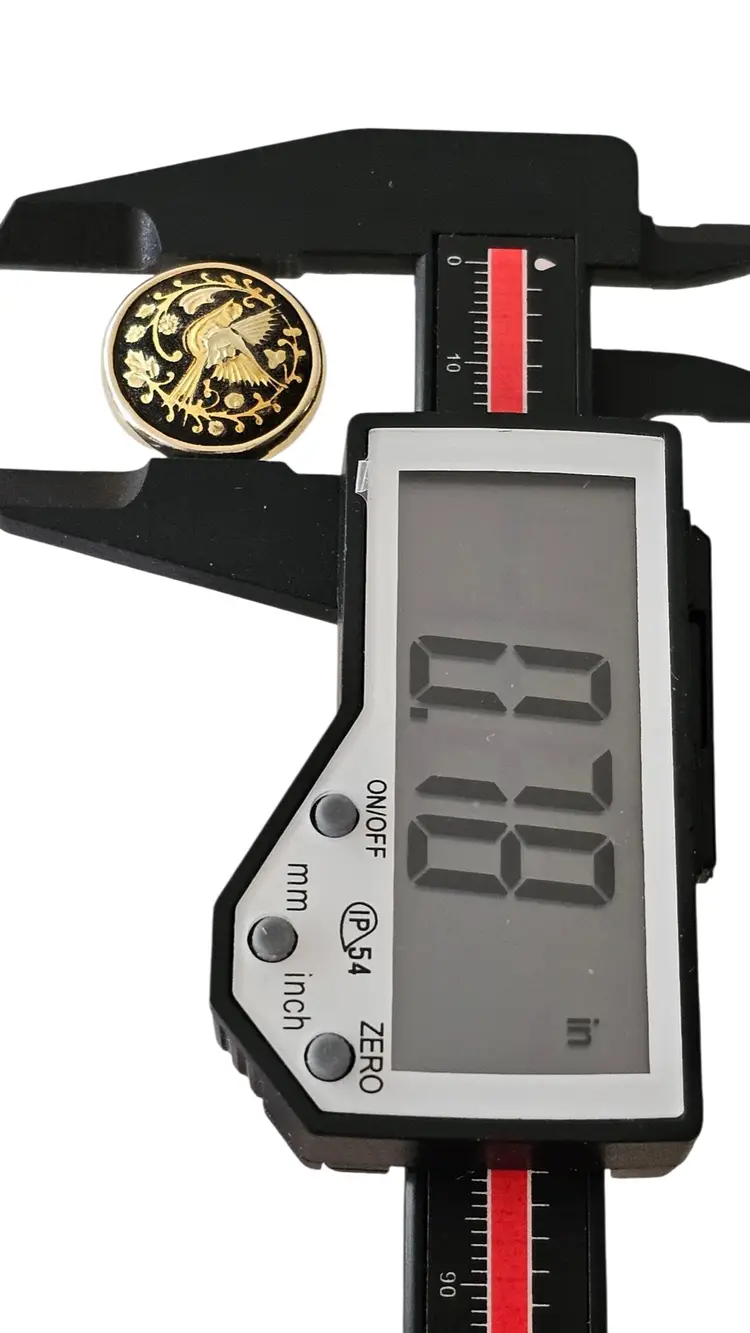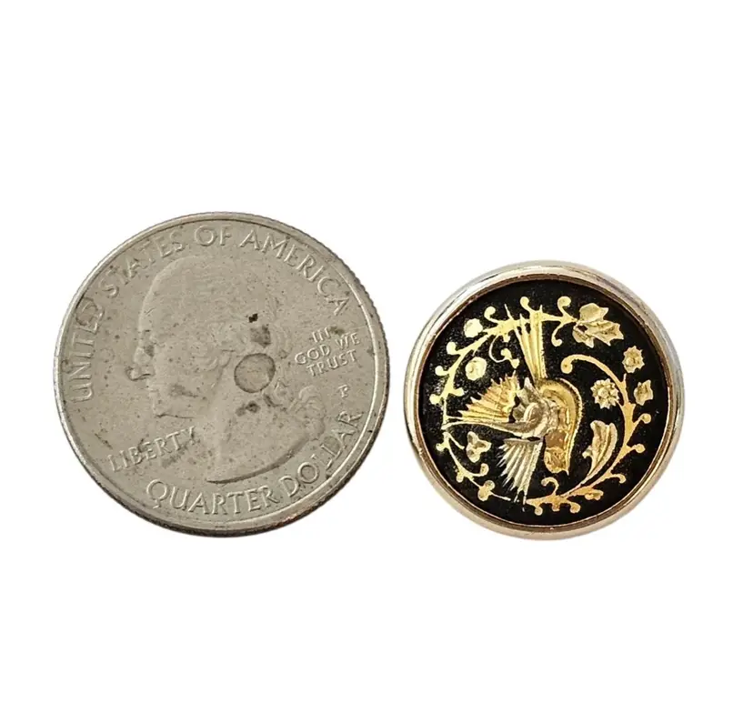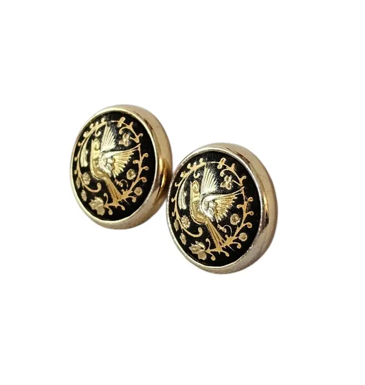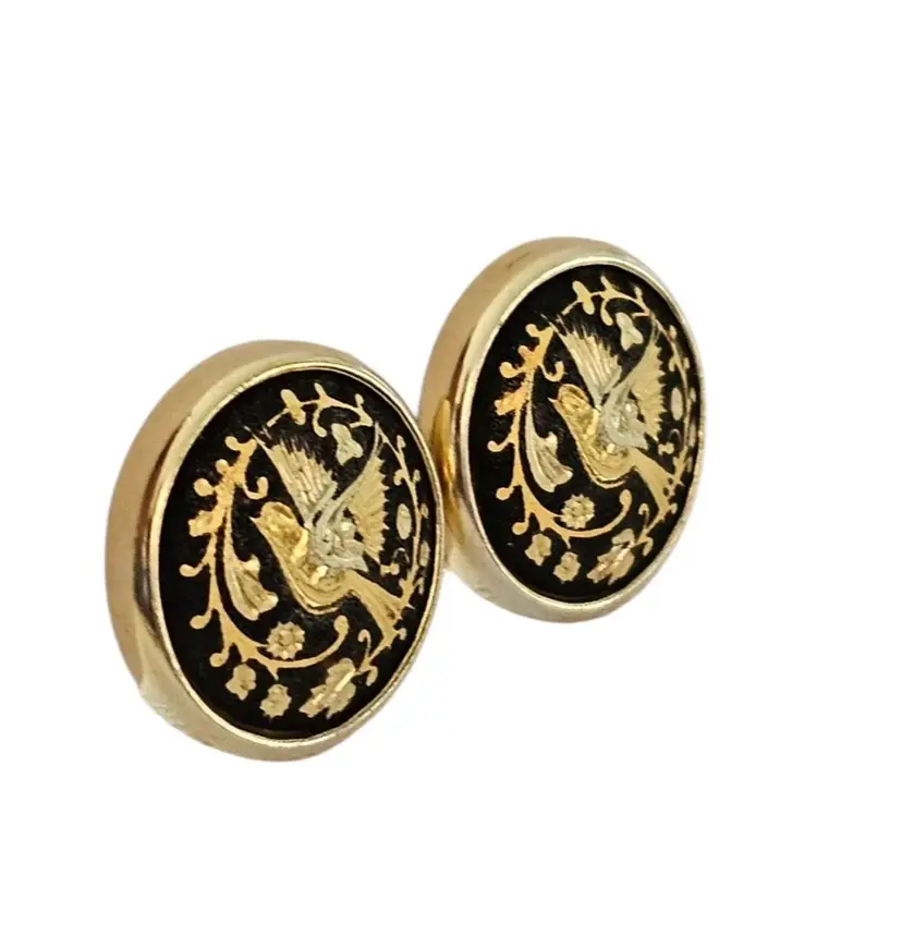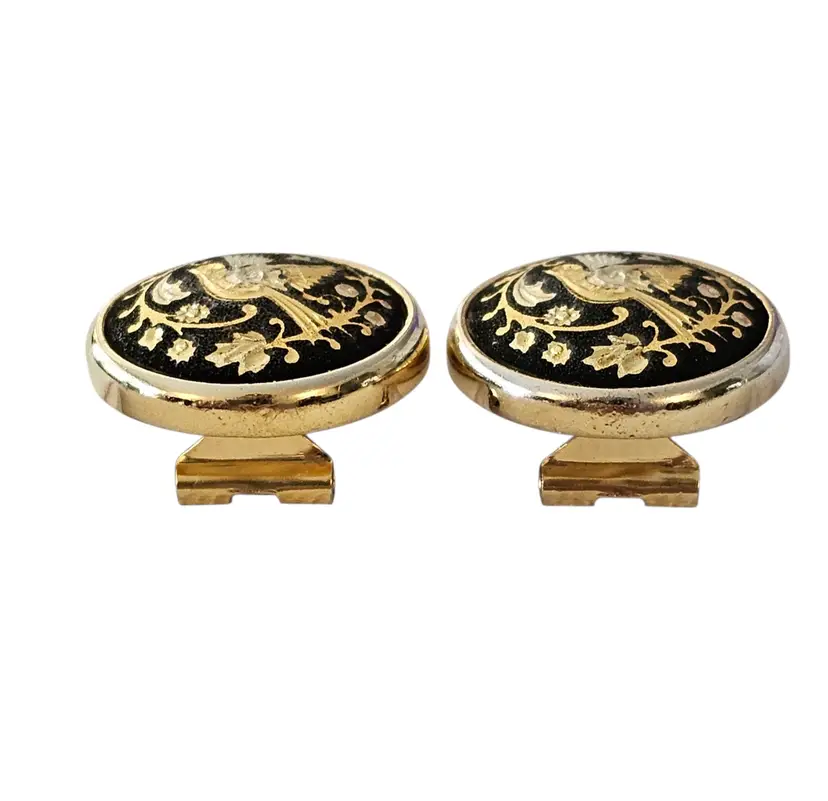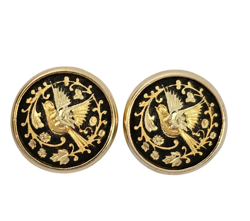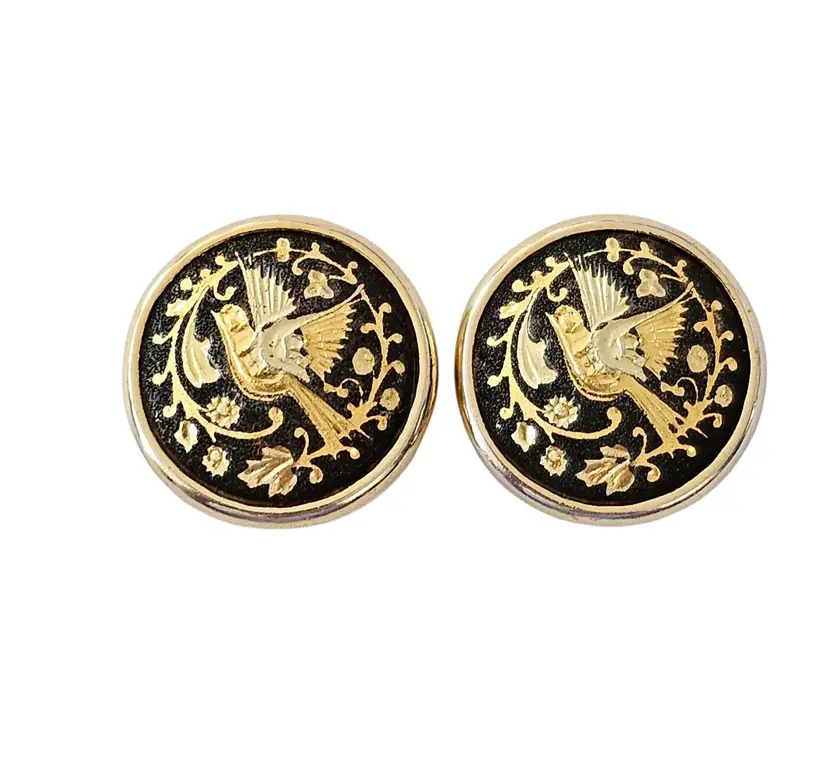 • Round Damascene Bird Clip On Earrings • Vintage clip earrings • Radiant gold tone base metal • Round button style • Bird and floral design • Contrasting black background • Measures approximately 0.8 inches in diameter • Omega backs, providing strong support and comfort • Good condition • C49