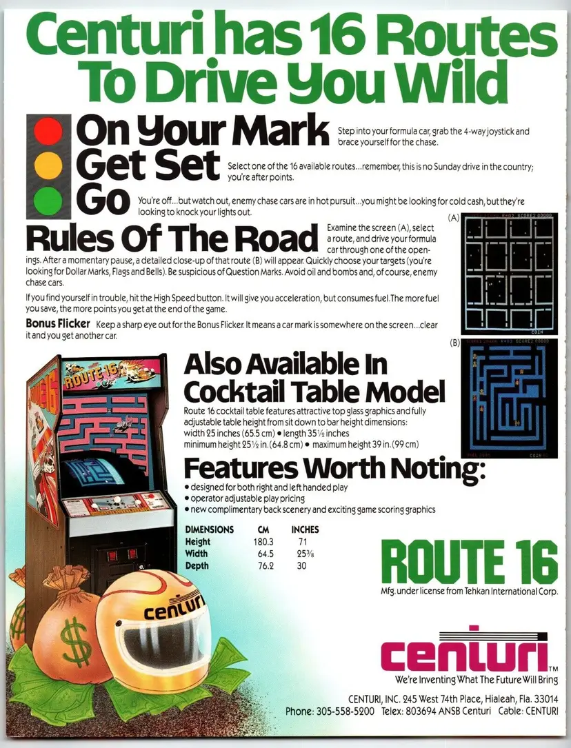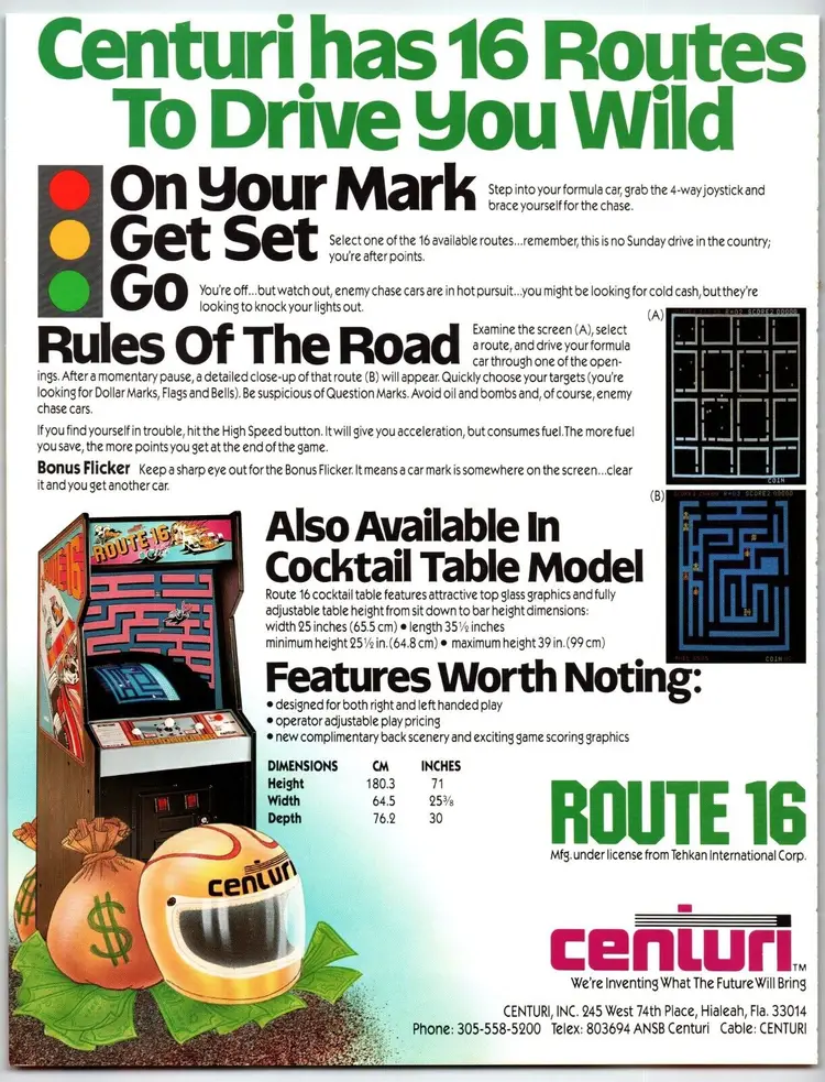 Brand: Centuri Year: 1981 Game Title: Route 16 Theme: Driving Original/Reproduction: Original Country/Region of Manufacture: United States Modified Item: No Arcade: Flyer