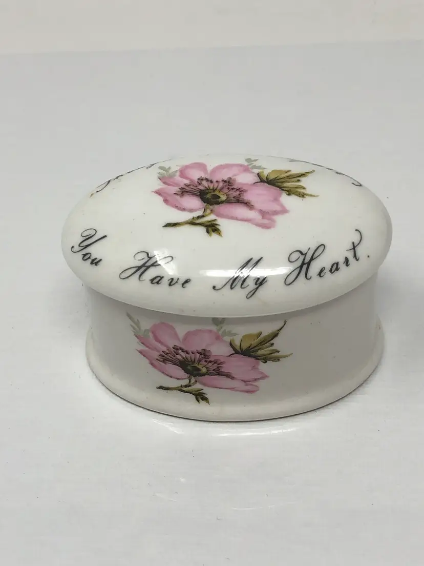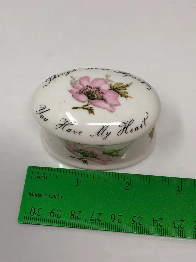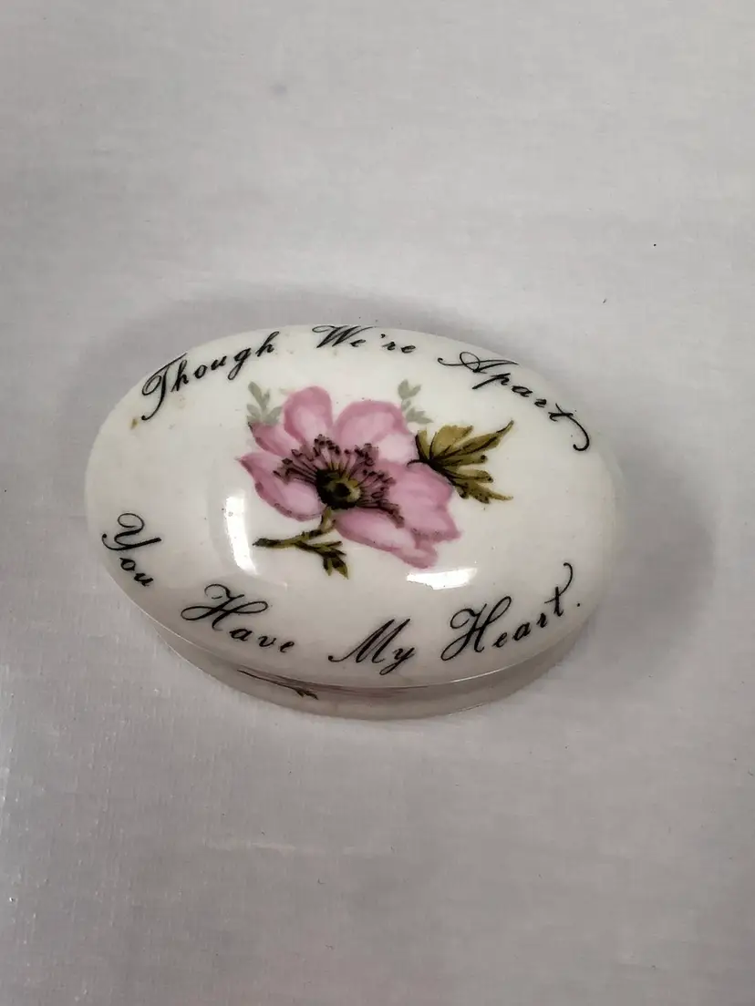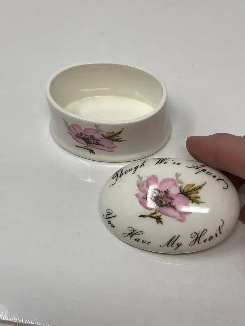 2 1/2" oval trinket box with lid. Stamped on the bottom Royal Adderley Floral bone China Made in England. Though we're apart You hold my heart. No chips or cracks