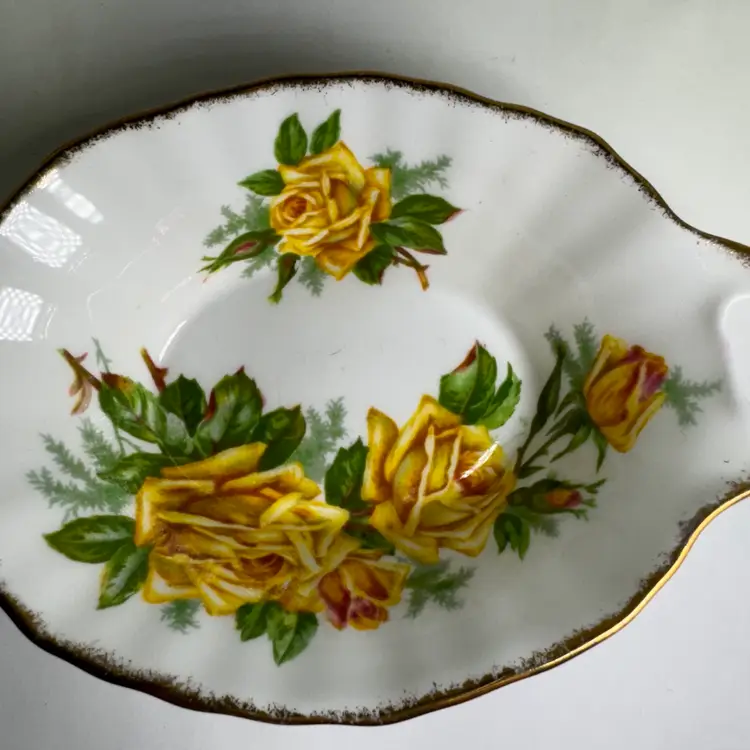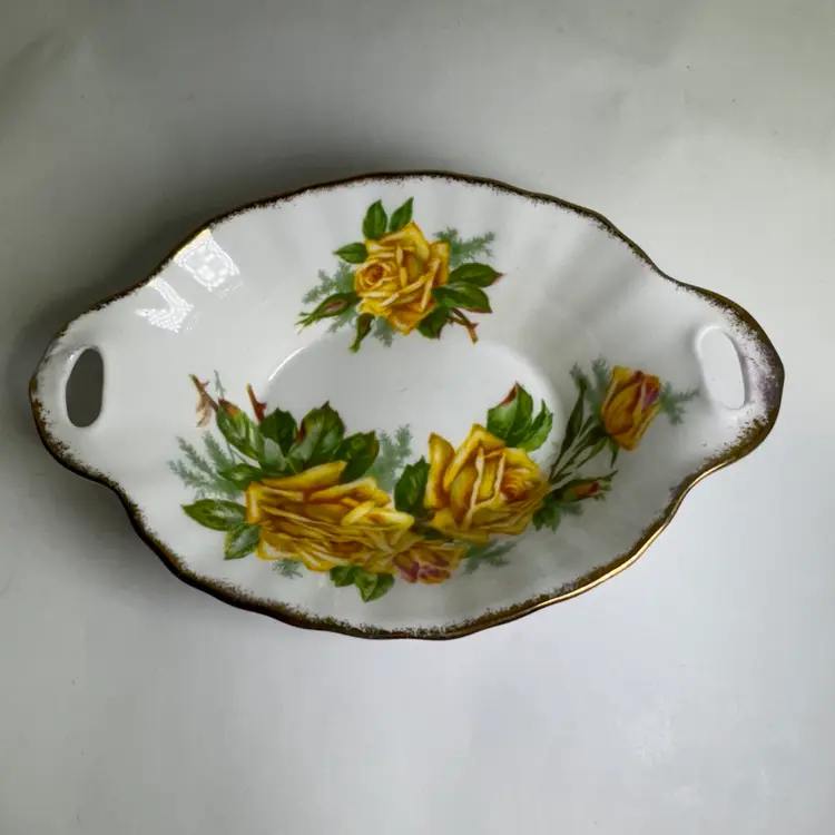 Pretty little dish, use for trinkets, jewelry or loose change. Measures: 5.75" wide x 3.75" length Weights: 3 oz