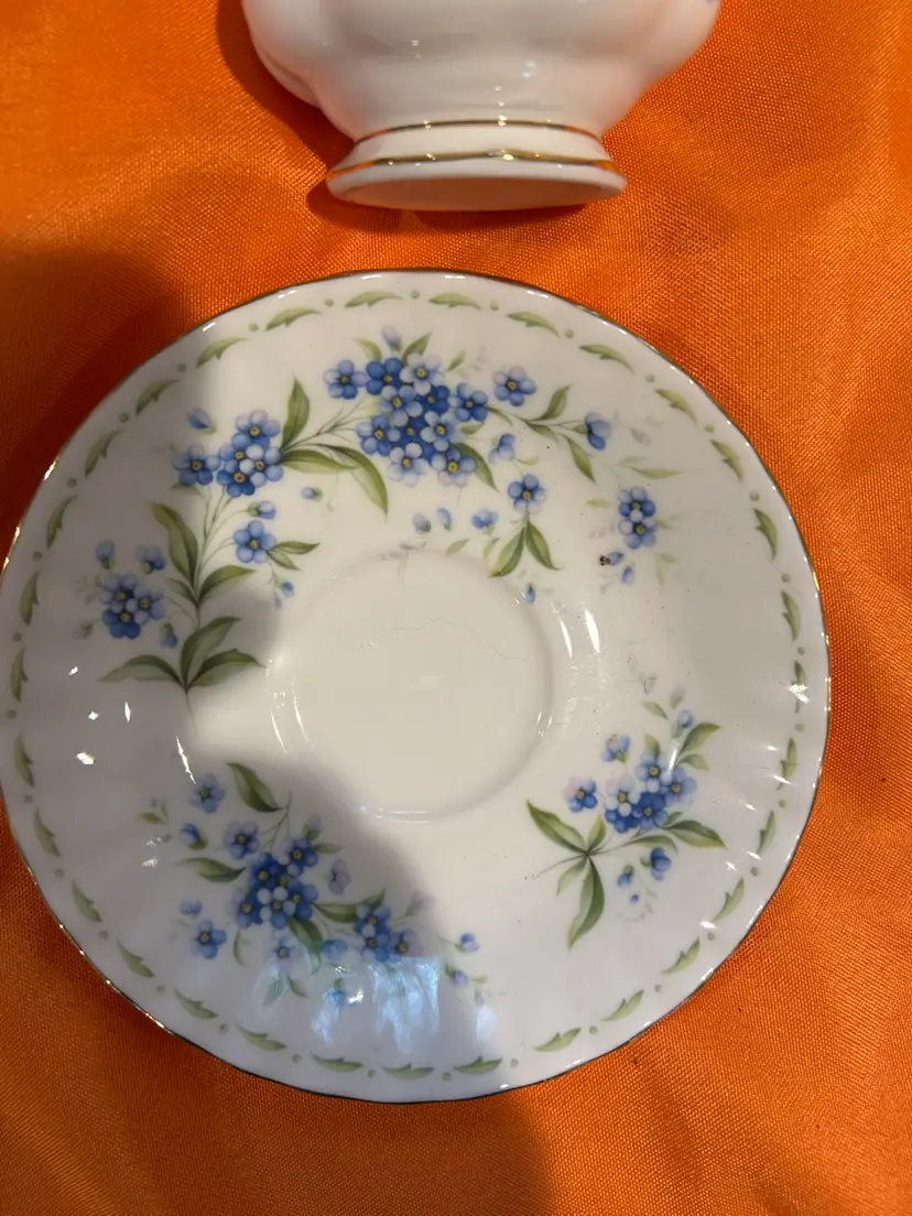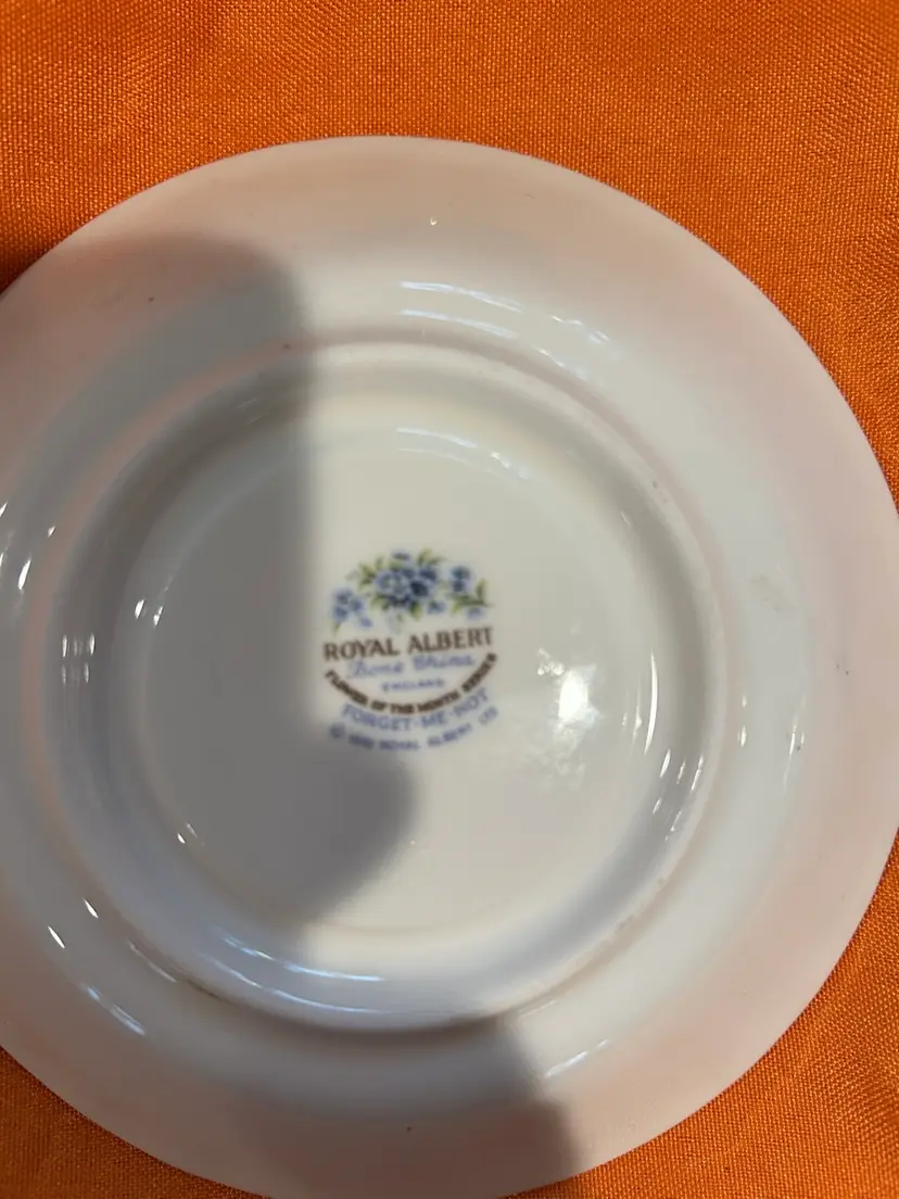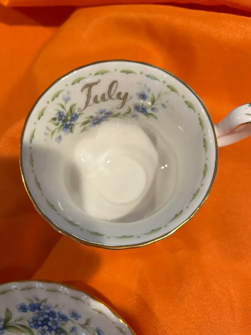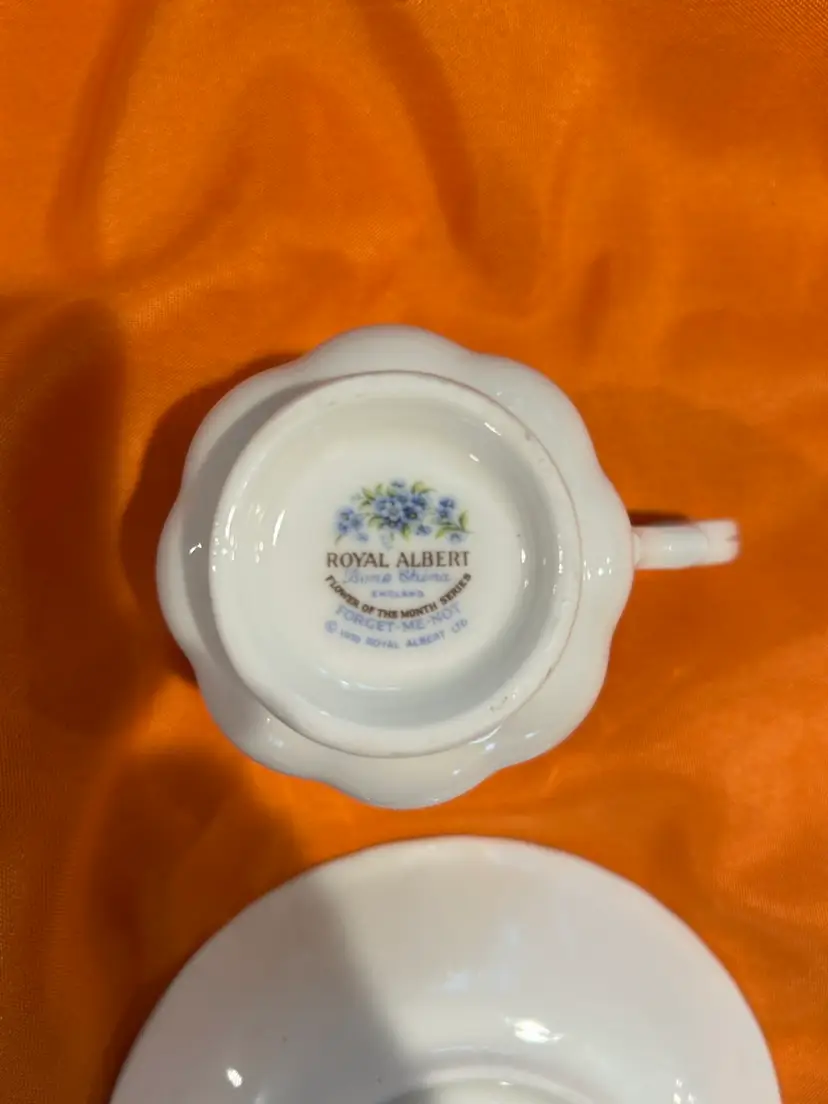 The Royal Albert England Tea Cup & Saucer from the July Forget Me Nots Flower Of Month Series features a beautiful blue pattern celebrating the July flower of the month. This tea cup and saucer set is a charming addition to any tea party or collection, showcasing the craftsmanship and elegance of Royal Albert pottery. Made in England and featuring a printed backstamp, this set embodies the traditional and timeless beauty of English bone china.