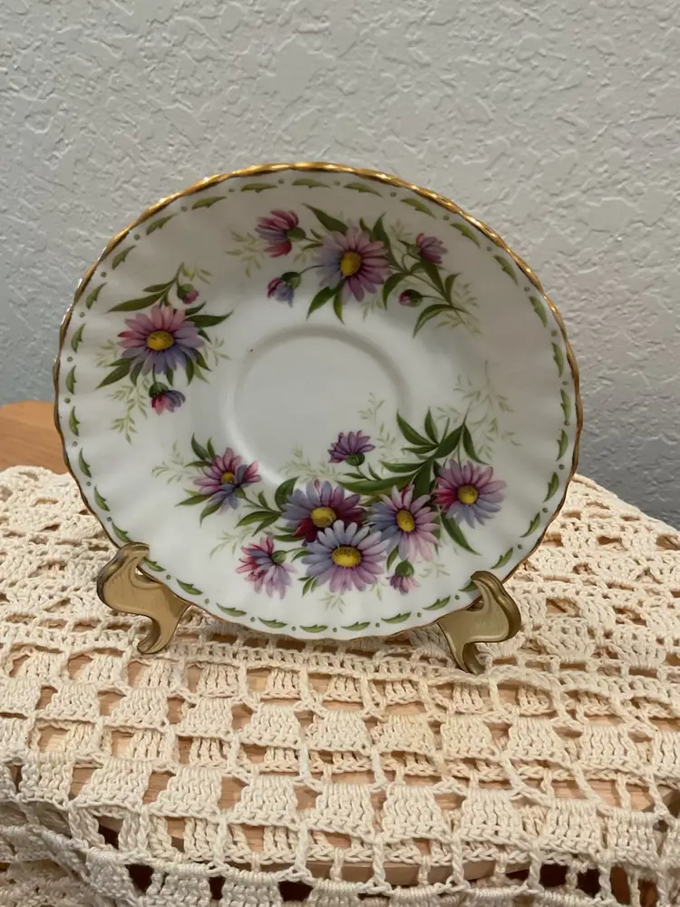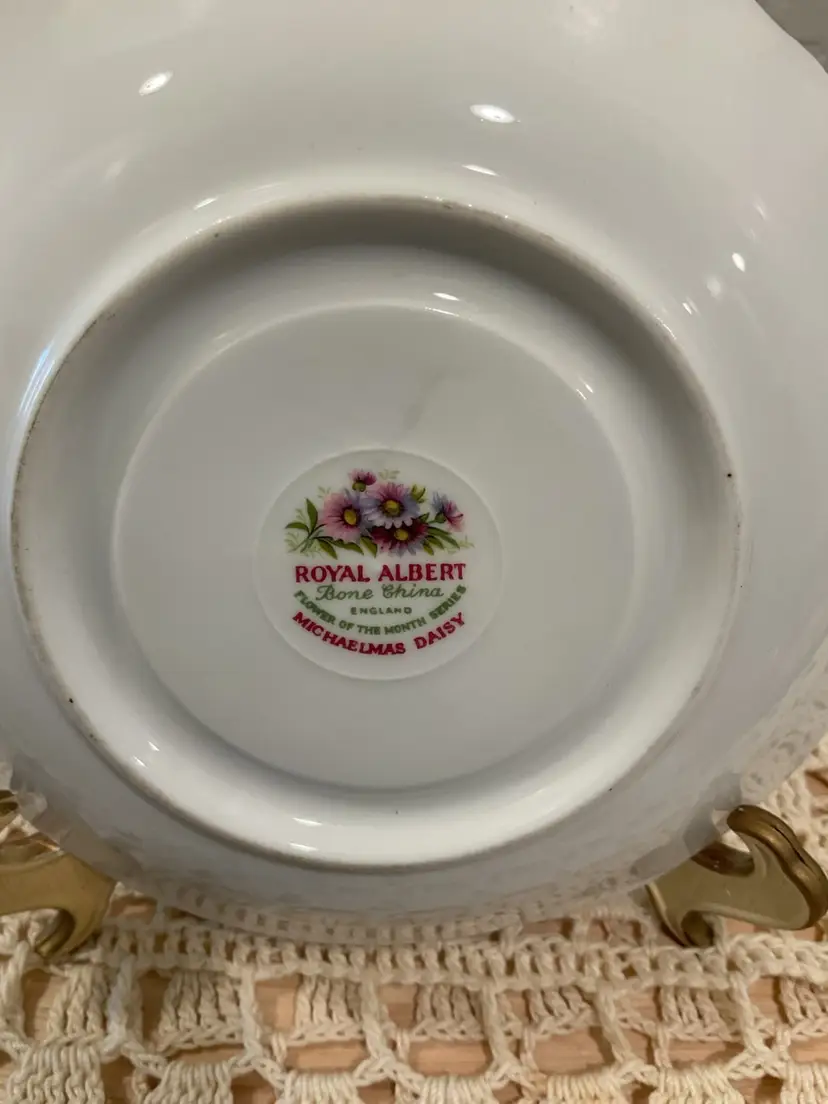 This is a Royal Albert Bone China tea saucer from the "Flower of the Month" series, specifically representing September with a Michaelmas Daisy pattern. Brand: Royal Albert. Pattern: September - Michaelmas Daisy. Material: Fine Bone China. Features: Features purple and yellow daisy floral designs with a gold-trimmed edge.