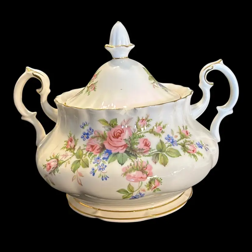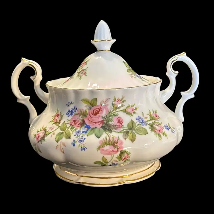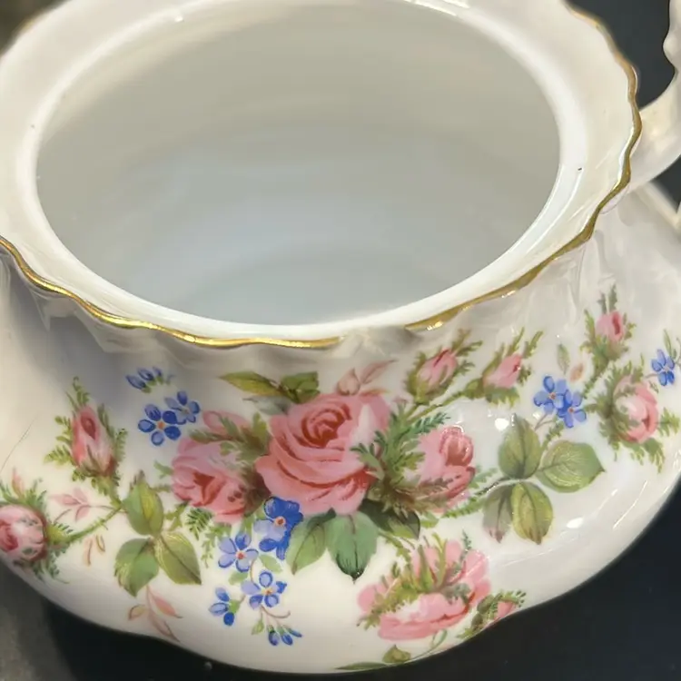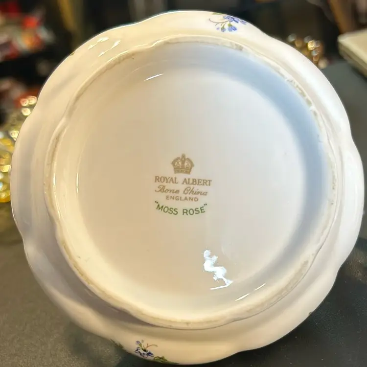 Made of bone china. There is a chip on the rim as noted in picture. 5 inches tall and 6 inches wide.