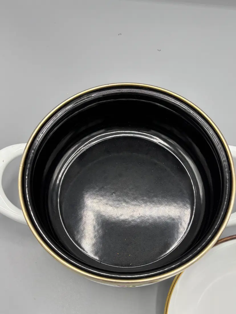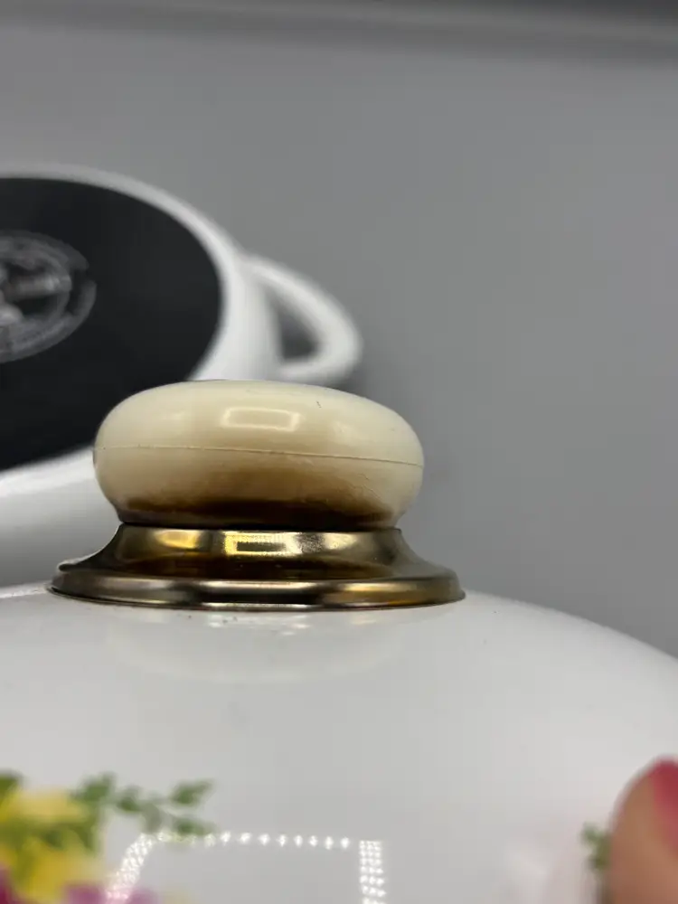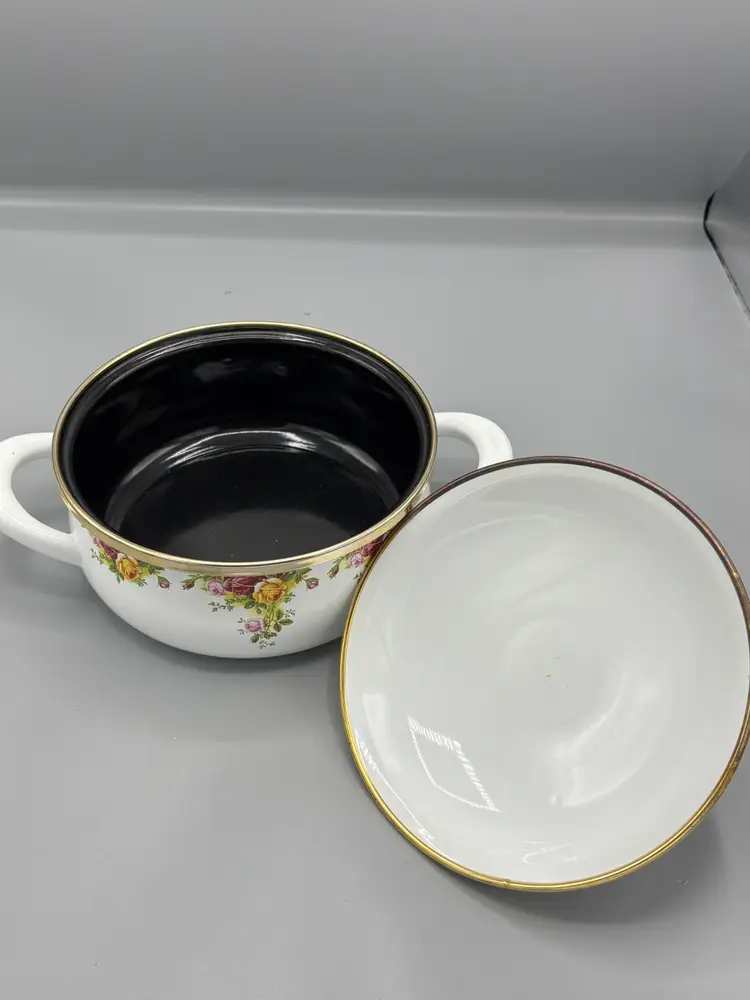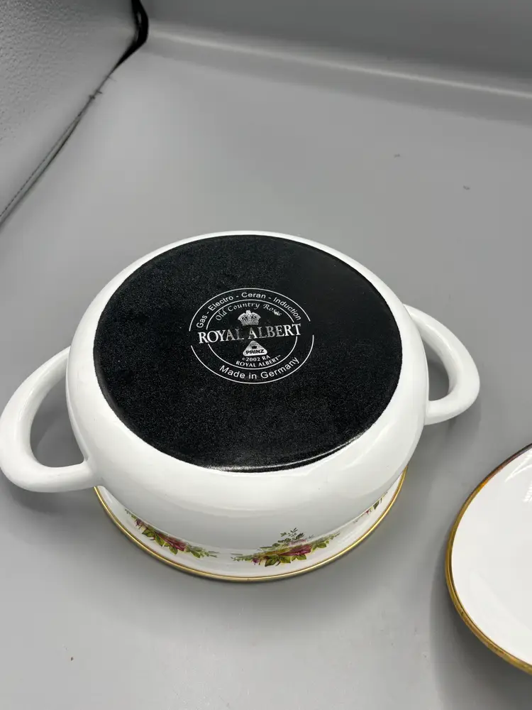 Royal Albert Old Country Rose casserole dish that has a few scratches on the side, refer to the pictures. The handle on the top of the lid has been repaired, refer to pictures.