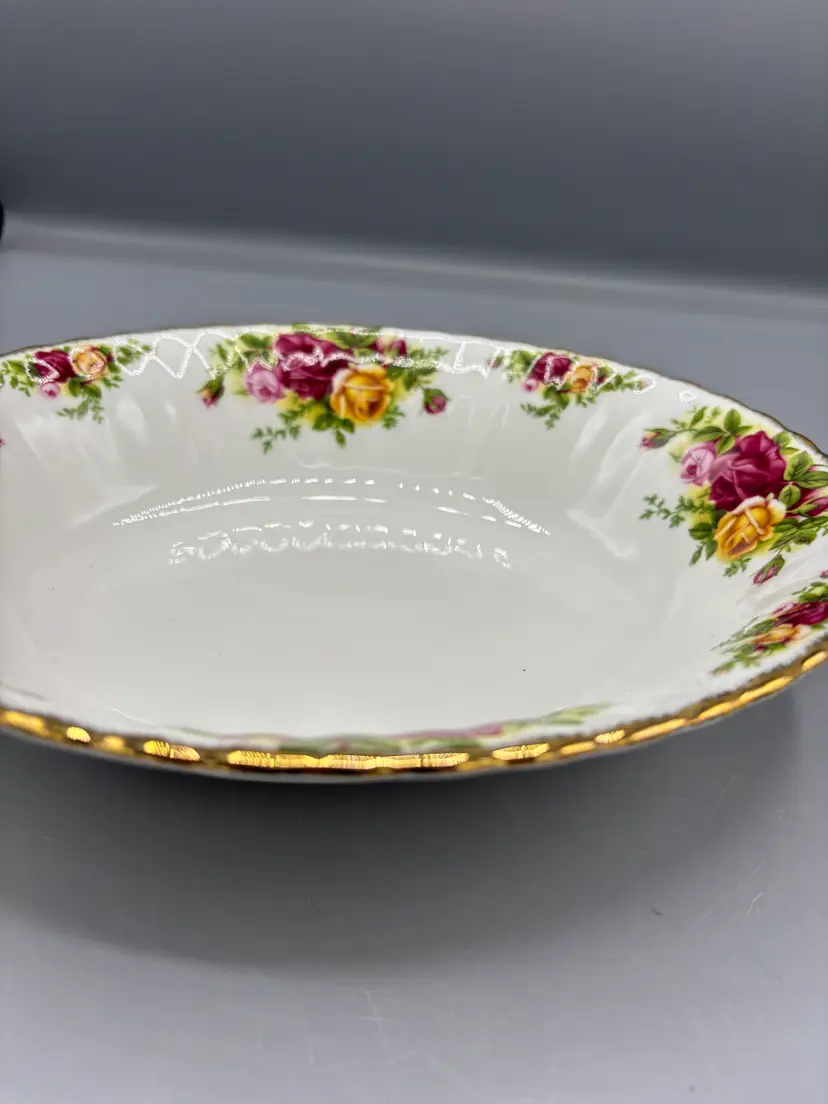 This beautiful oval bowl is in the Old Country Roses pattern by Royal Albert. This beautiful pattern has been around since the 1960's and continues to be highly sought.