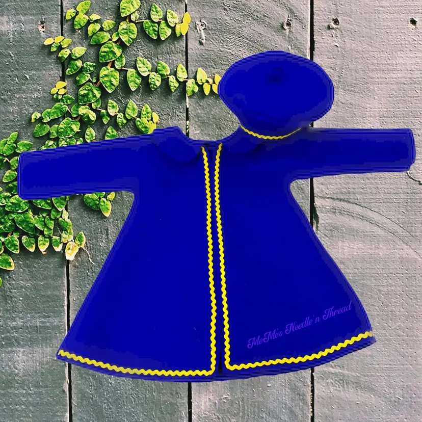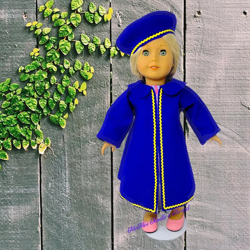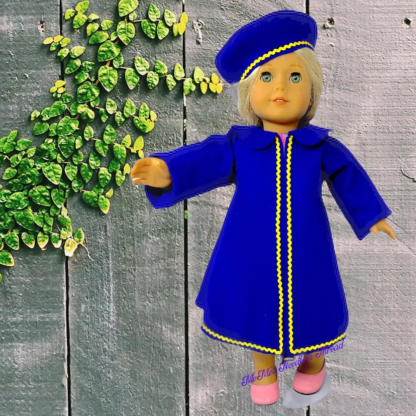 Add a touch of elegance to your 18" doll's wardrobe with this royal blue coat and matching beret. Featuring vibrant yellow trim, this set is perfect for stylish playtime adventures!