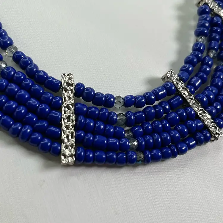 Royal Blue Glass Bead Necklace, Five Strand, Silver Tone 20” Long