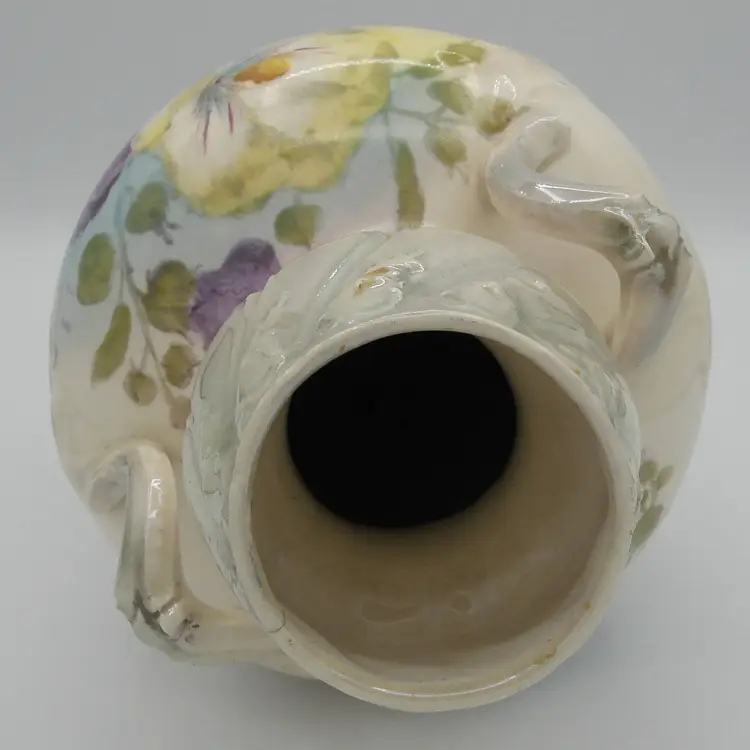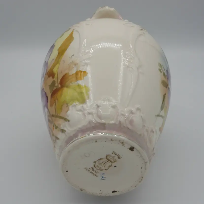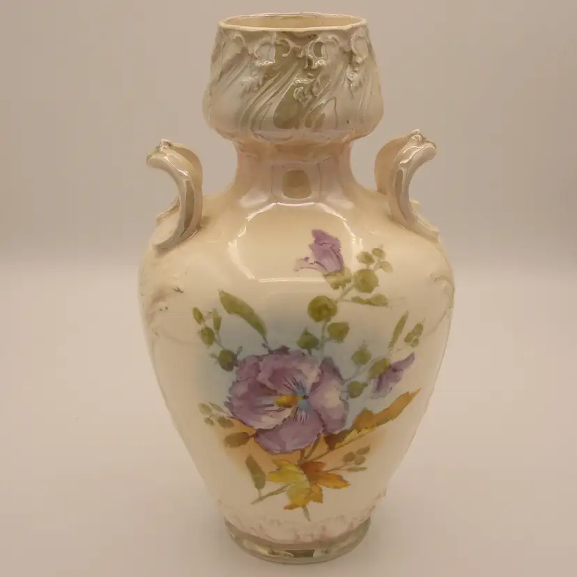 From Royal Bonn in Germany, a fine china vase in excellent condition. Decorated with pansies on front and back panels in purple, white and yellow with greenery and brownish leaves.