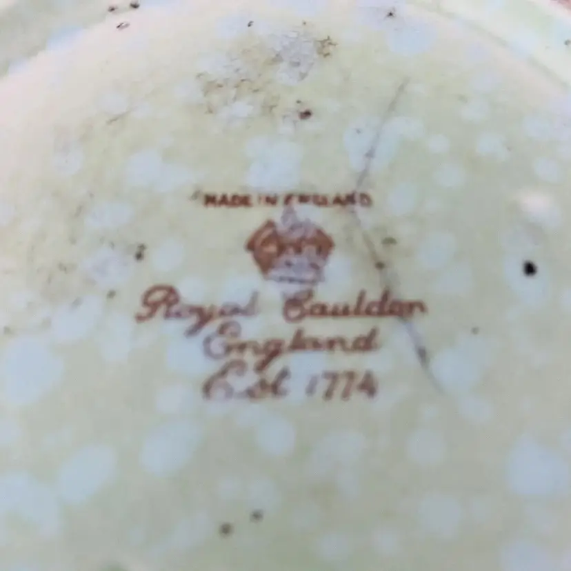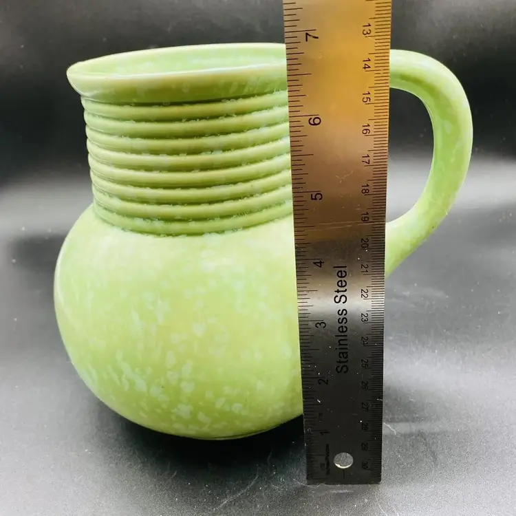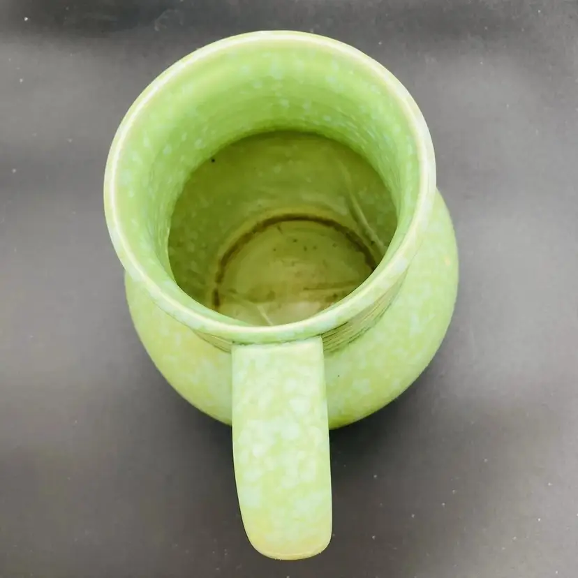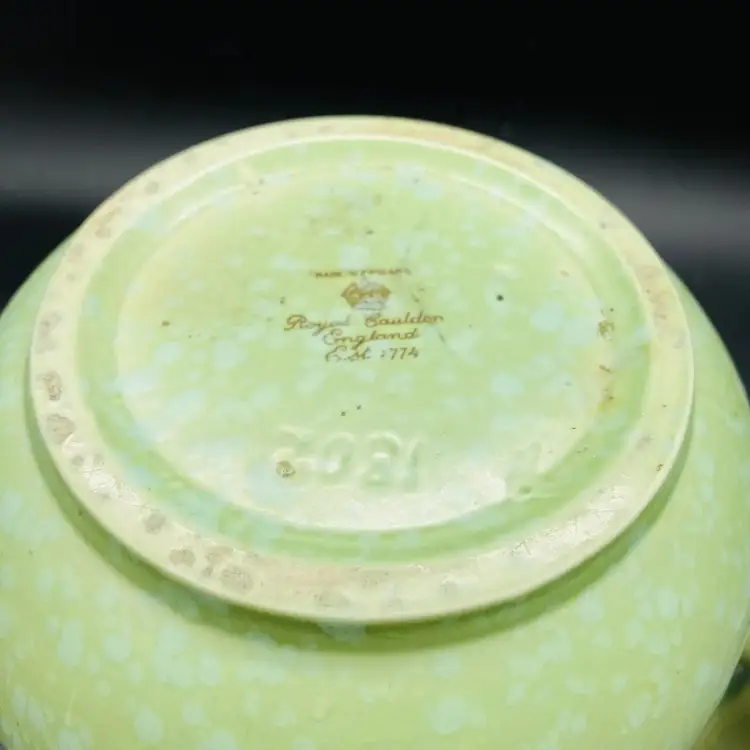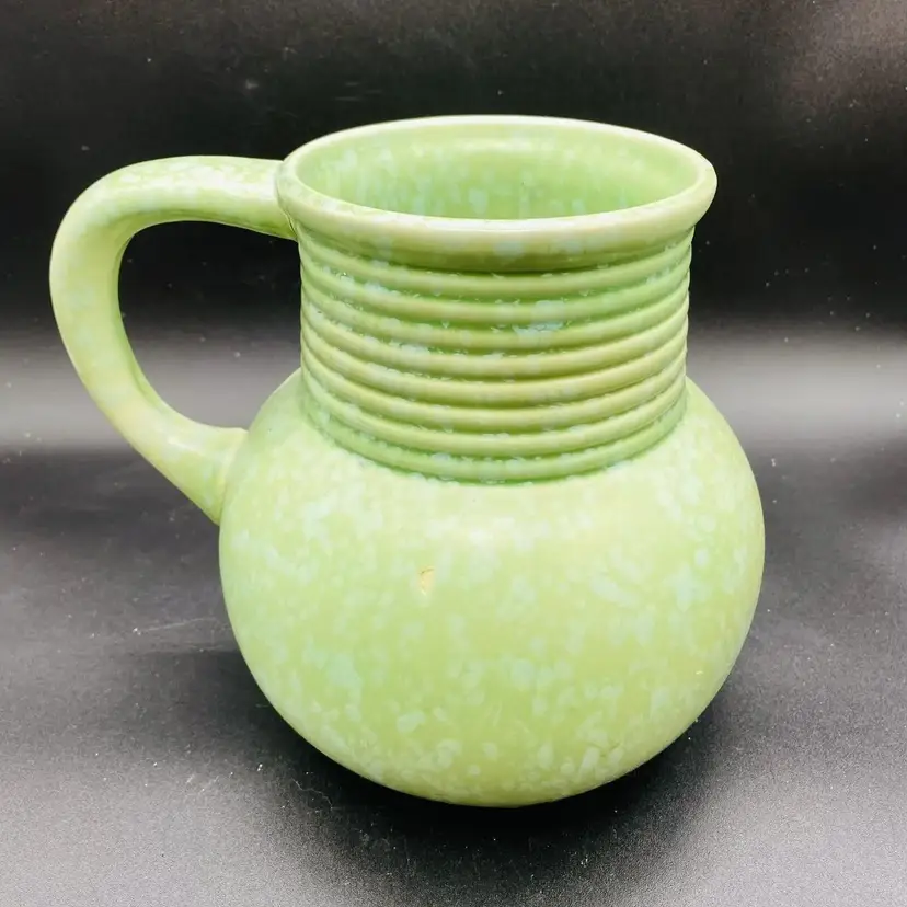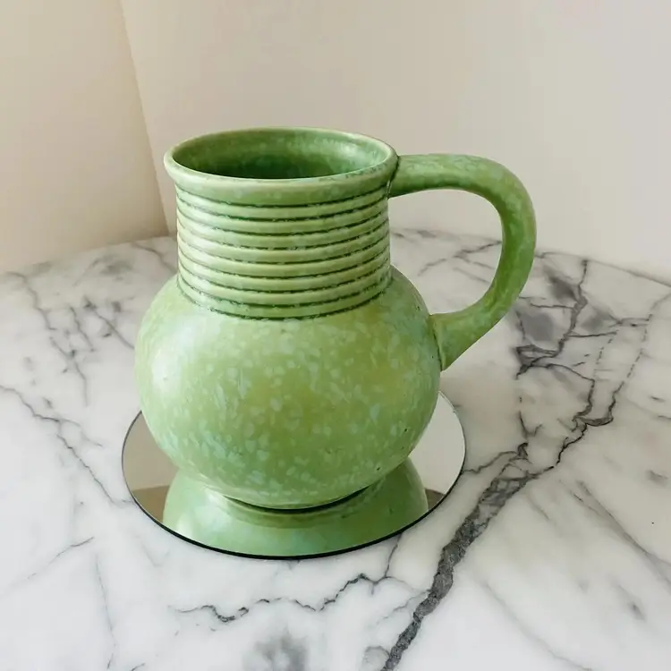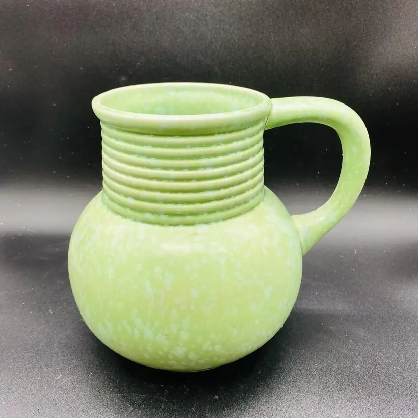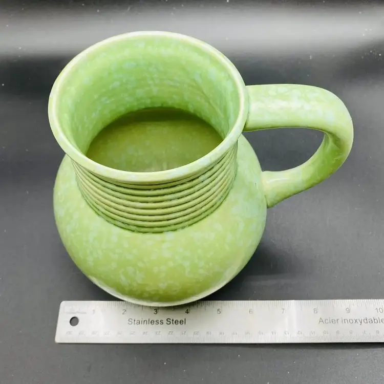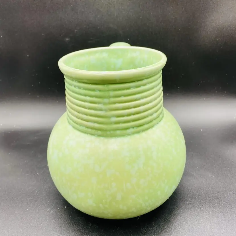 Royal Cauldon pottery piece is a versatile addition to any collection. With a green speckled hue and art pottery production technique, this 6.5 inch planter, carafe, or vase features unique handle and horizontal ribs that add character to its design. Made in England, this piece is crafted from durable pottery material and is sure to impress. Perfect for use as a statement piece or for displaying your favourite flowers, this Royal Cauldon piece is a must-have for pottery enthusiasts. Its timeless design and quality craftsmanship make it a valuable addition to any home decor.