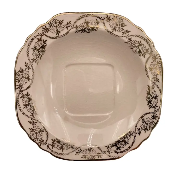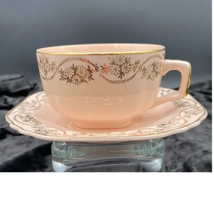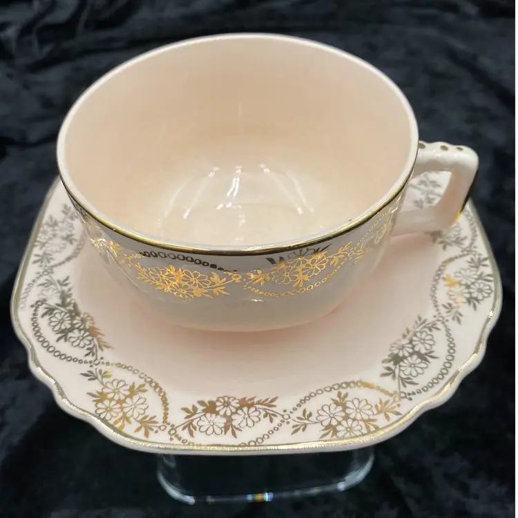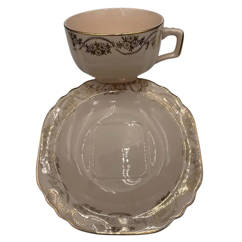 This beautiful tea cup and saucer set from Royal China's Pink Gold Krest collection is a vintage gem. The intricate filigree chain weaving between floral bouquets are all presented in 22K gold gilt and continues to be vibrant. The set includes a soft square tea cup with a square base sitting atop a matching soft square saucer, both finished with a glossy touch. The set is perfect for all occasions and is a great addition to any collection. Made in the United States in the mid-20th century, this two-piece set is a lovely find for porcelain and teacup collectors. The set weighs 9.1 ounces and is an excellent example of Royal China's quality and style.
