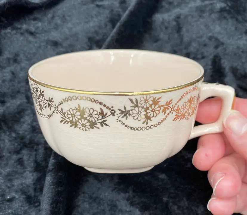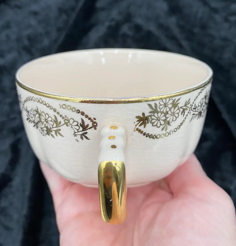 The teacup and saucer are in very good used condition. There is one small flea bite on the edge of the cup. The gold gilt is completely intact and vibrant. There is crazing due to age and a little wear on the base of the teacup. Please see the pictures for a complete sense of the condition. Thank you!