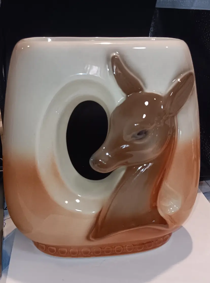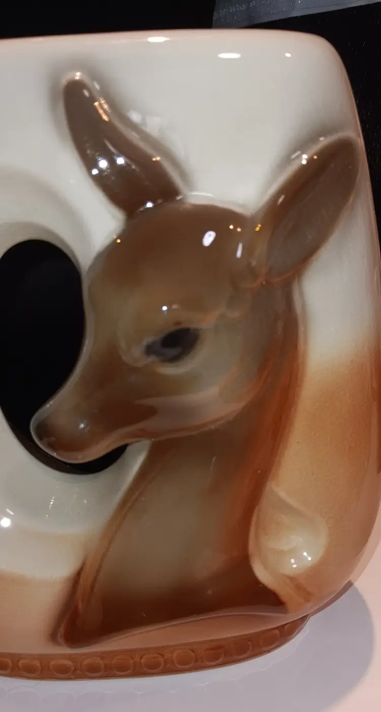 Gorgeous vintage piece of pottery. The vase is two sided. The cutest deer on the front. Measuring 7.5" tall 6.5" wide 3" deep. Excellent condition no chips or cracks.