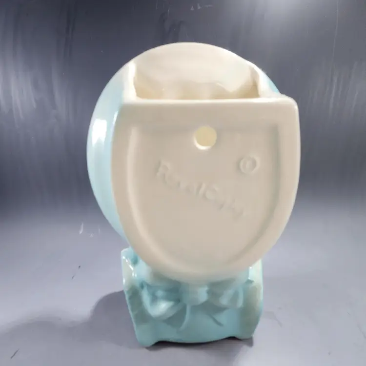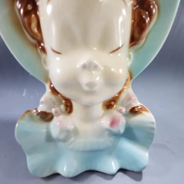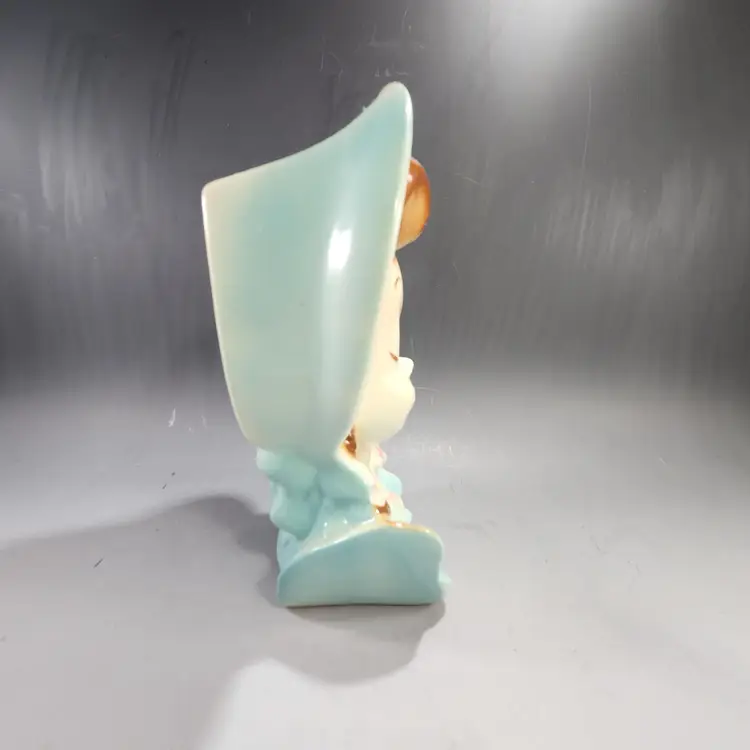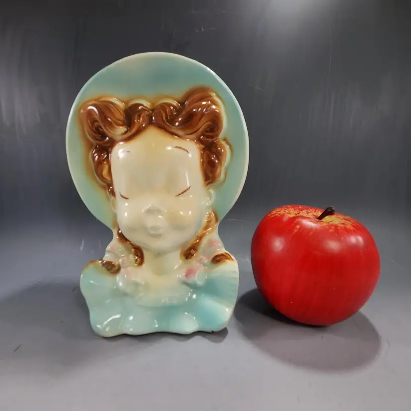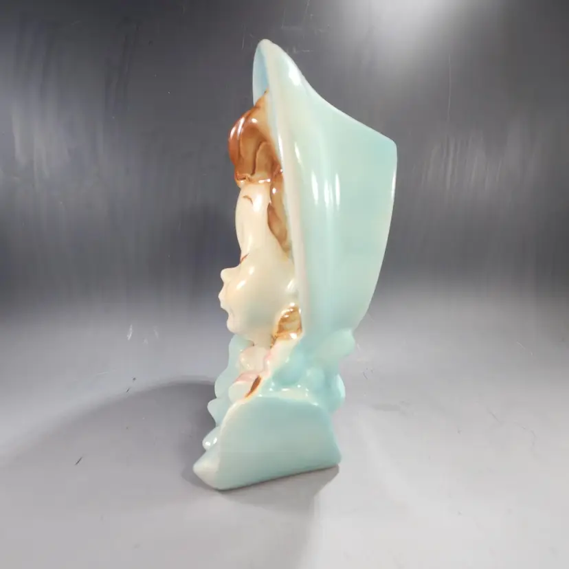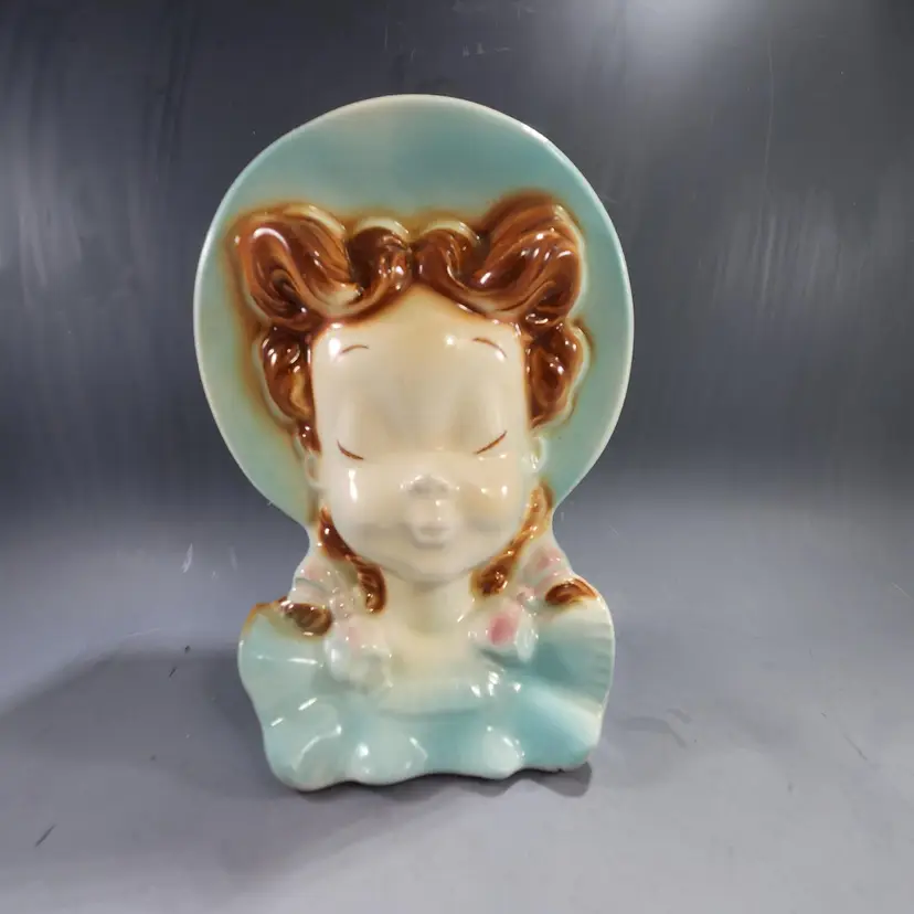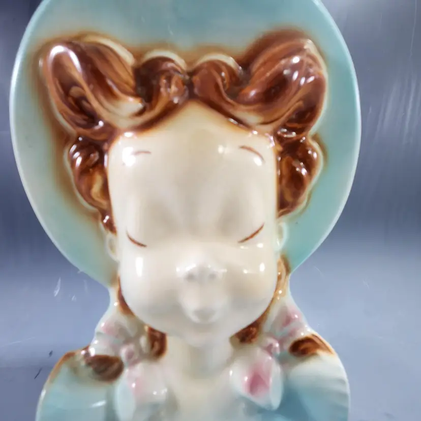 Sweet Royal Copley head vase / wall pocket. Little girl in aqua dress & bonnet, she would be adorable in a nursery or little girls room. She sits or hangs, use on the table as a retro pen/pencil holder, for make up or paint brushes, etc. She has an all over glossy finish. I have just purchased a large collection of head vases so please check my other listings.