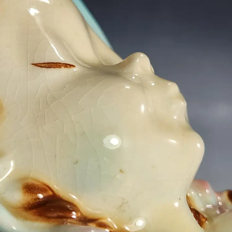 Condition: I am not seeing any chips or cracks but the entire piece is crazed. Imo it is not very noticeable unless you have her under strong light. She also has a dark mark bottom right edge, again not very noticeable as most of it is under the edge of the piece.