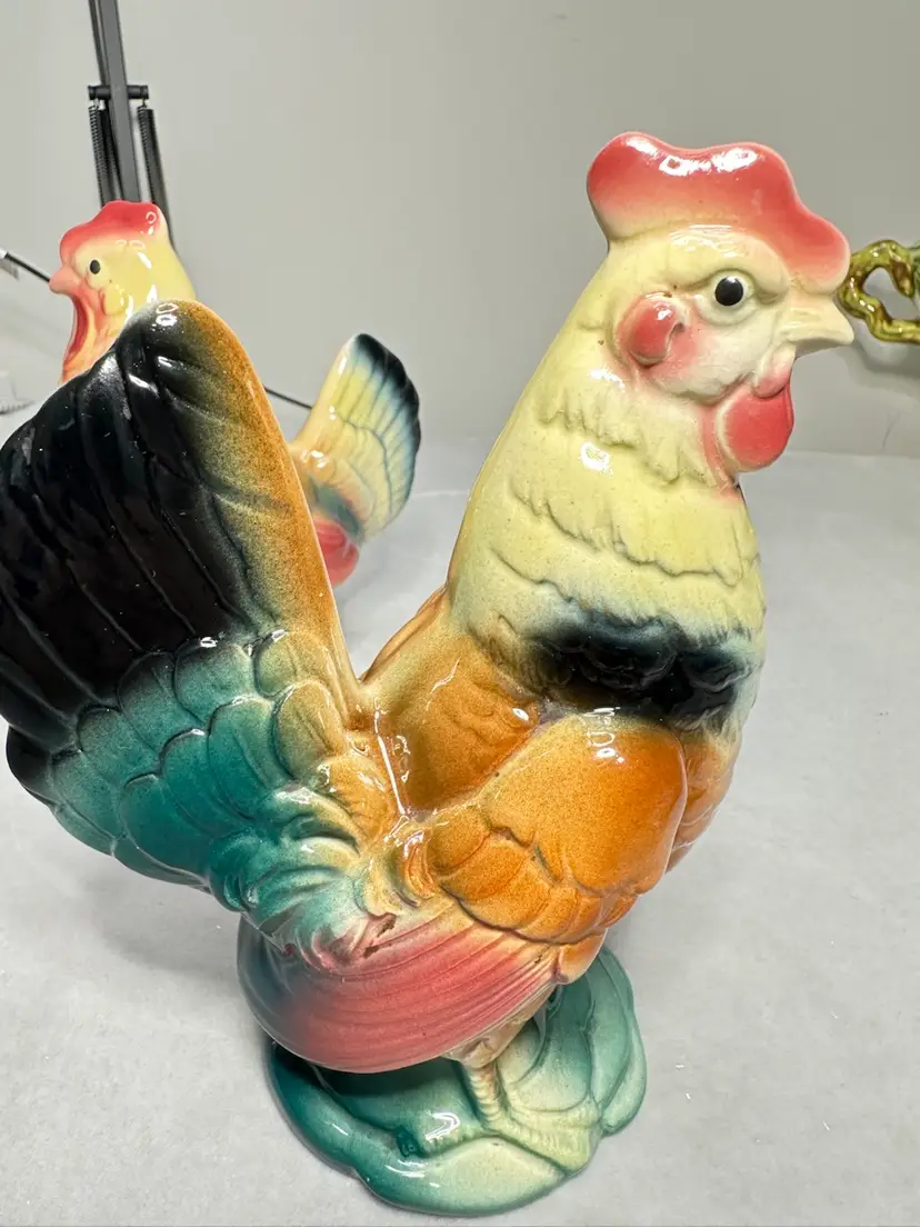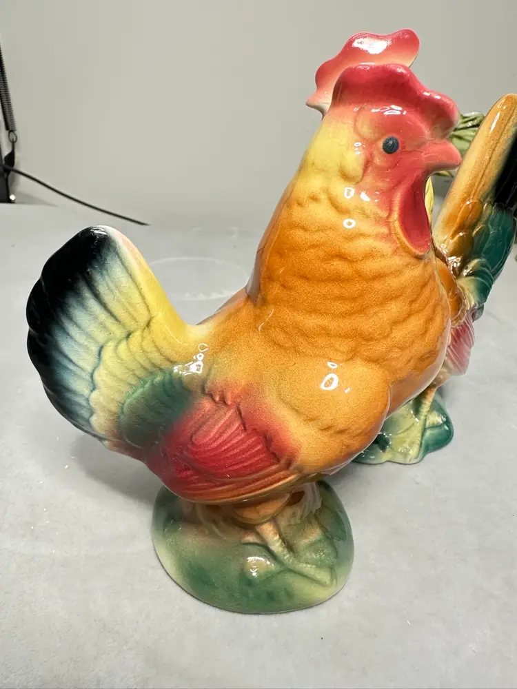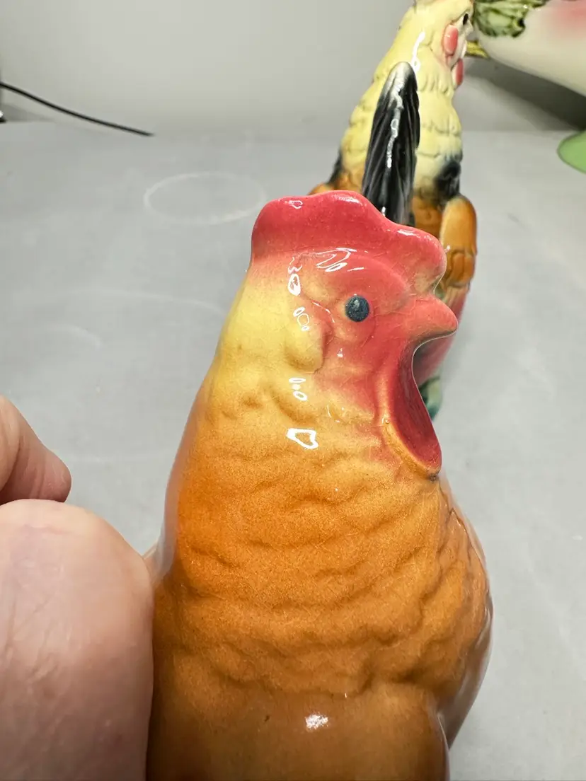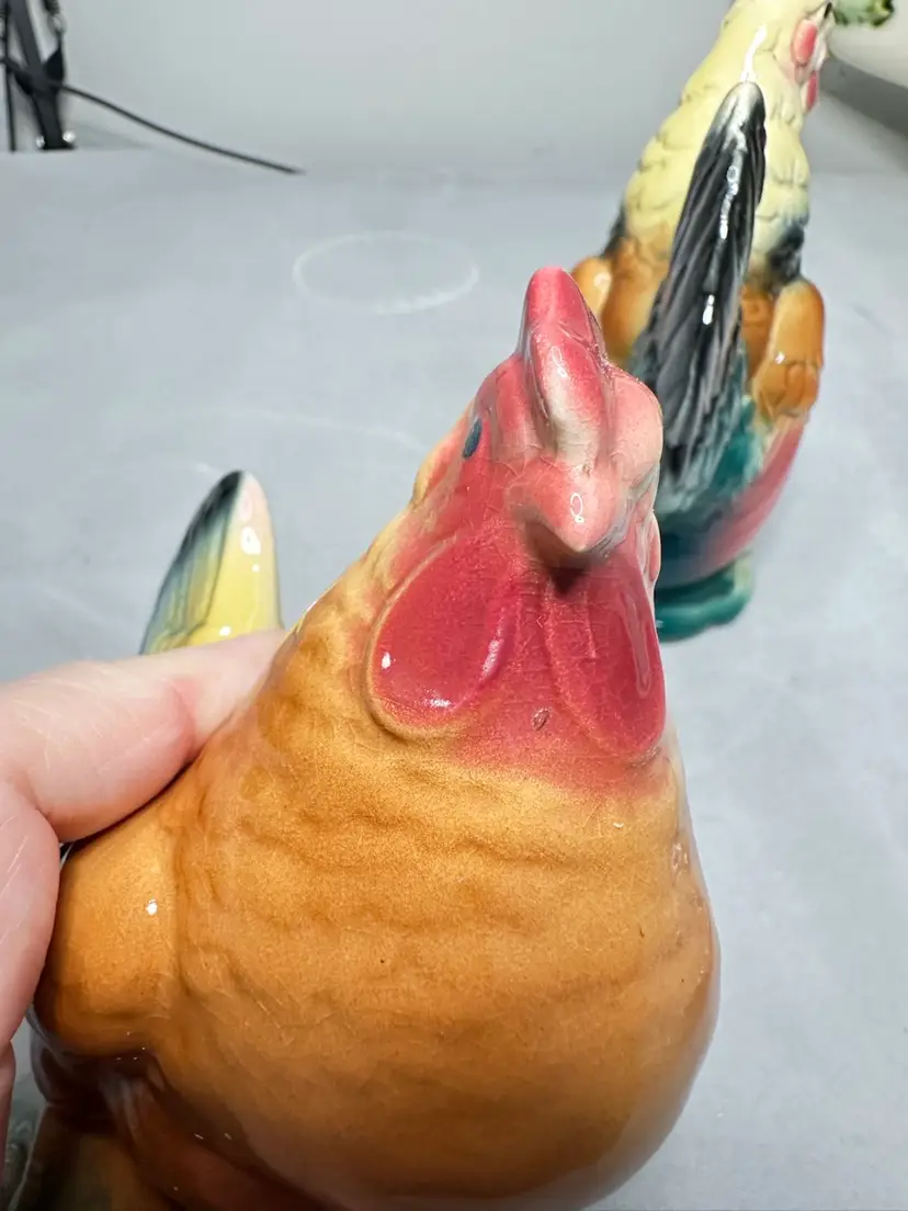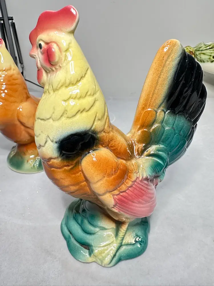 These are a pair of 6 to 6.5 inch size rooster and hen. bother are in excellent condition. The hen is 6 inches and the rooster is 6.5 inches tall. No chips or cracks.