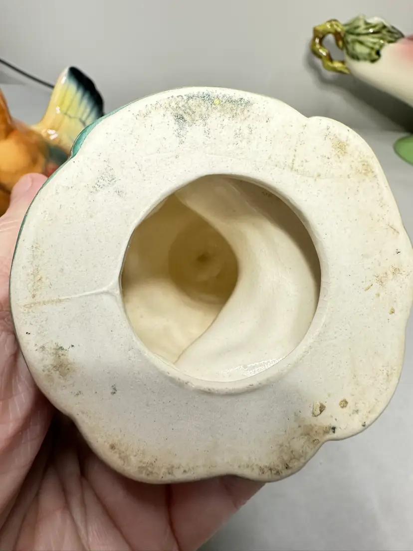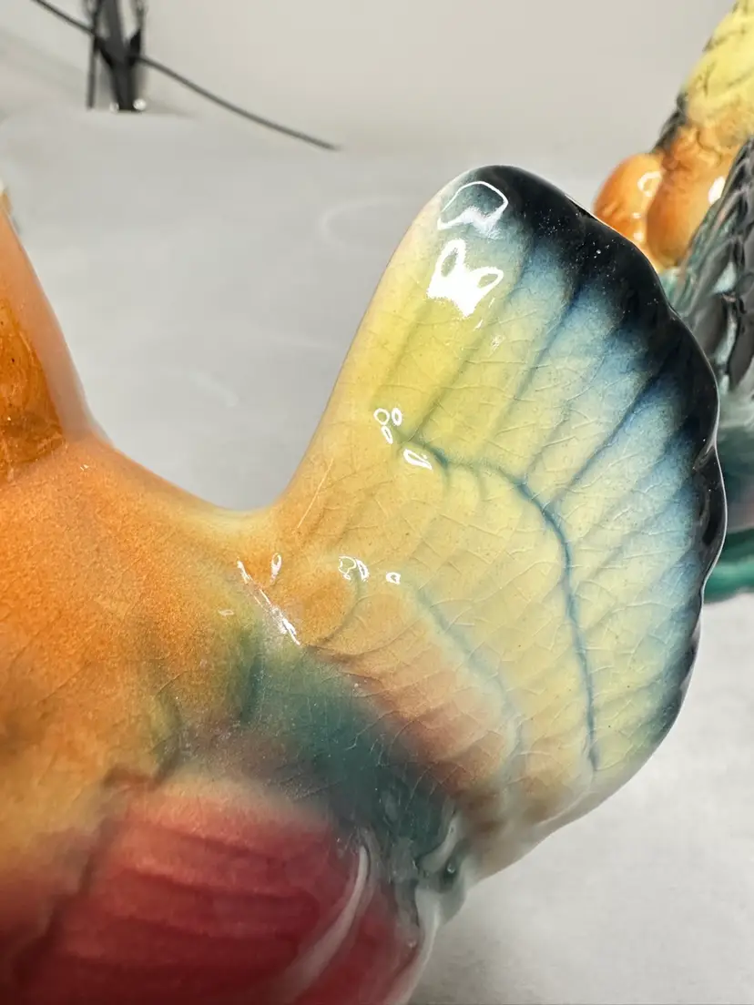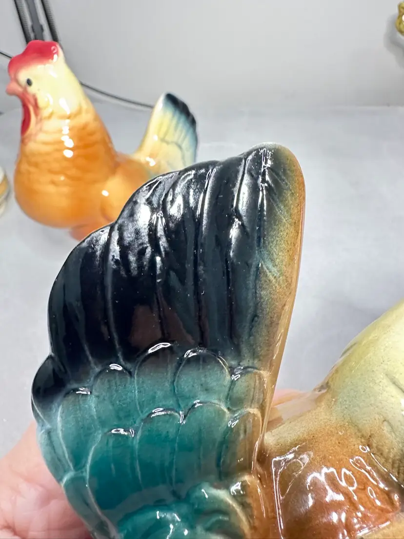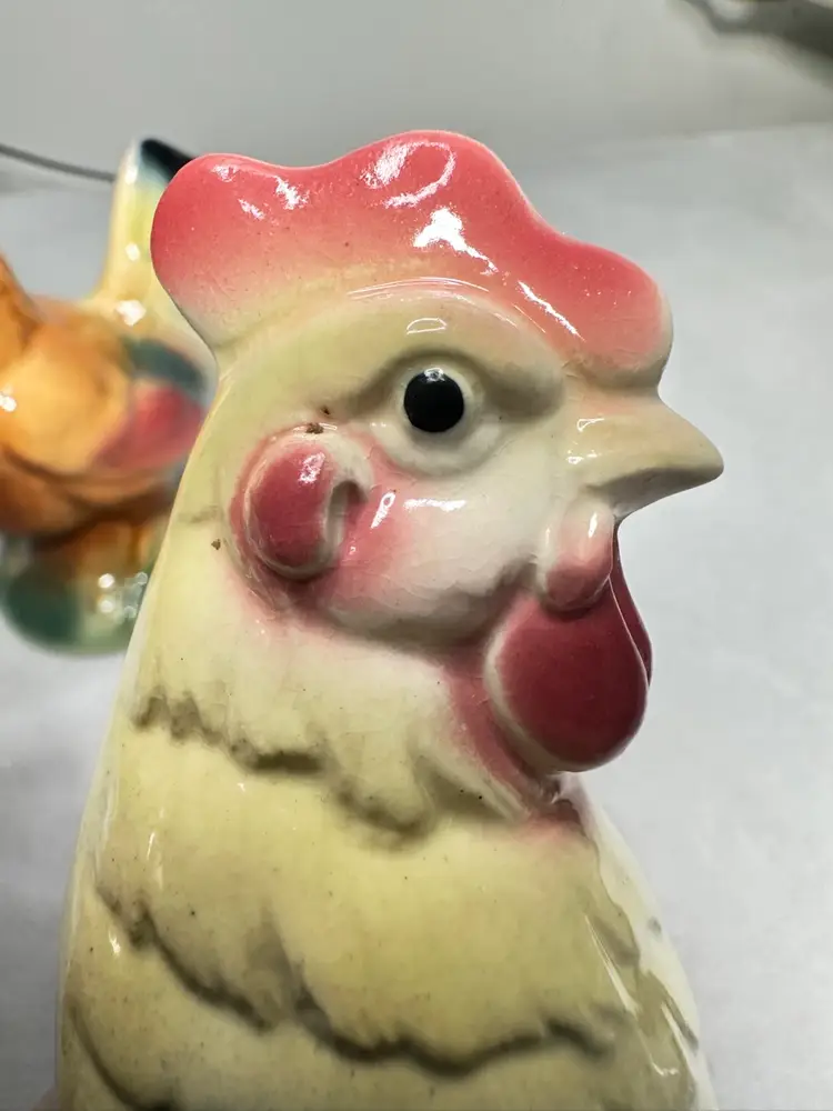 These are a pair of 6 to 6.5 inch size rooster and hen. bother are in excellent condition. The hen is 6 inches and the rooster is 6.5 inches tall. No chips or cracks.