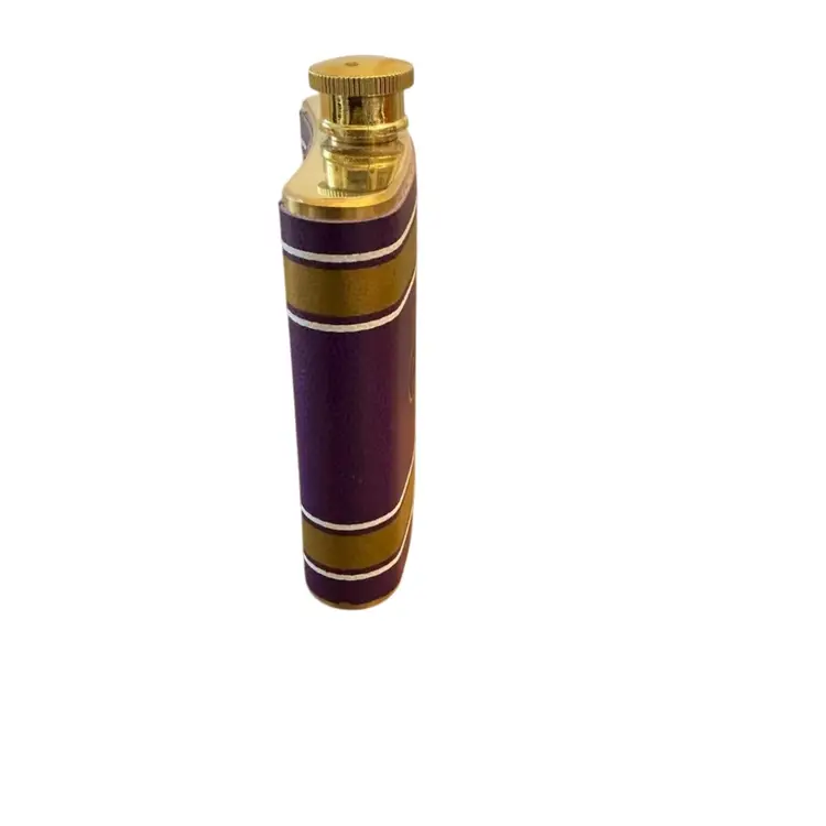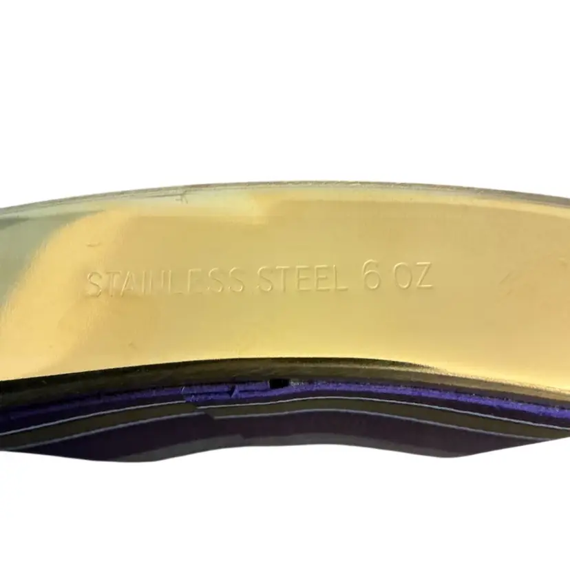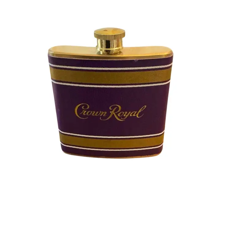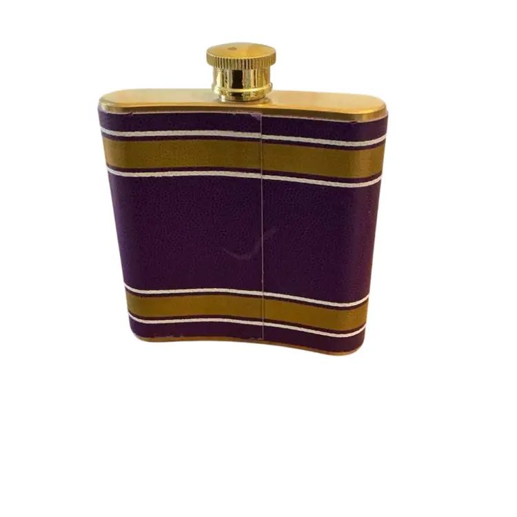 Stainless steel leather wrapped flask to take the chill away on those cold winter days. Of course it will be shipped empty. Purple and gold color if those match your favorite sports team. 4” by 4.”