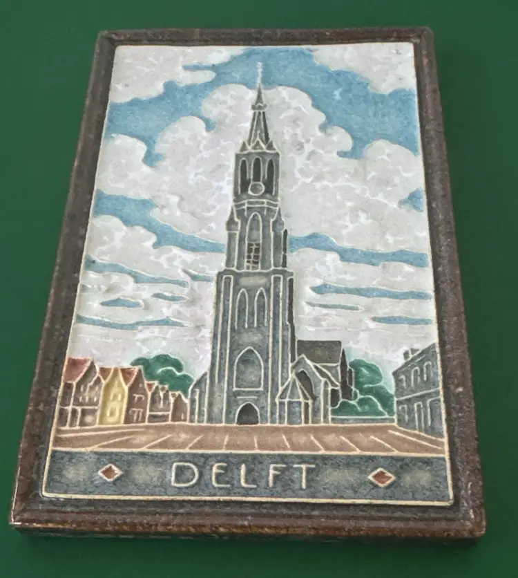 Royal Delft (De Porceleyne Fles) cloisonné tile featuring the Nieuwe Kerk (New Church) in Delft, Netherlands 5 7/8” by 4” Beautiful Delft ceramic wall art featuring a church scene. Intricate details with blue, white, and brown colors. The Nieuwe Kerk tower is the second tallest in the Netherlands, standing at 108.75 meters. It is the traditional burial site for the Dutch royal family, including William of Orange. The tile likely dates from the mid-20th century, as these were produced between 1939 and 1983. Excellent condition with no breaks or chips (2714263)