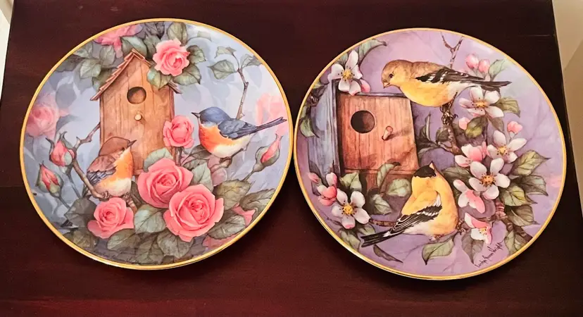Both plates are in like new condition and display beautifully, with soft pastel backgrounds, detailed bird illustrations, and elegant gold gilt rims.