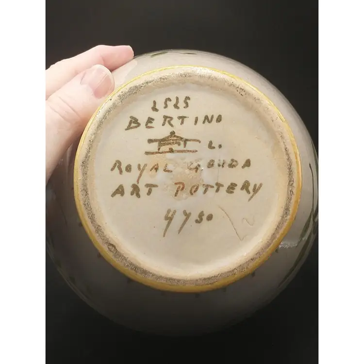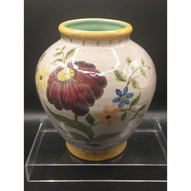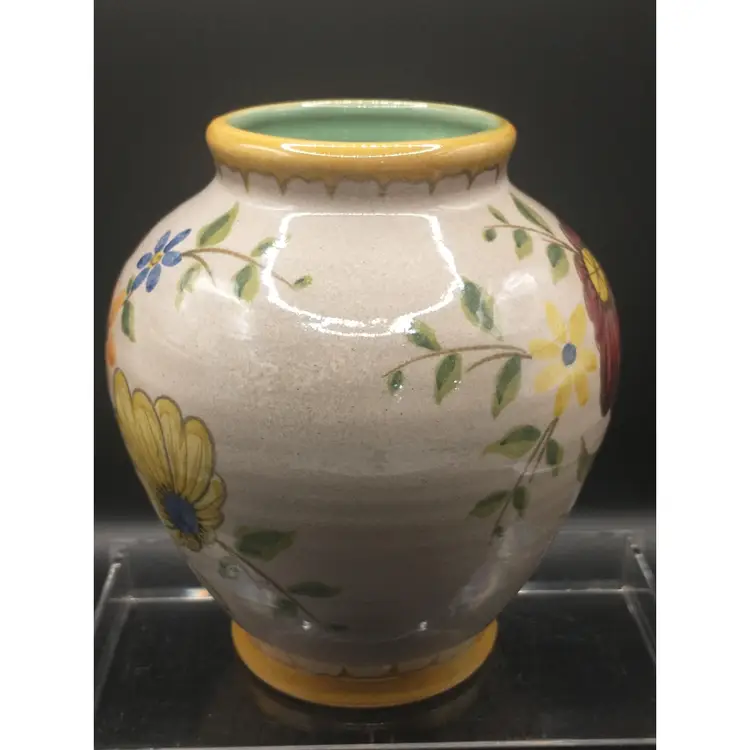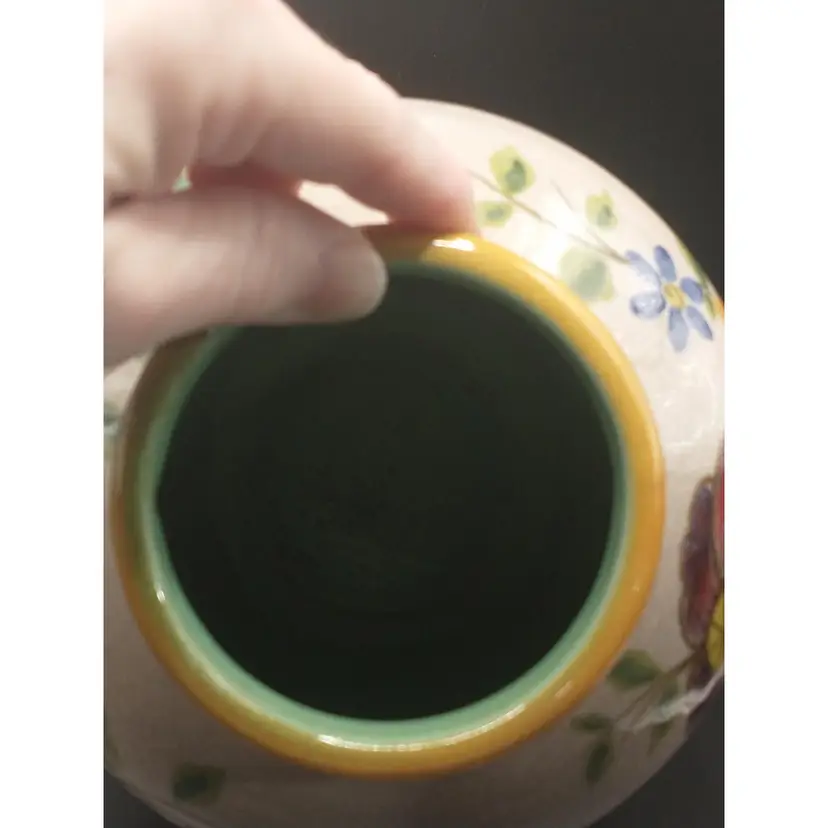 This beautiful Royal Gouda pottery vase is signed by Bertino and made in Holland. This 8" tall vase is hand painted with flowers, leaves, and vines and is glazed inside and outside. The base color is beige with green on the inside. There are no chips or cracks.