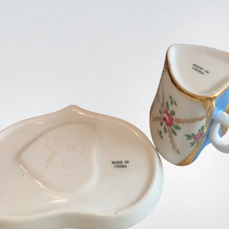 In perfect condition. Heart shaped teacup 2.5” tall. Saucer 5” x 4”. Pink flowers with gold embellishments.