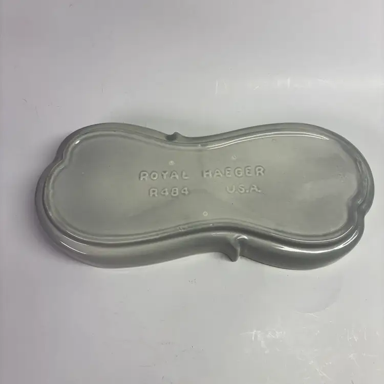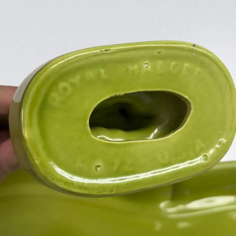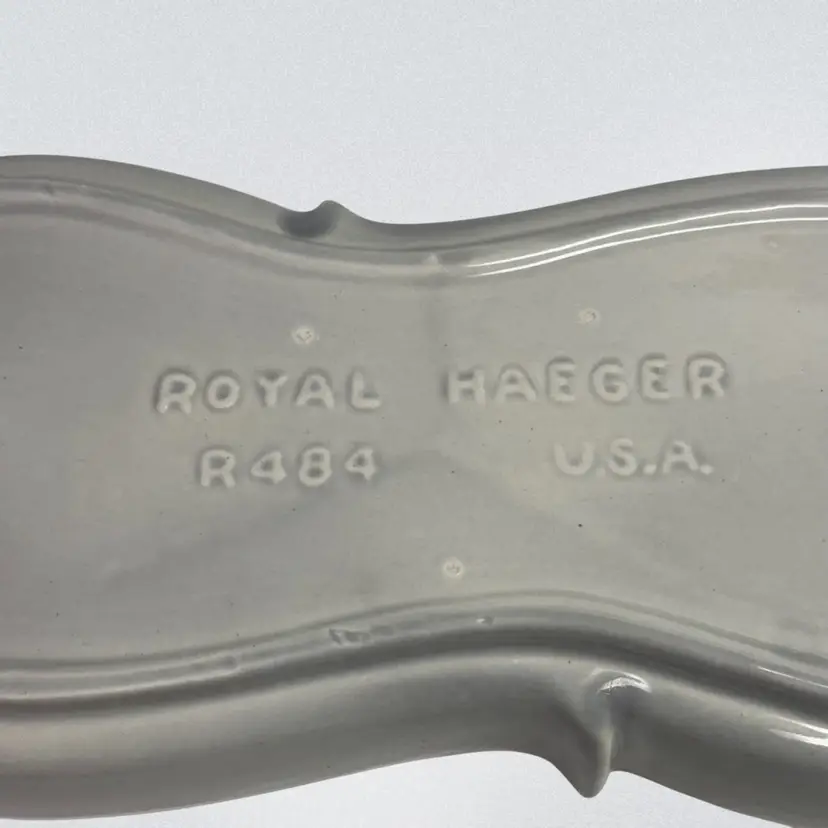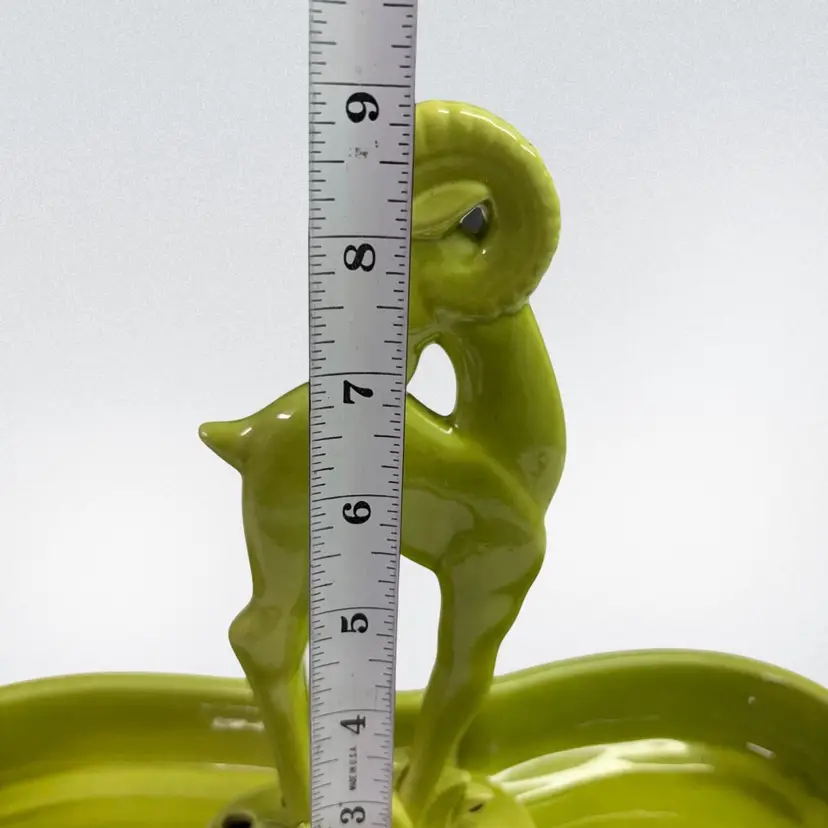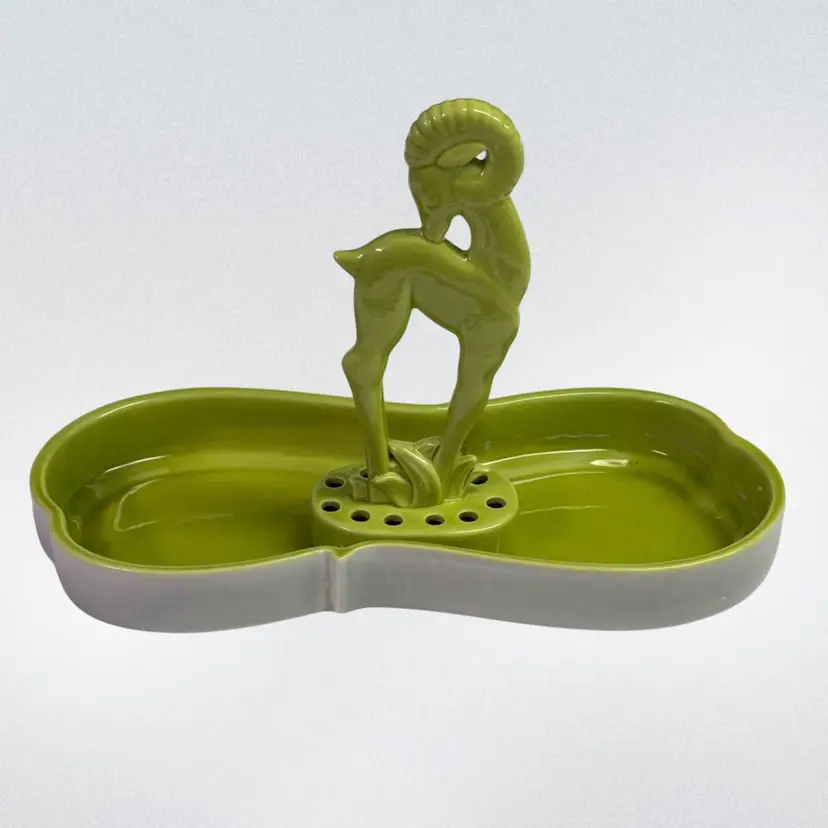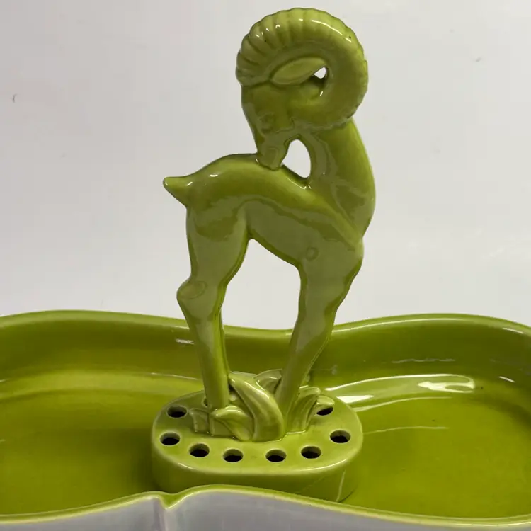 Royal Haeger console bowl marked R484 USA with pearl grey exterior and lime green interior, green gazelle flower frog marked Royal Haeger R72, introduced in 1938, very good condition. Bowl 14"L. Gazelle stands 9"H.