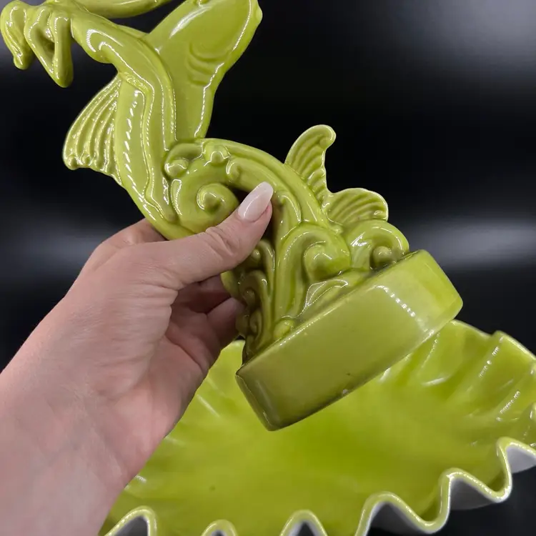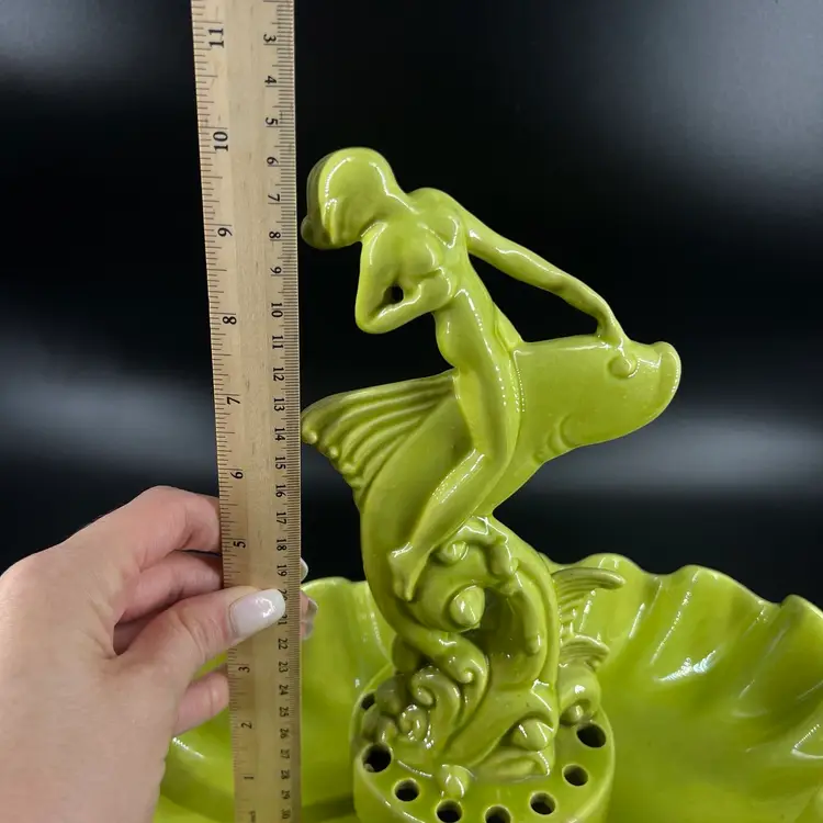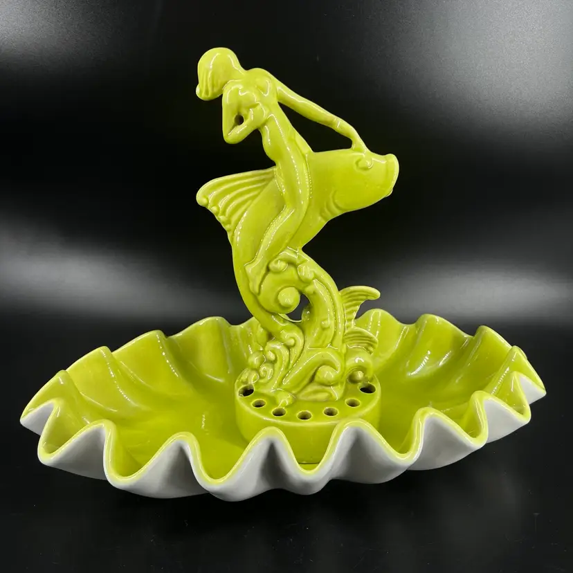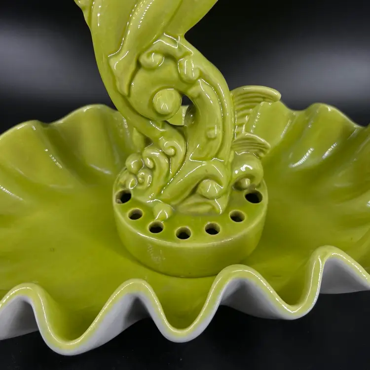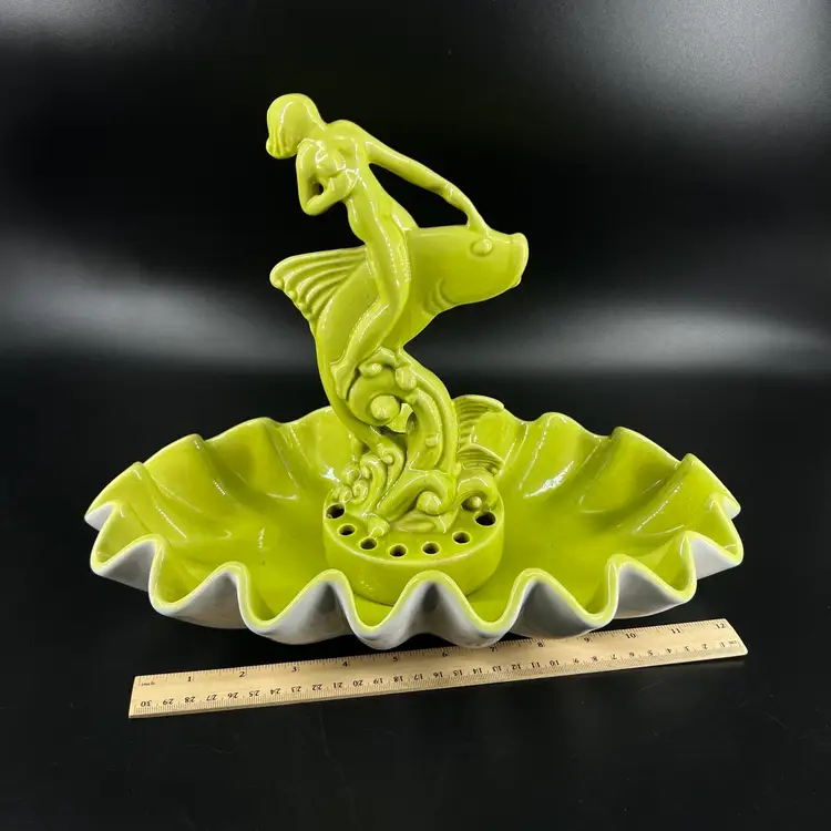 This bowl with floral frog is attributed to Royal Haeger. They are both a chartreuse green with the clam shell showing gray on the exterior. It measures approx 14” long and 10” tall. It is two pieces.