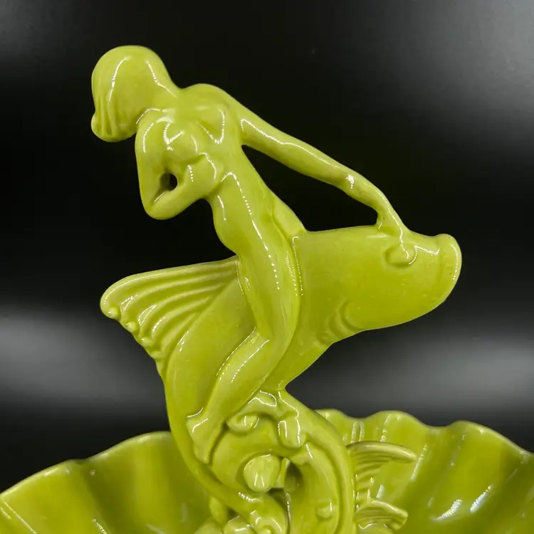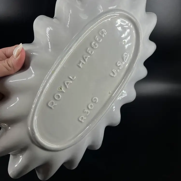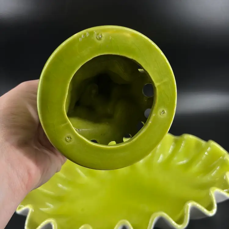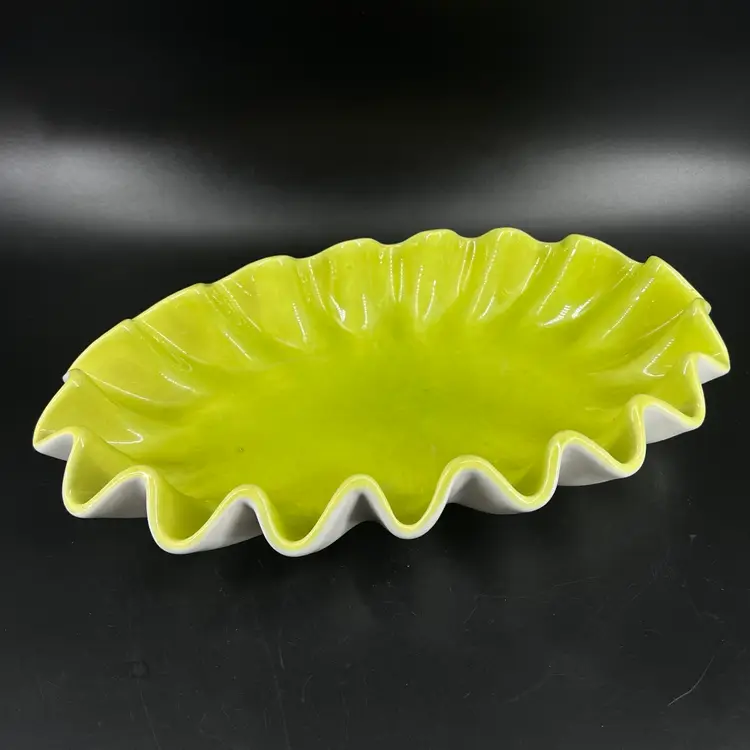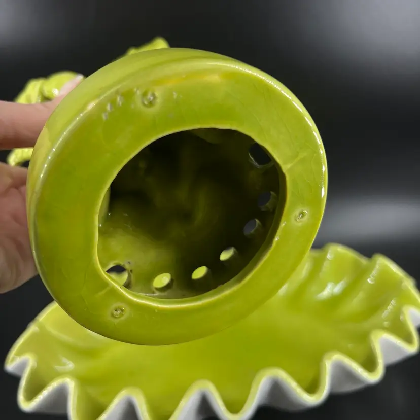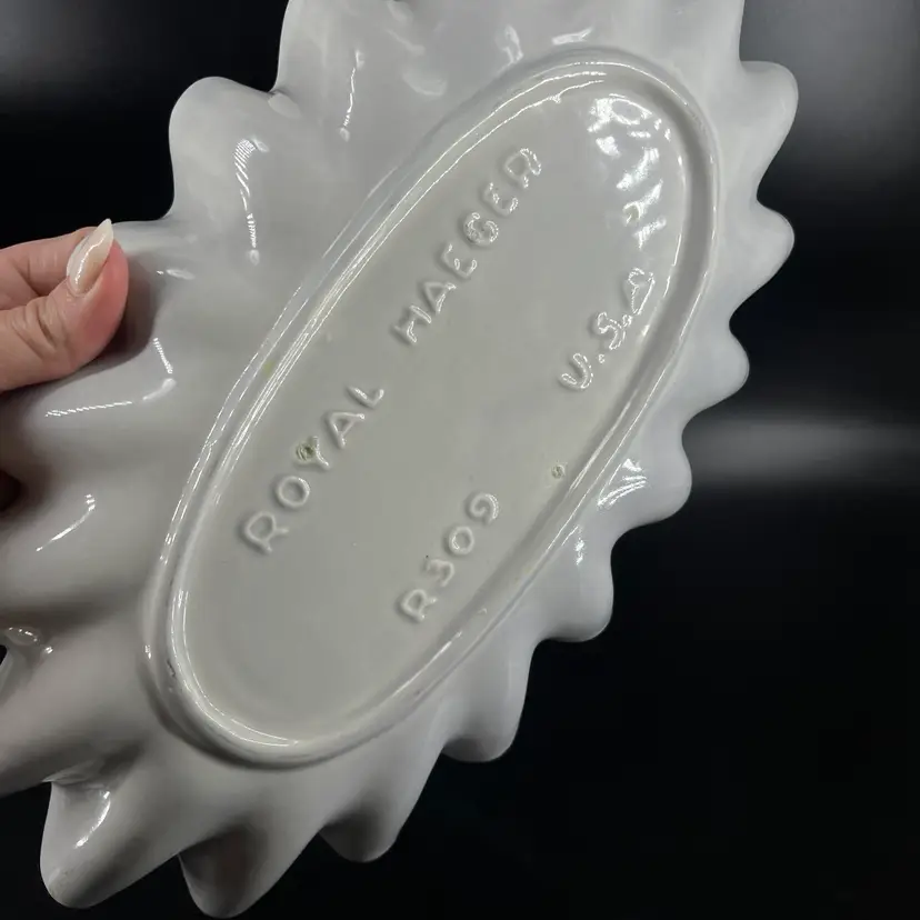 This bowl with floral frog is attributed to Royal Haeger. They are both a chartreuse green with the clam shell showing gray on the exterior. It measures approx 14” long and 10” tall. It is two pieces.