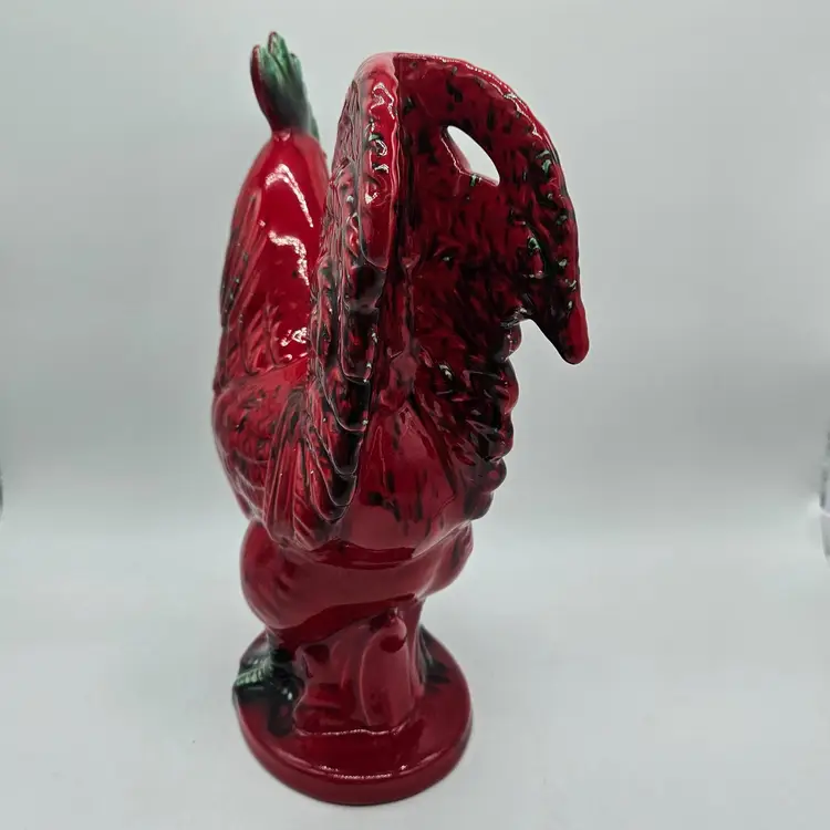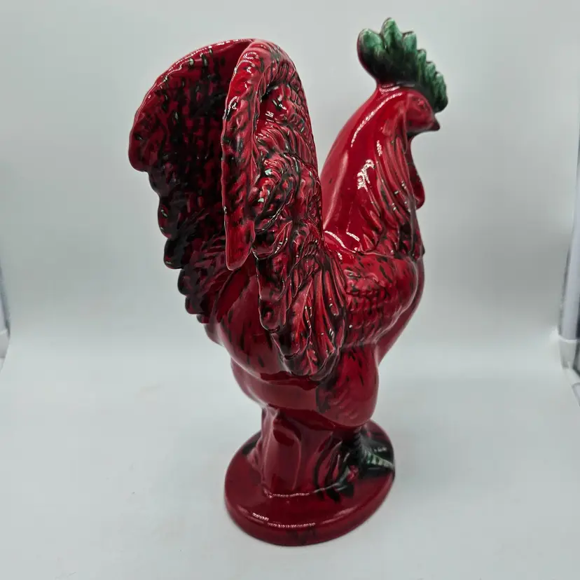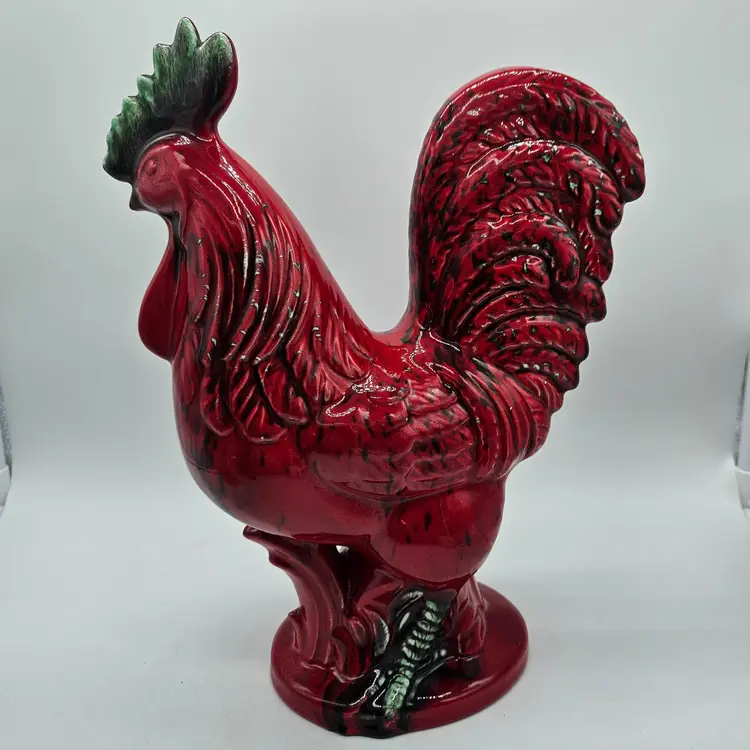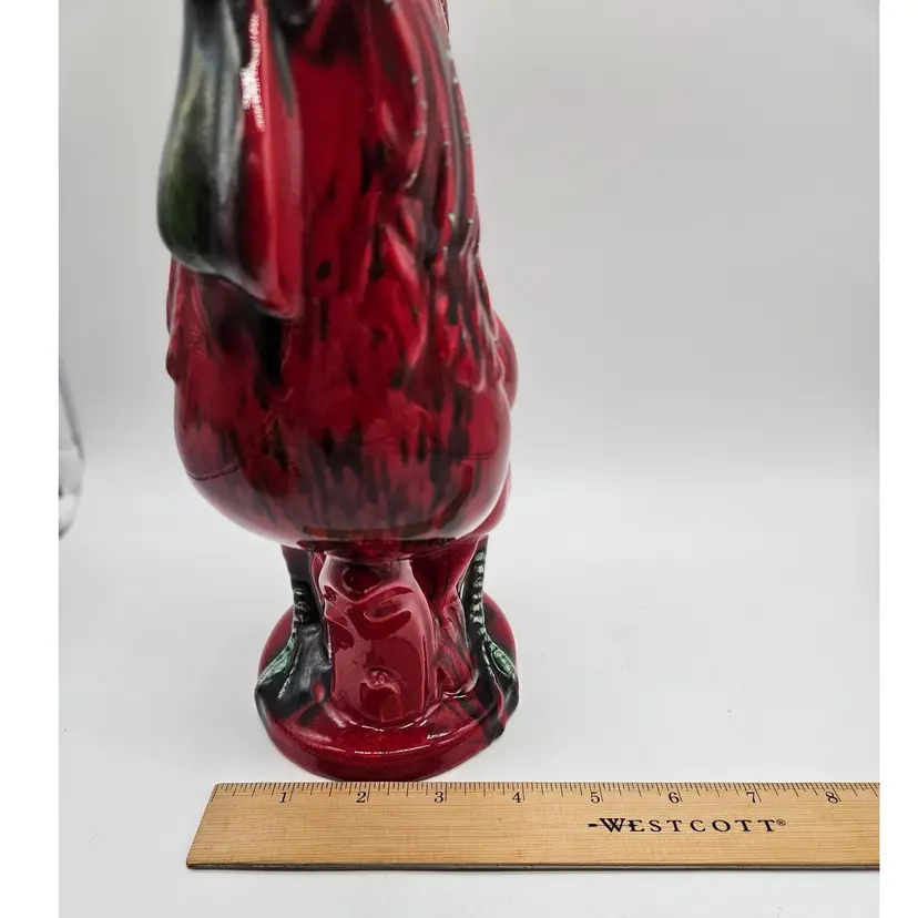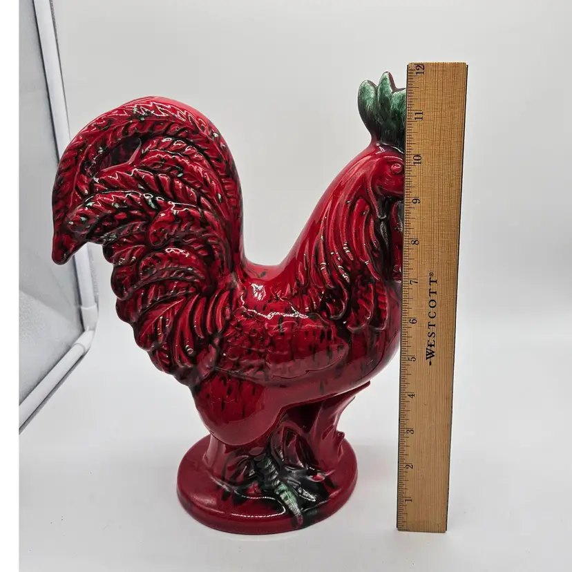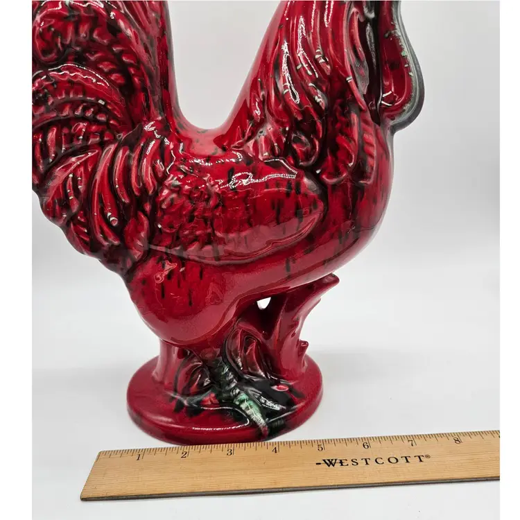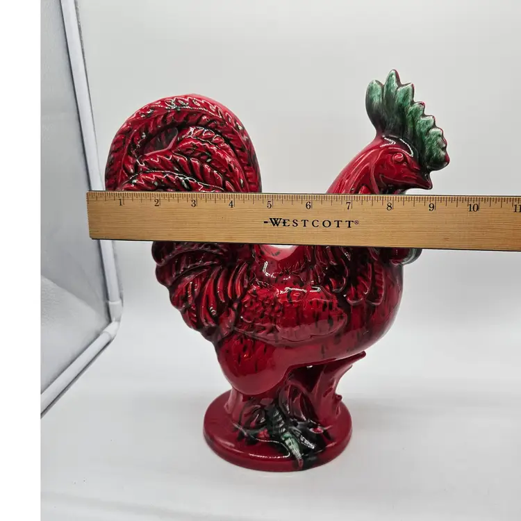 This Ceramic rooster stands approximately 12" tall and is approximately 9" wide. The base is approximately 5 1/2" x 4 1/4". The makers mark is imprinted on the bottom. It is in Good, Pre-owned condition, showing minimal wear from age and previous use. There is a chip in the paint on the backside, edge of the tail feather (seen in photo), that almost blends into the color. Mild crazing is seen in the glaze where the green comb is. There are no breaks, no cracks. See all photos of description