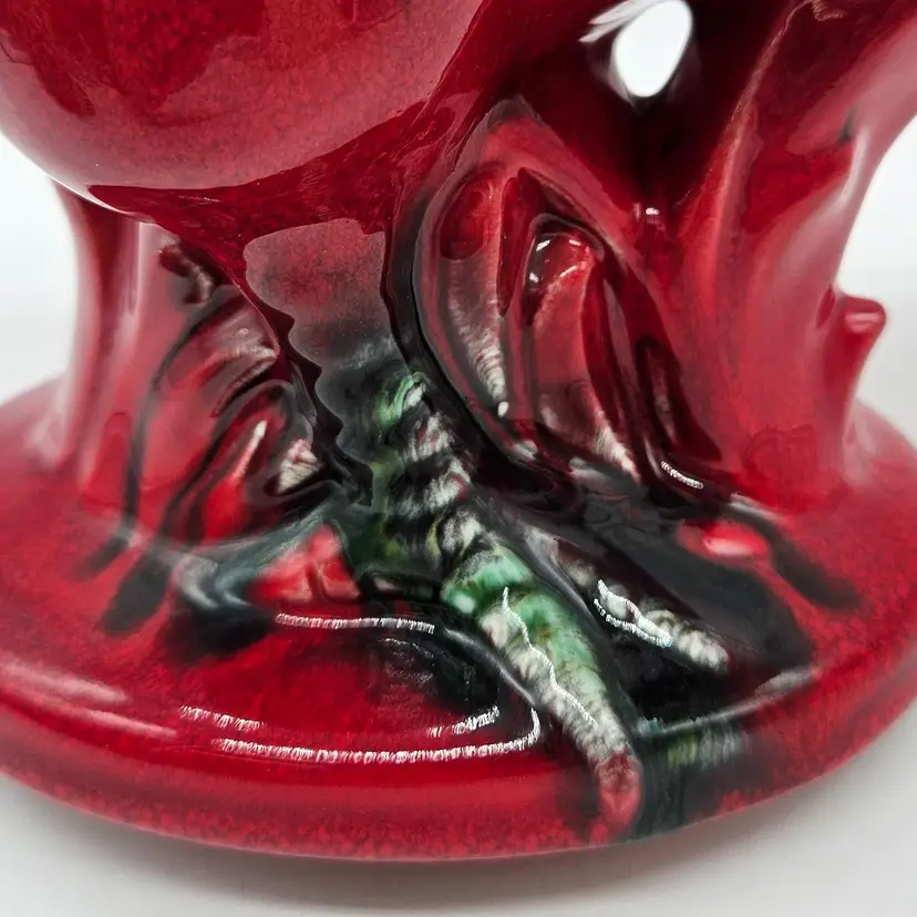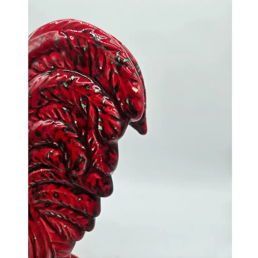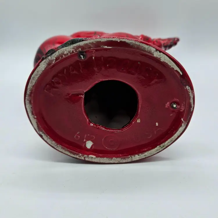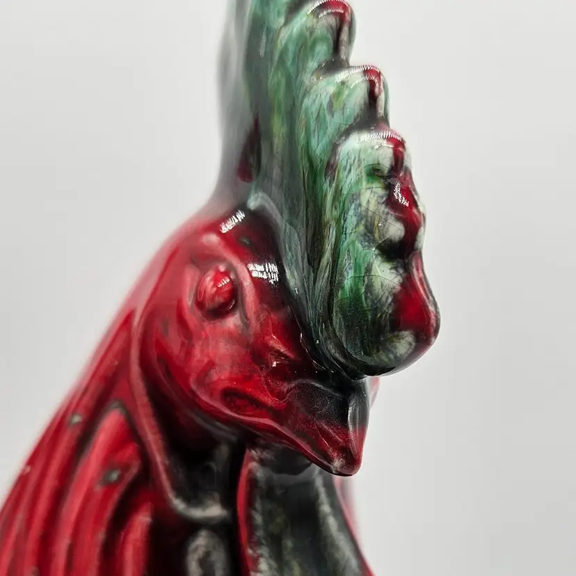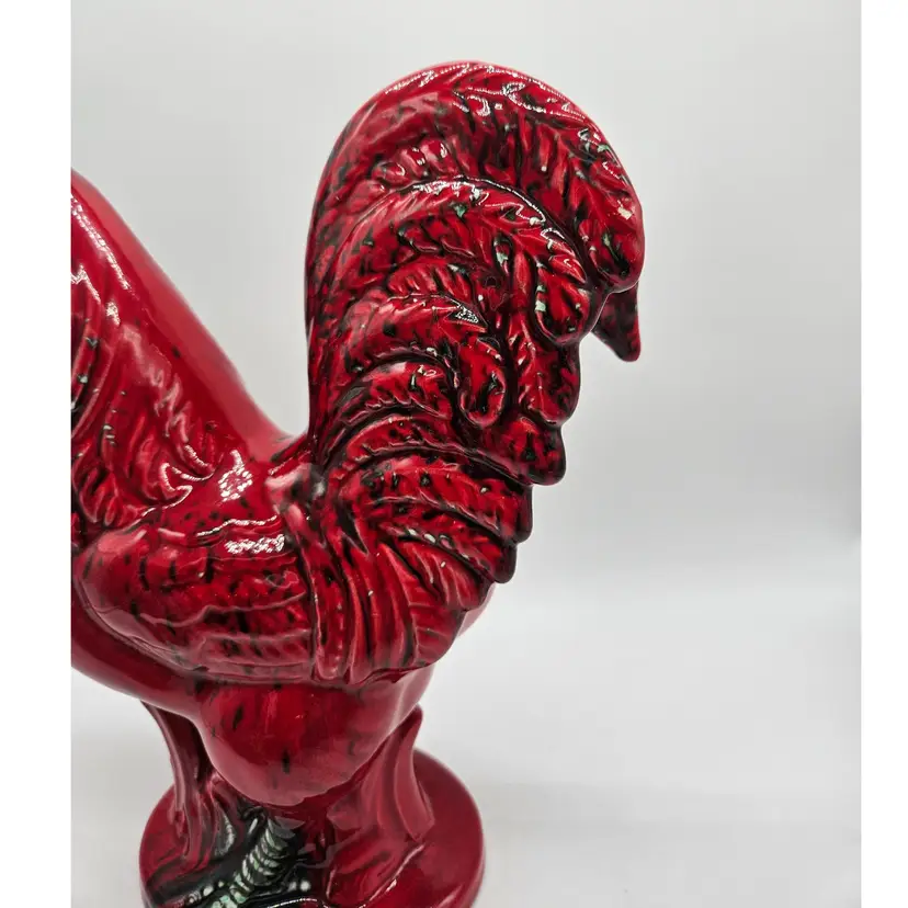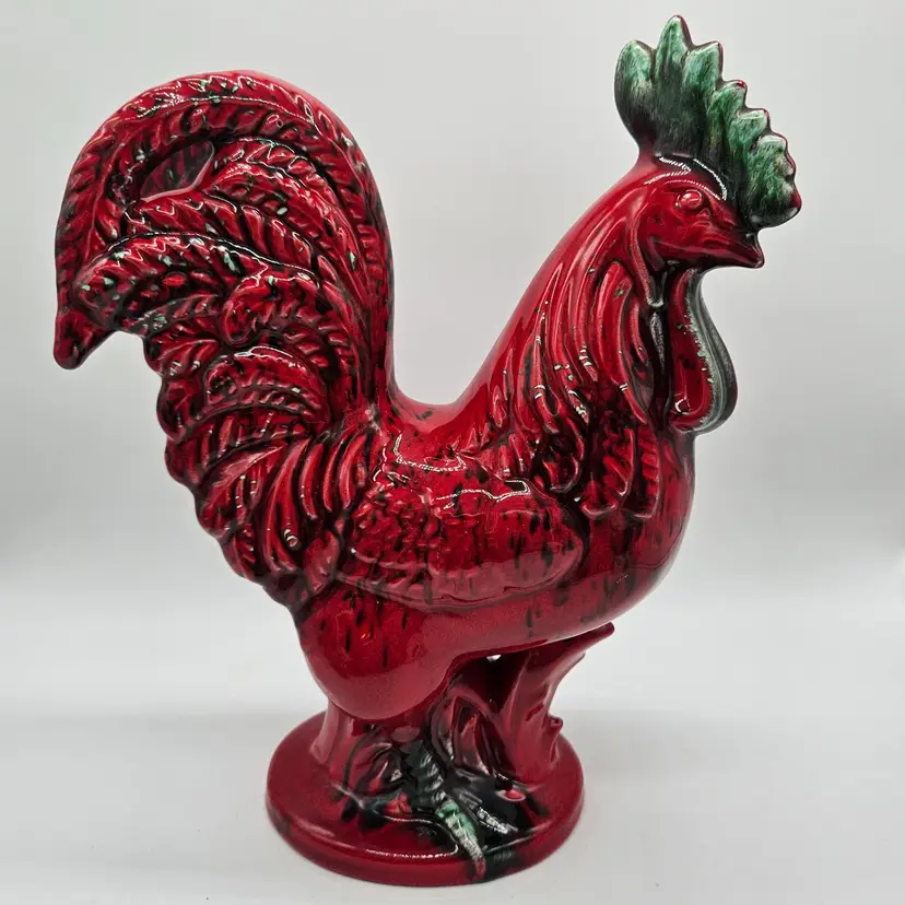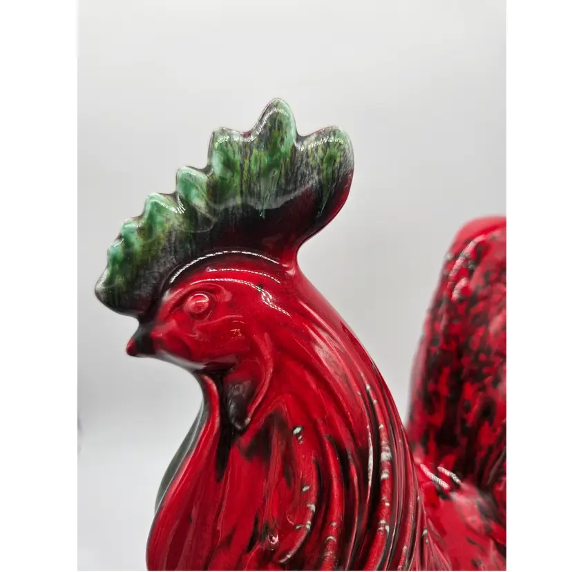This Ceramic rooster stands approximately 12" tall and is approximately 9" wide. The base is approximately 5 1/2" x 4 1/4". The makers mark is imprinted on the bottom. It is in Good, Pre-owned condition, showing minimal wear from age and previous use. There is a chip in the paint on the backside, edge of the tail feather (seen in photo), that almost blends into the color. Mild crazing is seen in the glaze where the green comb is. There are no breaks, no cracks. See all photos of description