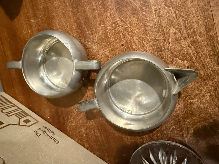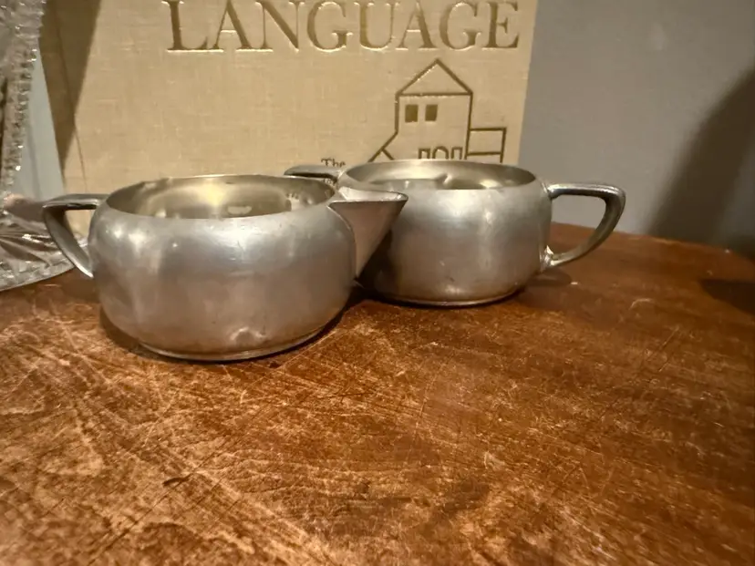 Vintage Royal Holland KMD Tiel Pewter Creamer and Sugar Bowl Set. This classic pre-owned set includes a creamer and a matching sugar bowl, crafted from high-quality pewter. Each piece showcases the elegant design typical of Royal Holland KMD Tiel, reflecting vintage European craftsmanship. Perfect for collectors or adding a touch of antique charm to your tea or coffee service. Excellent pre-owned condition with a lovely aged patina. No significant dents or damage, just the natural wear expected from a vintage item.