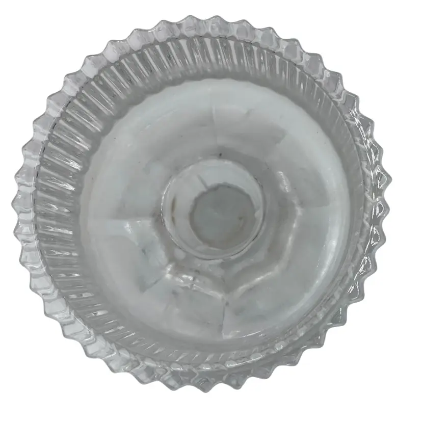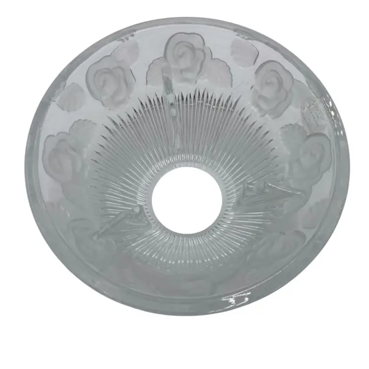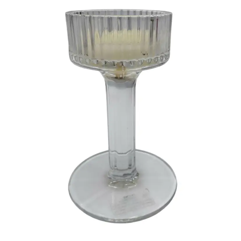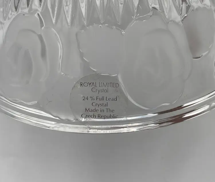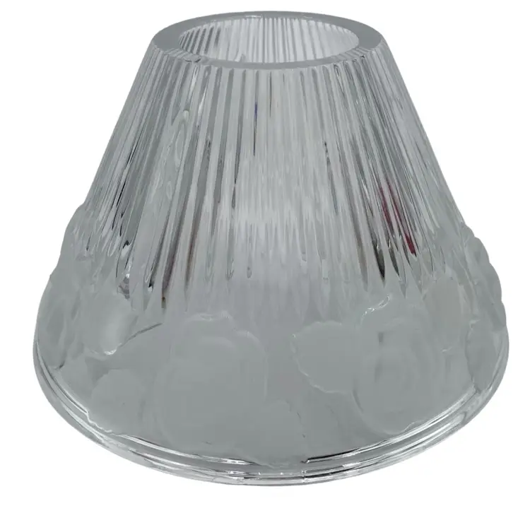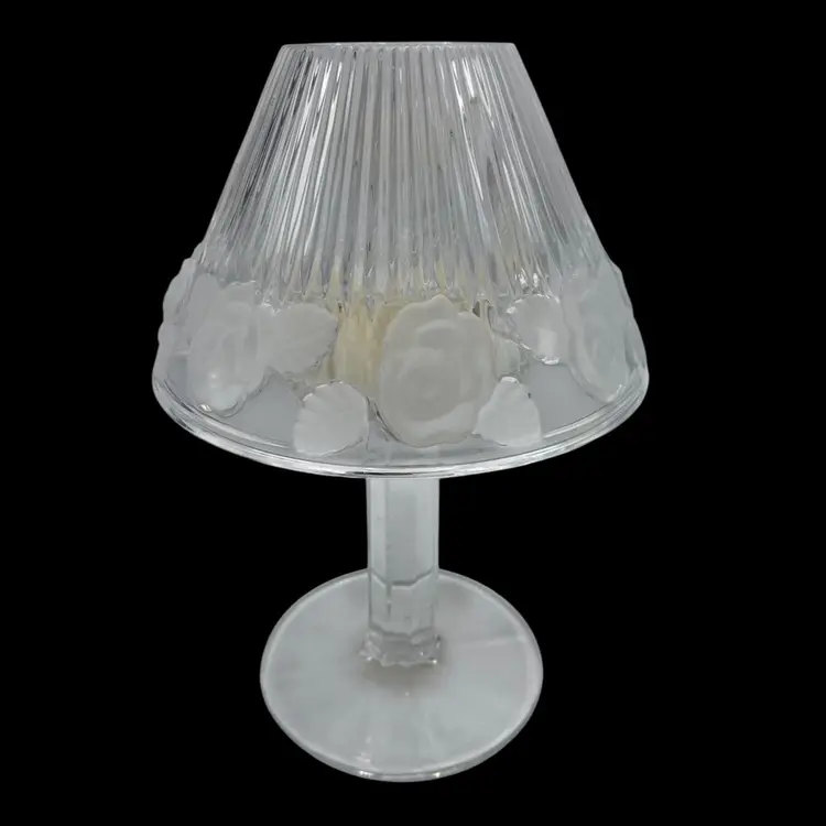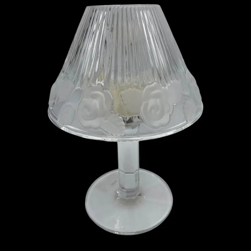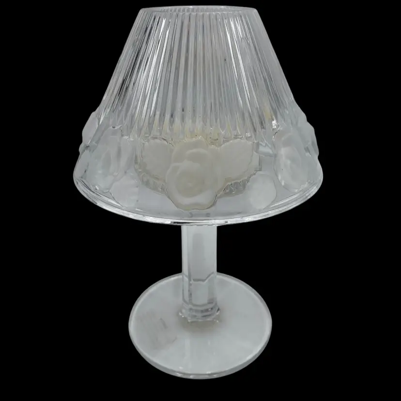 The Royal Limited 24% Lead Crystal Fairy Lamp is a beautifully crafted candle holder made of clear crystal, featuring a tightly-ribbed shade that has frosted roses circling the perimeter. The pedestal base also has ribs around the portion that holds the candle, with columns on the lower portion. Standing at 8.5 inches tall and 5.75 inches wide, this original piece from the Czech Republic is suitable for flameless or LED candles, mini pillar candles, and tea lights. Weighing 2 pounds and 3.9 ounces, this is a substantial piece of crystal!