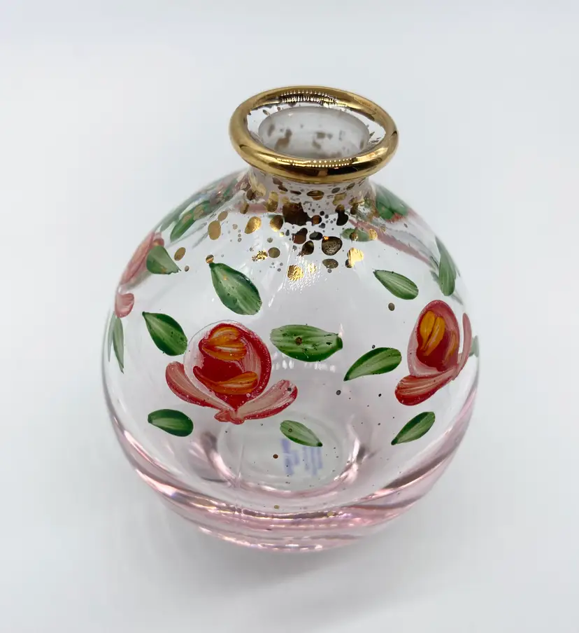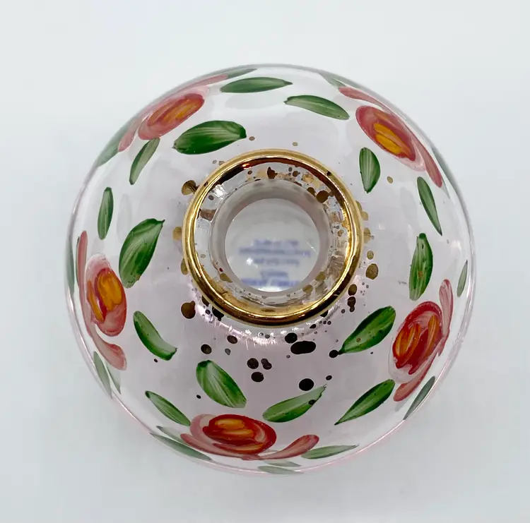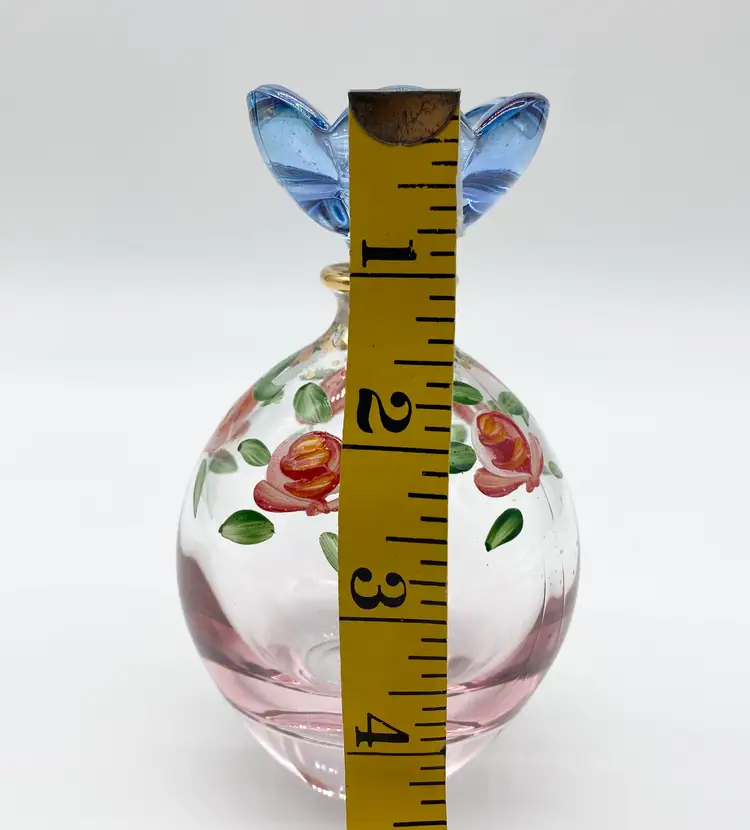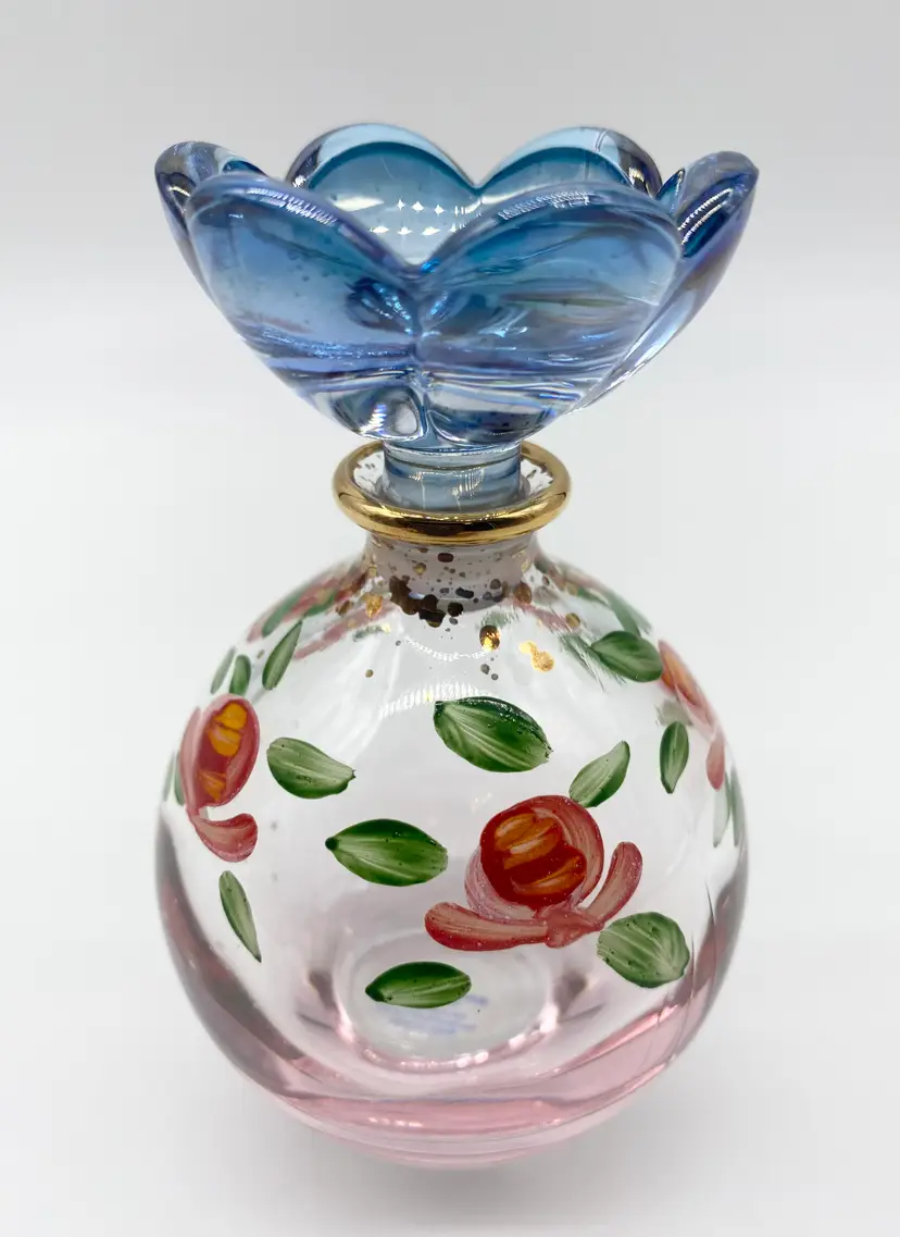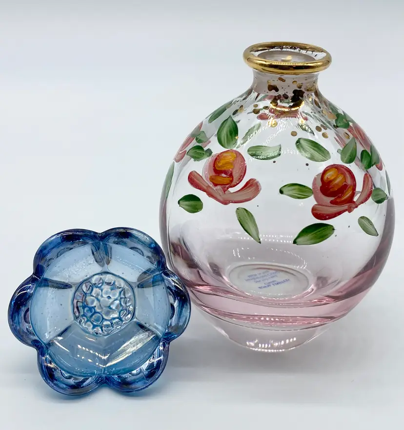 Used Condition. No Chips Or Cracks. Great Condition. *** See Photos for Details Size: 5" H x 2.5" W Flower Stopper Is 2" Across 24% Full Lead Crystal Blue Glass Iridescent Flower Stopper With Gold-Trimmed Bottle. Hand-painted red/Pink Roses.