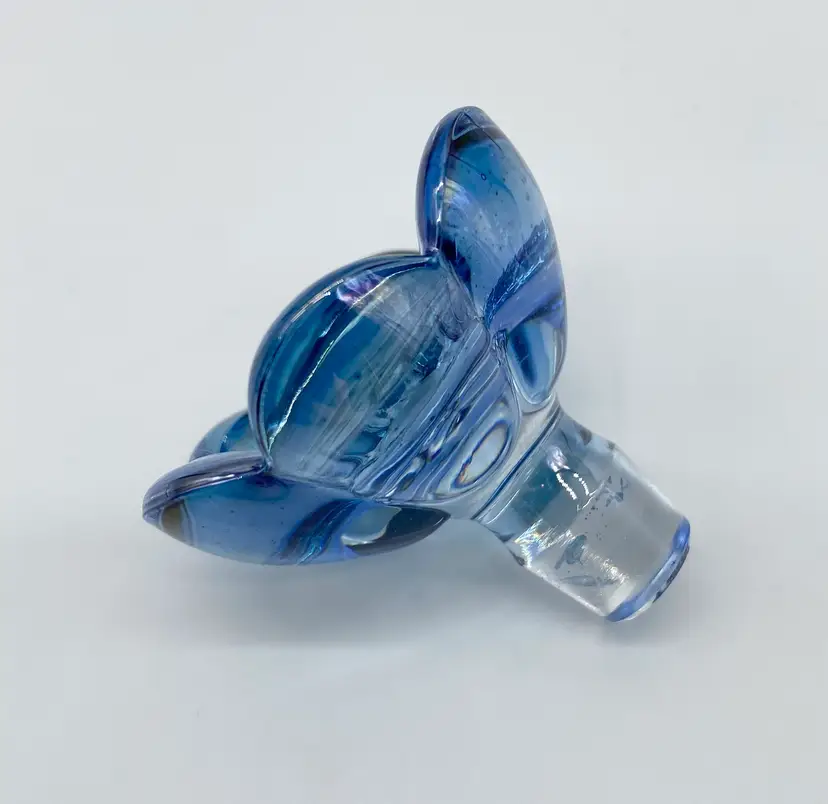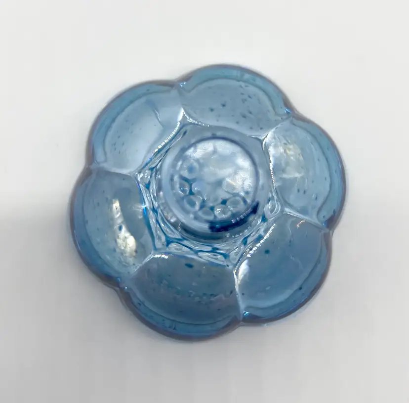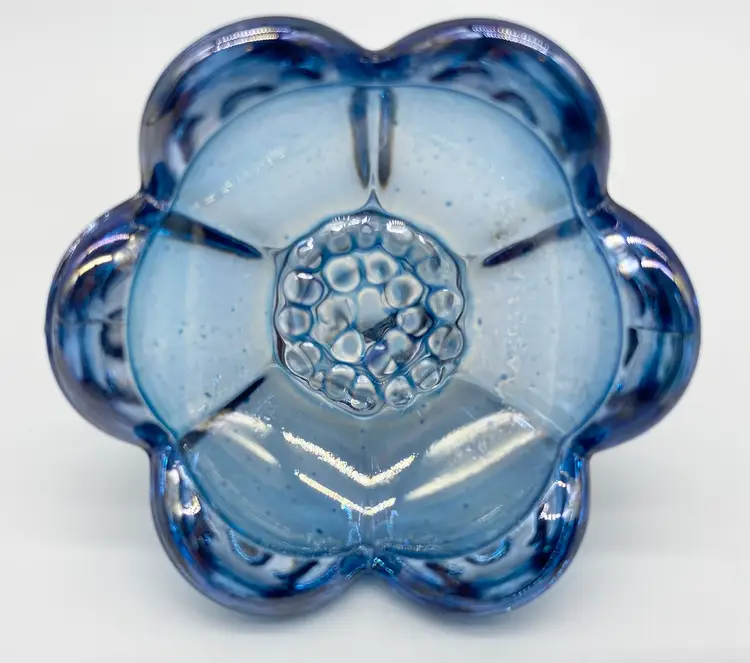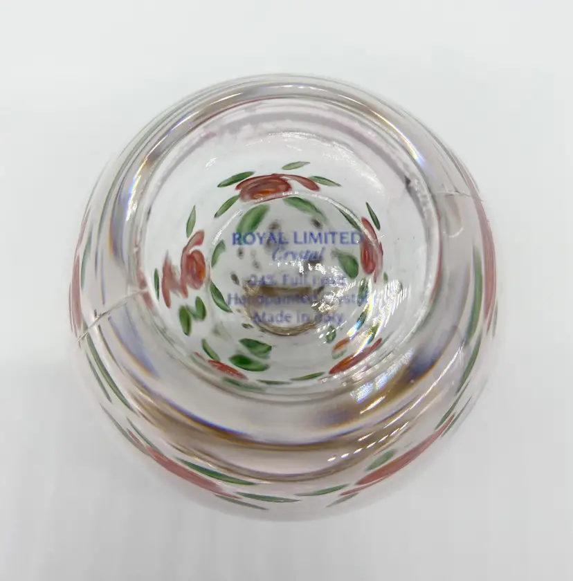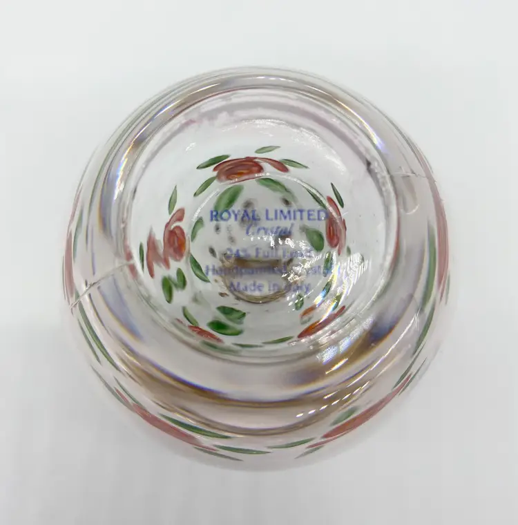 Used Condition. No Chips Or Cracks. Great Condition. *** See Photos for Details Size: 5" H x 2.5" W Flower Stopper Is 2" Across 24% Full Lead Crystal Blue Glass Iridescent Flower Stopper With Gold-Trimmed Bottle. Hand-painted red/Pink Roses.