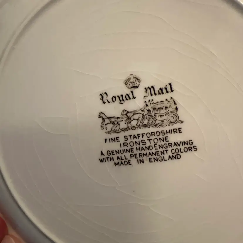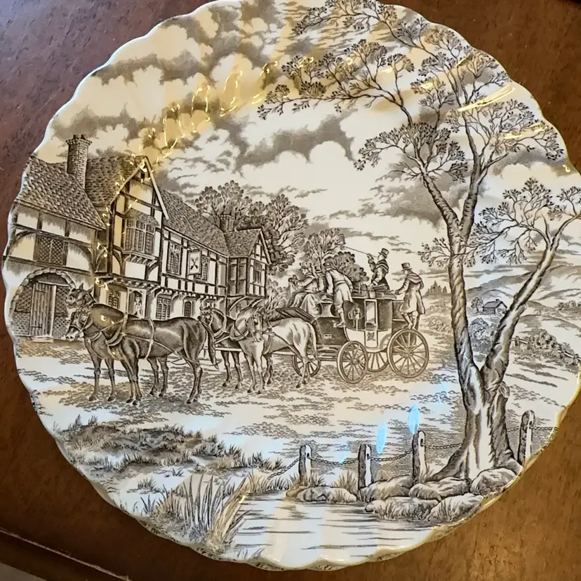 Ten inch dinner plate in the Staffordshire Mail Delivery pattern. This is the cream background.