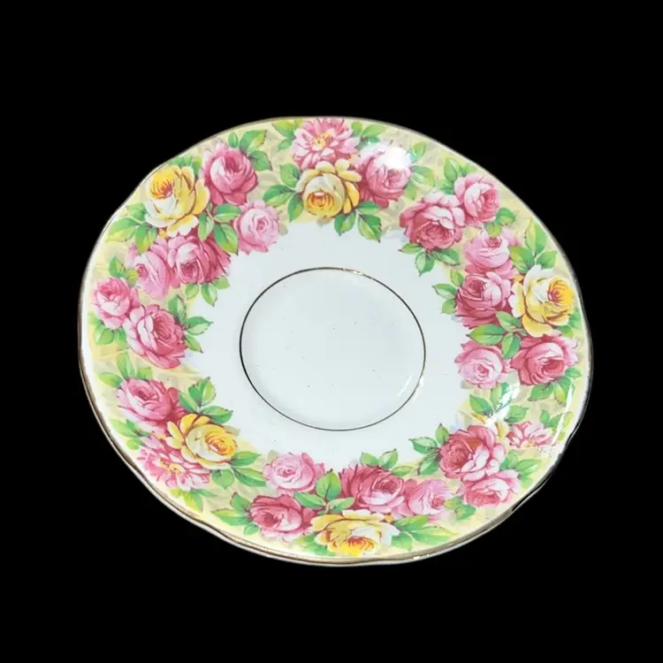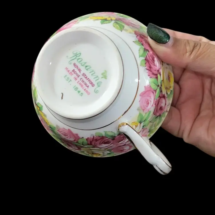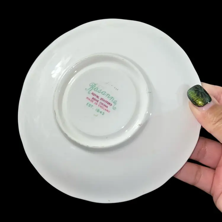 no chips or cracks teacup is 3.75” diameter and H 2” saucer is 5.5” diameter