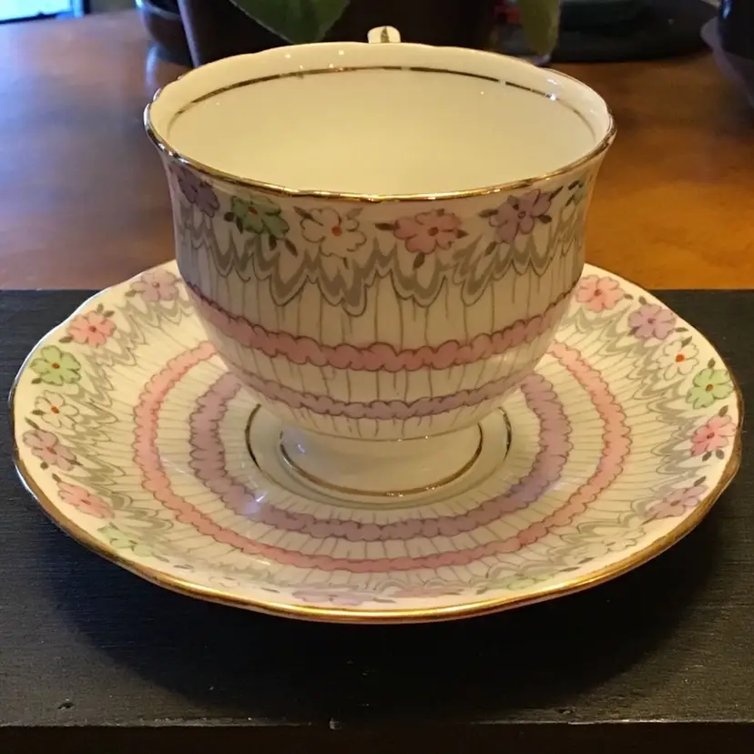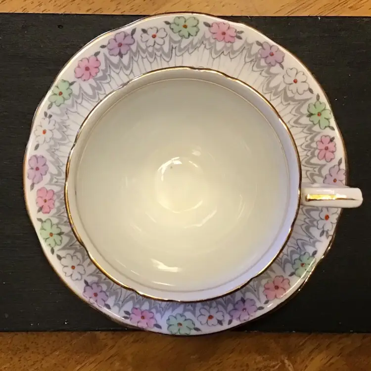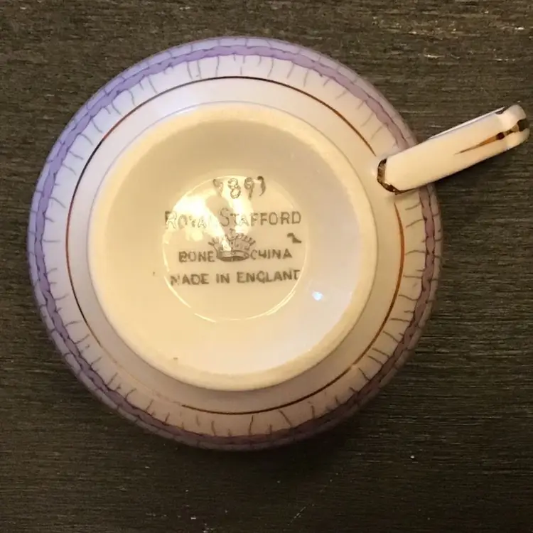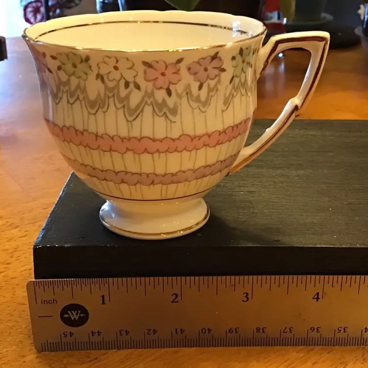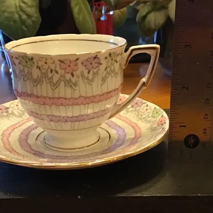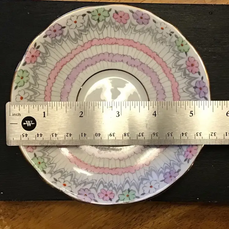 Super cute tea cup and saucer is in excellent condition. No chips, cracks, or repairs. There is one tiny manufacturing defect of a gold paint drop on the inside of the tea cup. Size is in the pictures. See all pictures as they are an important part of the description.