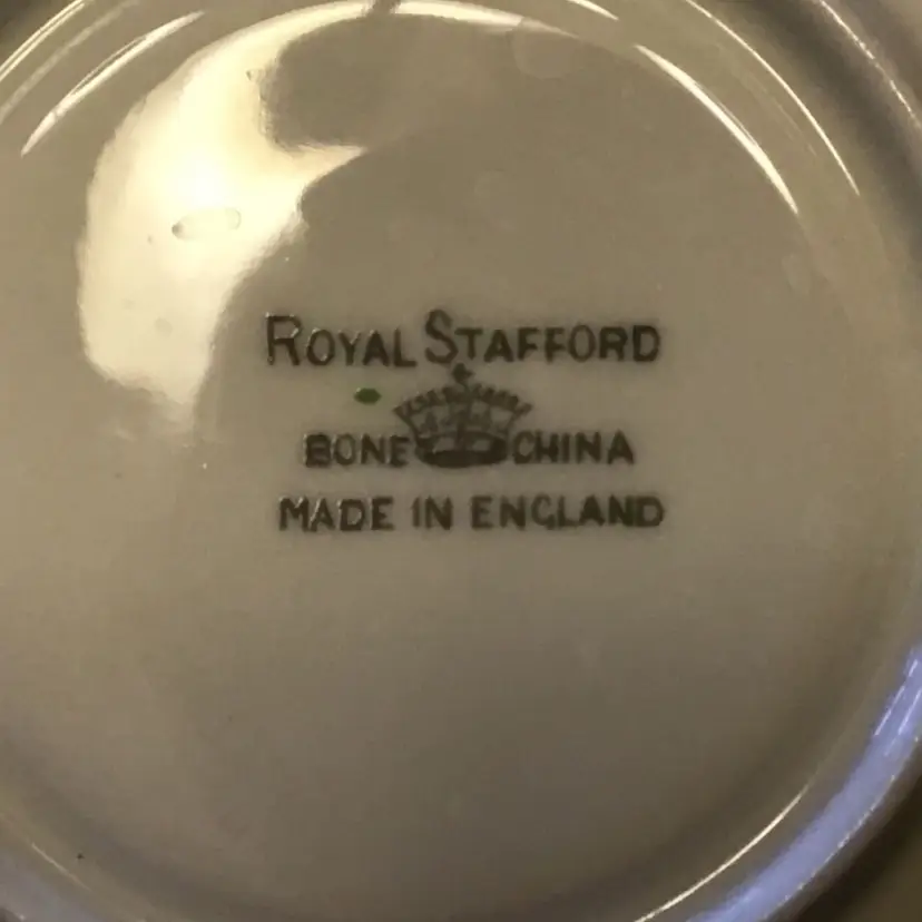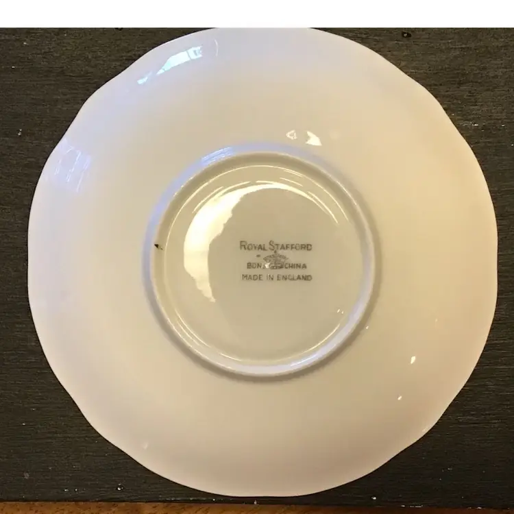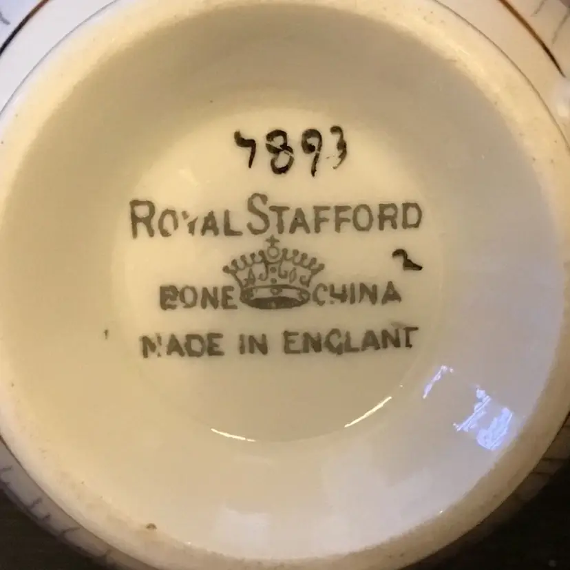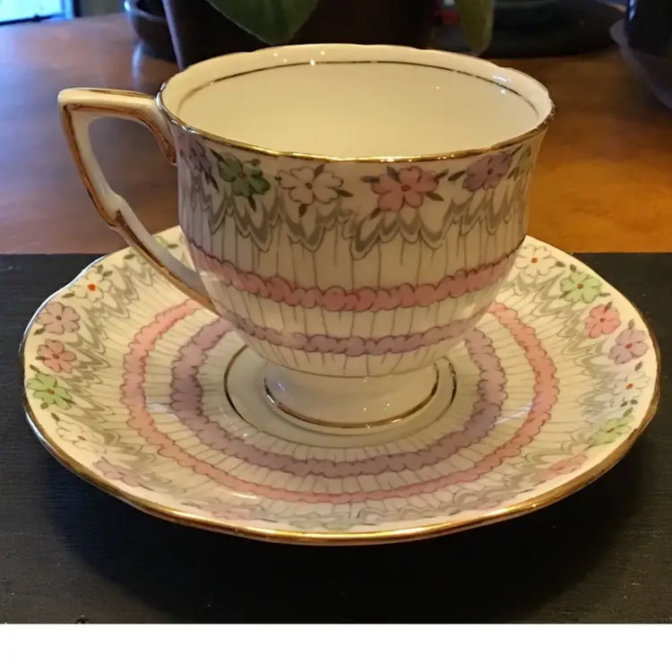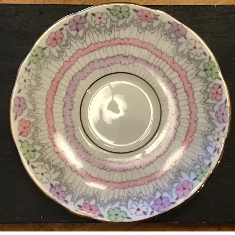 Super cute tea cup and saucer is in excellent condition. No chips, cracks, or repairs. There is one tiny manufacturing defect of a gold paint drop on the inside of the tea cup. Size is in the pictures. See all pictures as they are an important part of the description.