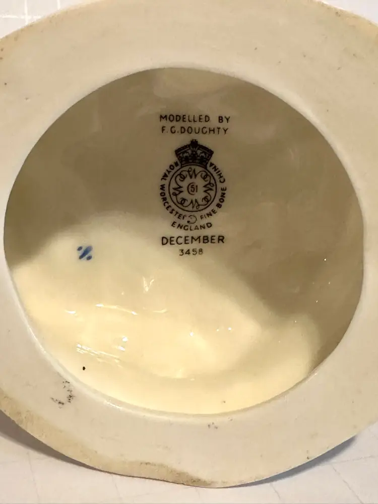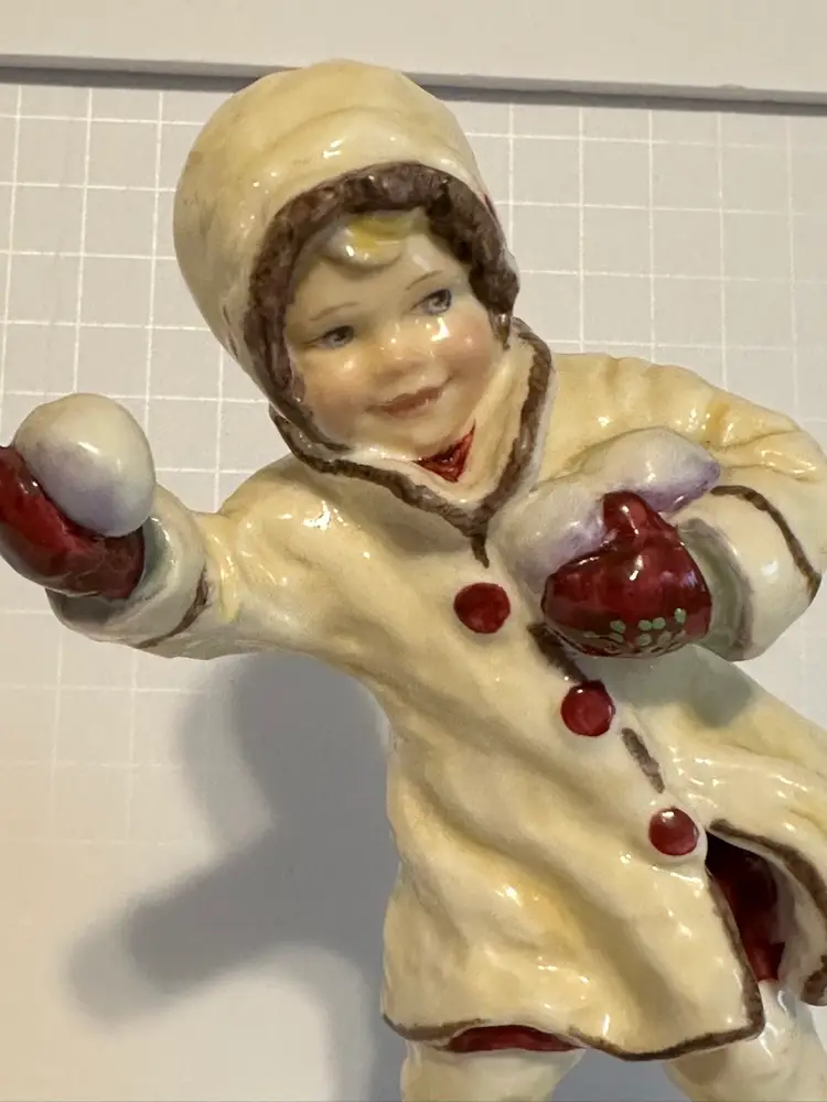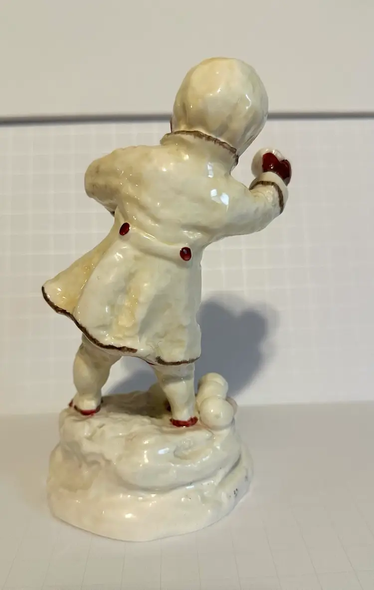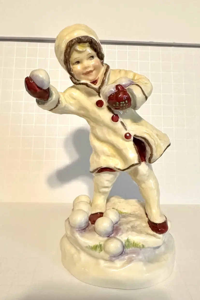 Royal Worcester porcelain figurine December. It is a child throwing snowballs. It is hand painted. It is 6.75”. In excellent condition, no chips, cracks or repairs.