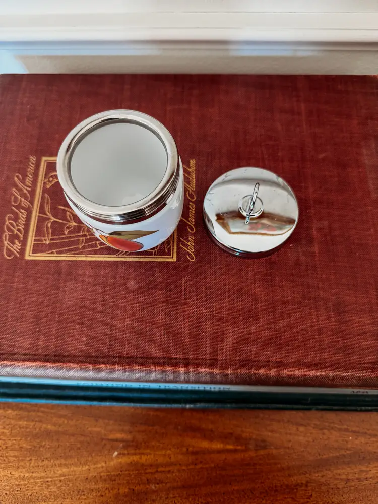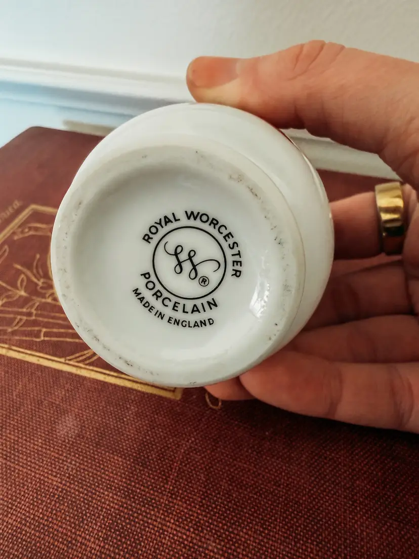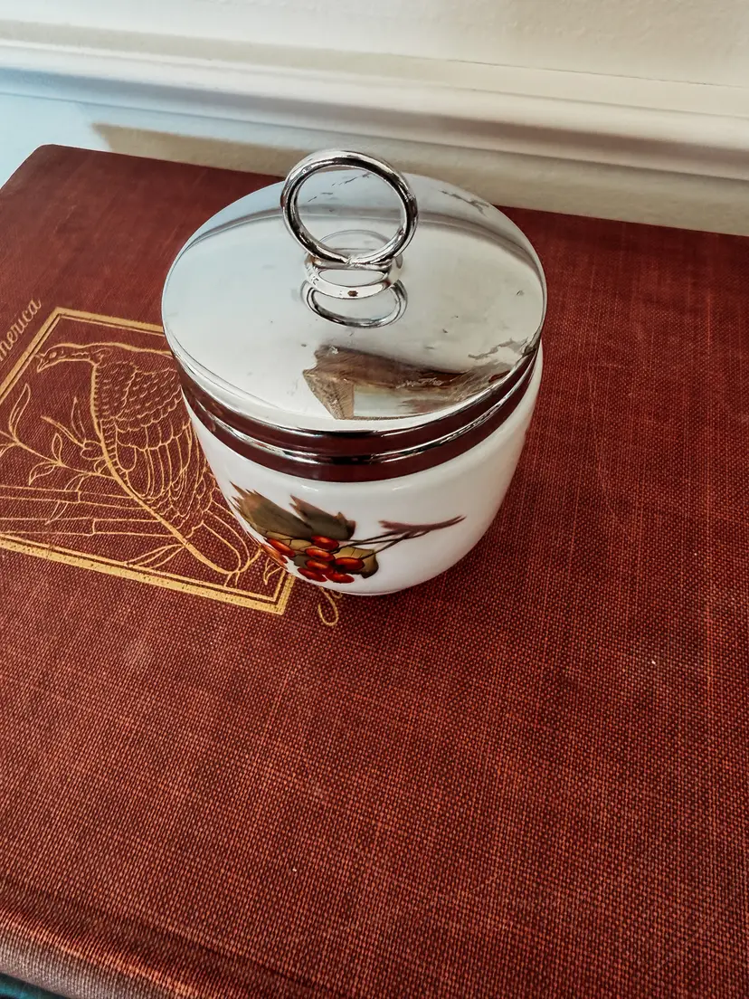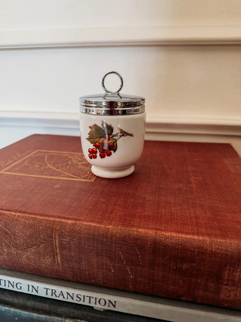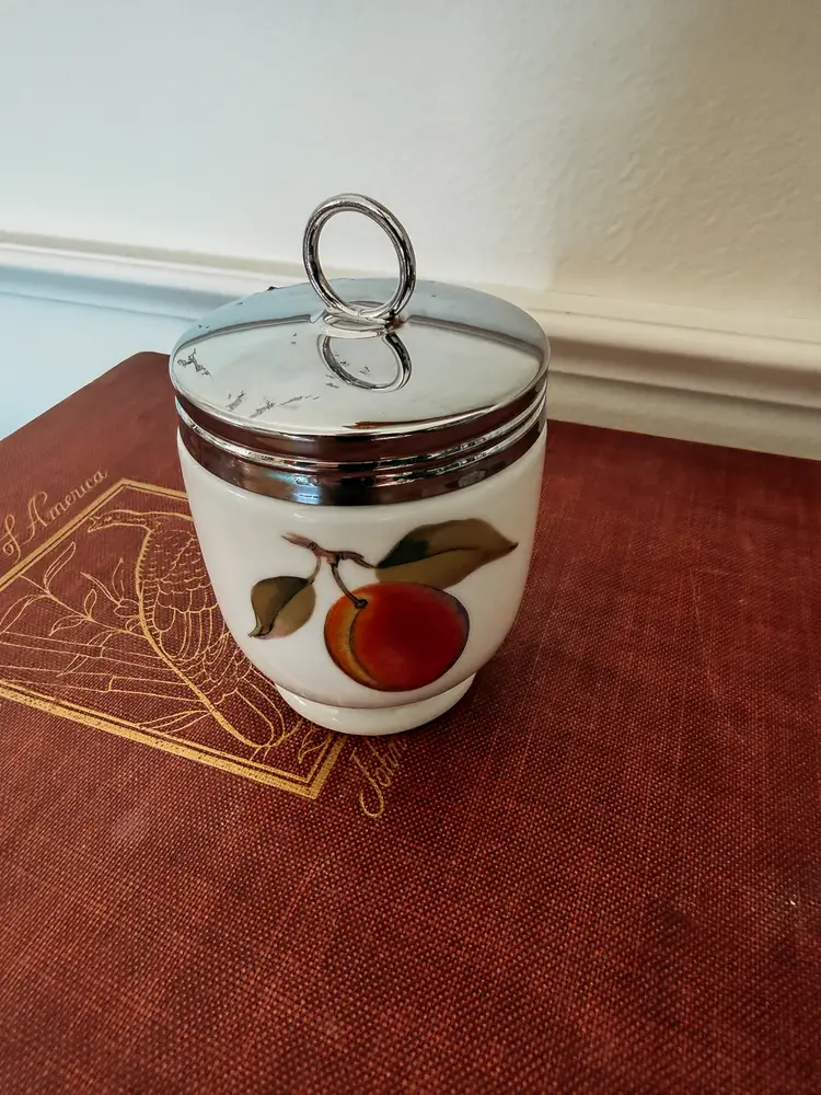 This vintage Royal Worcester porcelain egg coddler features the popular Evesham pattern, adorned with autumnal fruits like red currants. King Size egg coddler with a chrome lid. Function: Designed to cook eggs by submerging the lidded porcelain pot in boiling water. Discontinued pattern and highly collectible