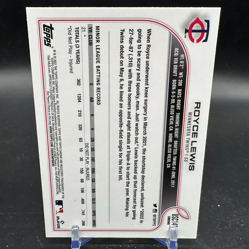 Royce Lewis Rookie Purple Refractor 2022 Topps Chrome USC143 Minnesota Twins RC Card is in good condition and please refer to pictures for full view from separate angles.