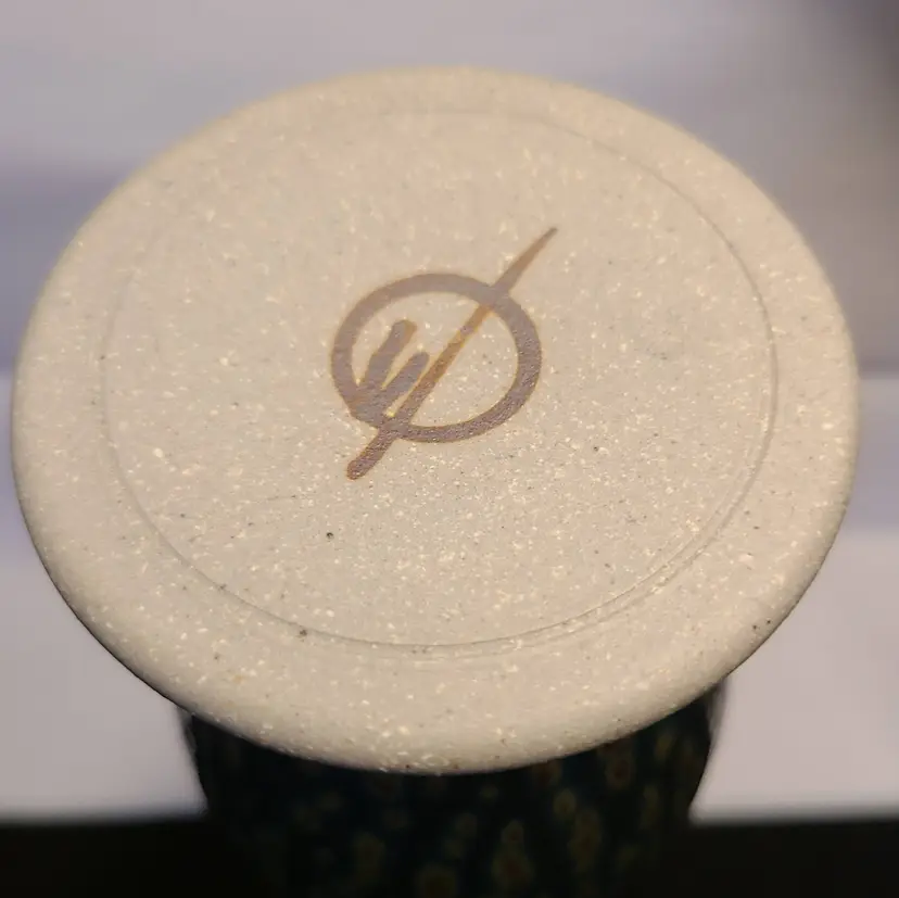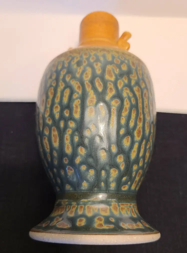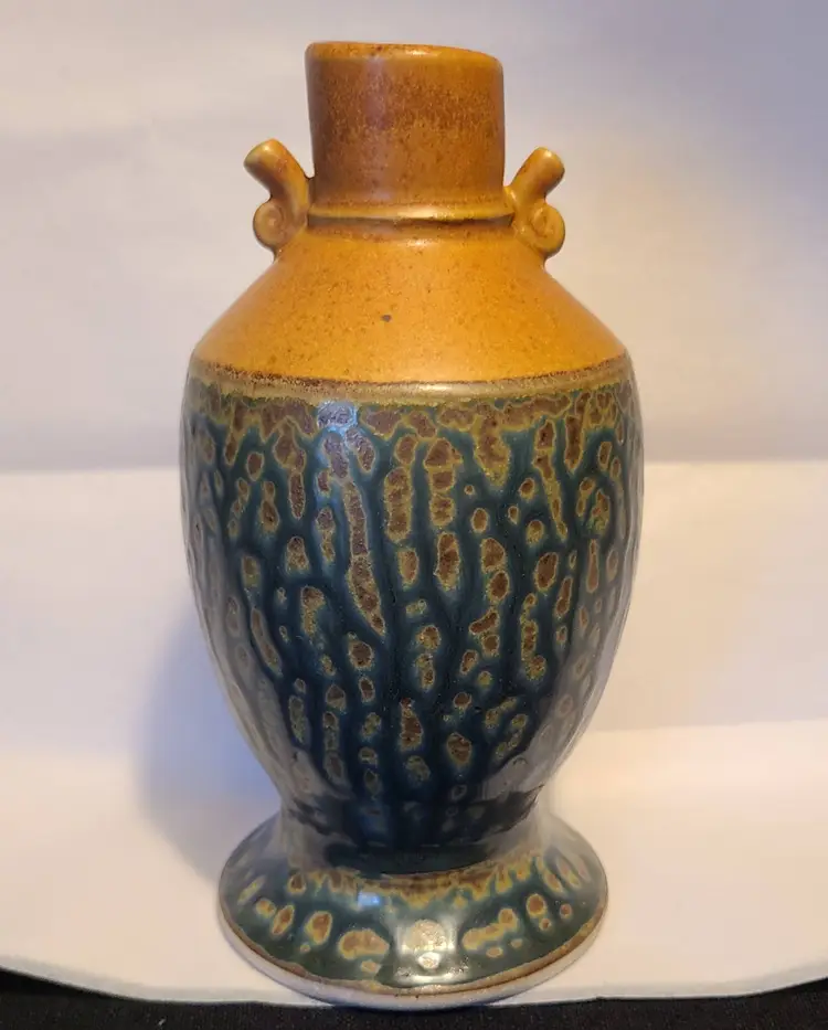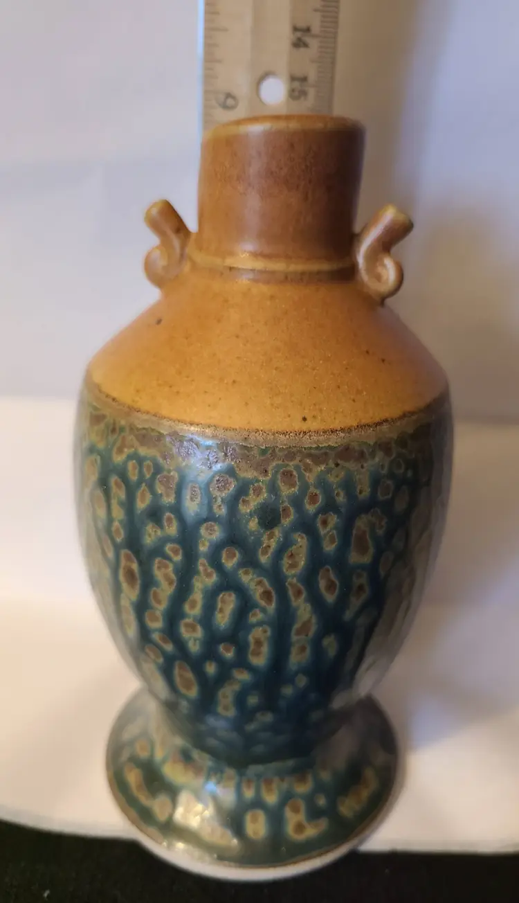 Beautiful hand thrown tan & greenish blue pottery. Measure approx 6.5" tall and 3" at widest point.
