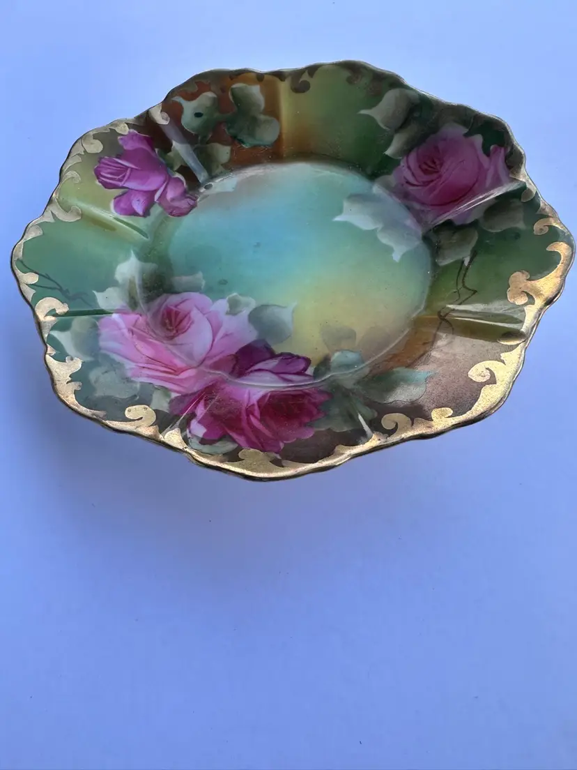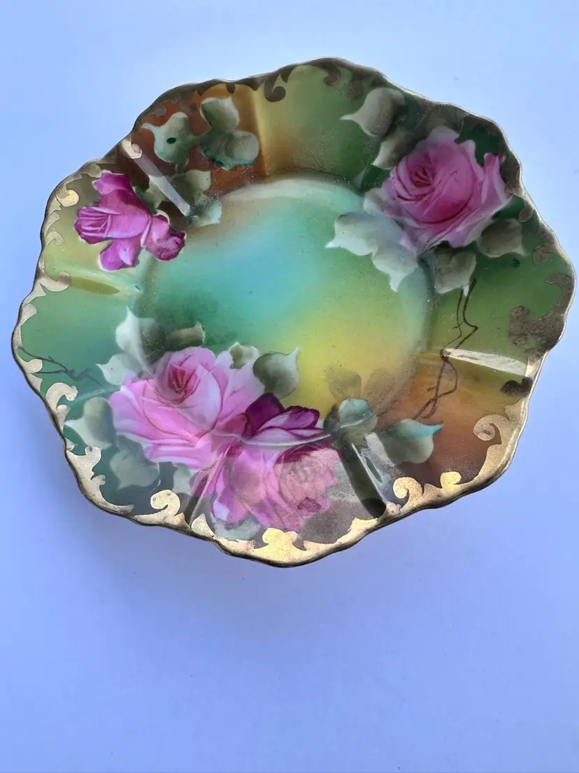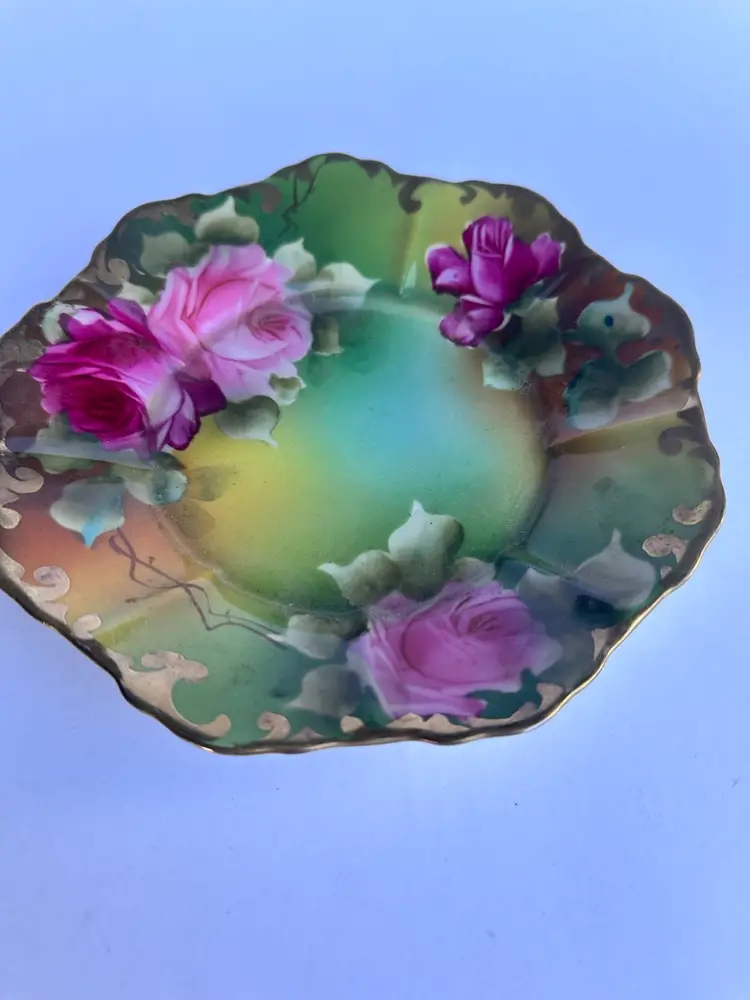An antique porcelain plate featuring hand painted pink roses and ornate gold detailing