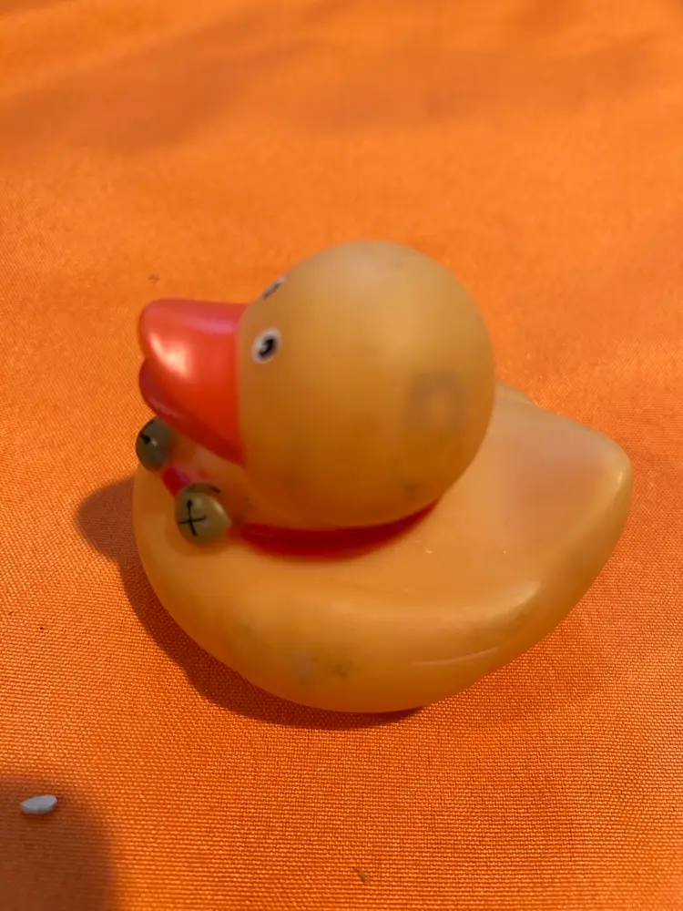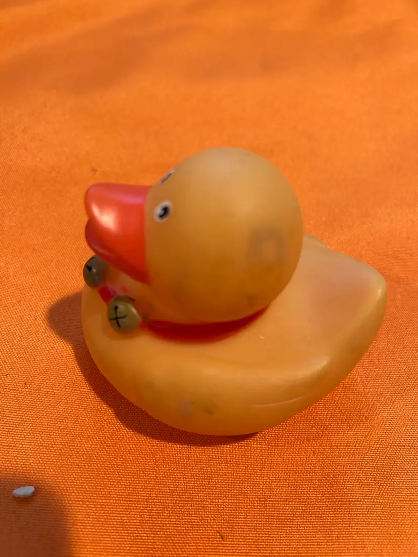 Rubber Duck bath gold ducky rubber ducky with bells on red collar condition good with smudging