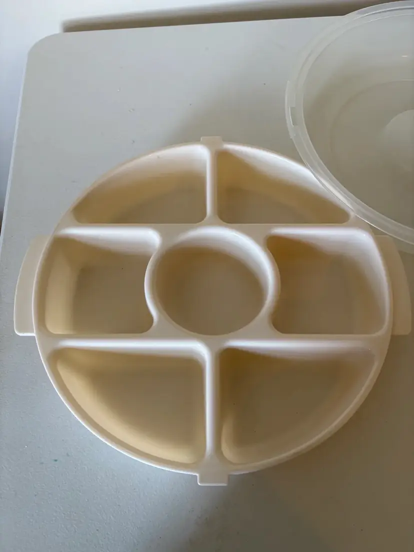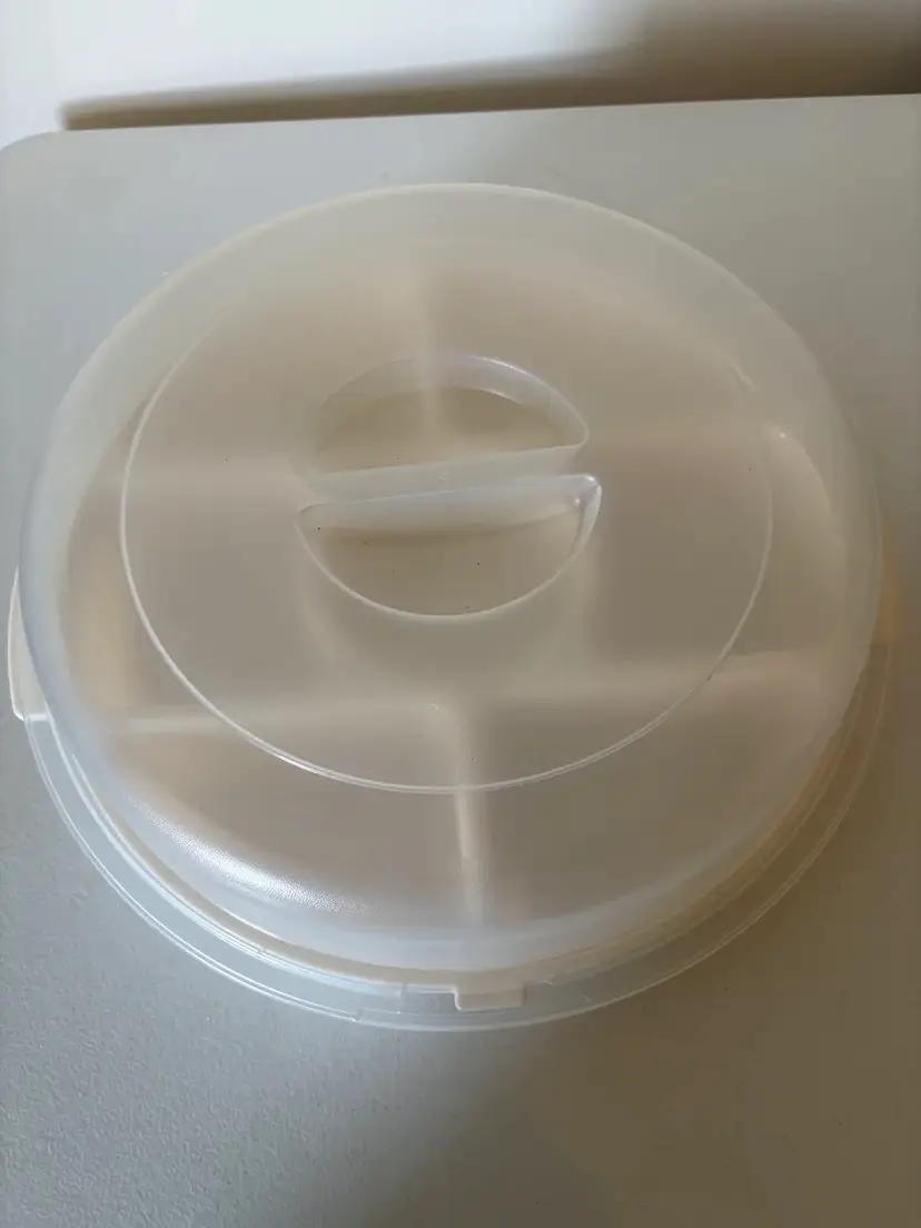 Store and organize your snacks with ease using the Rubbermaid Servin Saver Seven Divided Compartments Round Container. Made of durable plastic, this vintage-style container features seven compartments and a screw lid for secure closure. With dimensions of 11.5" x 11.5" x 10.75" x 5.5", this container is perfect for on-the-go snacking.