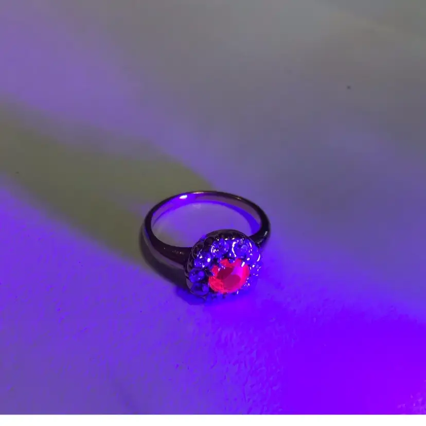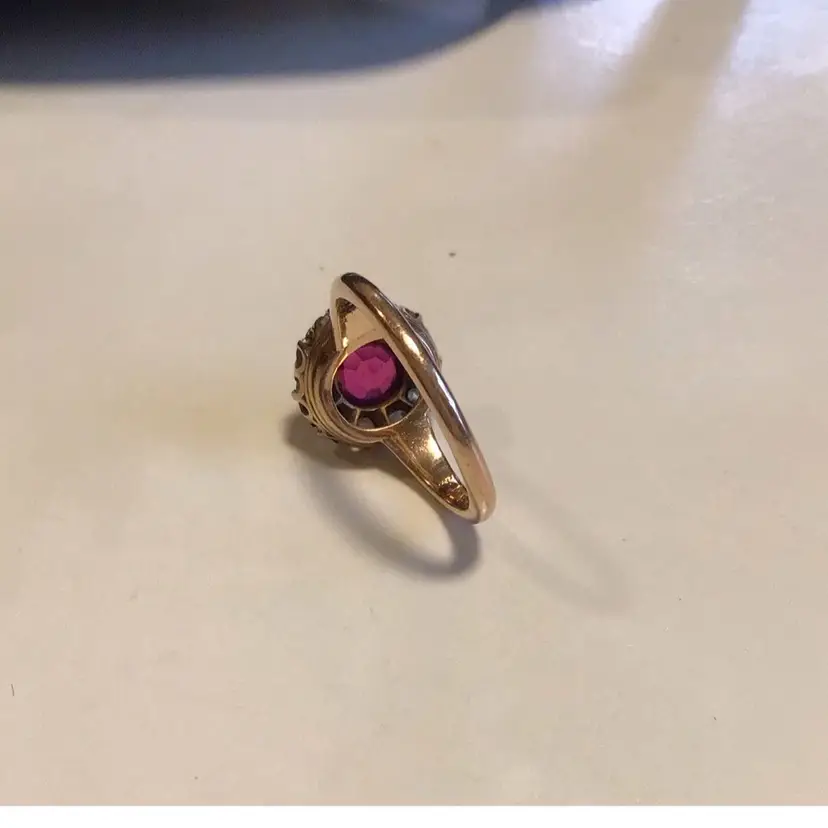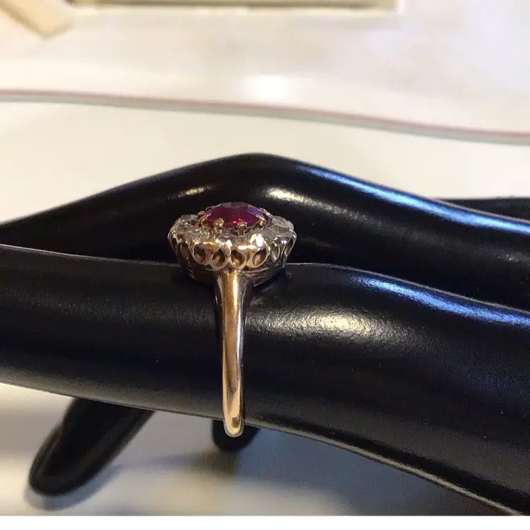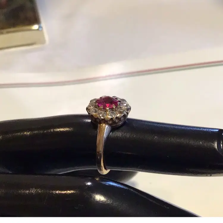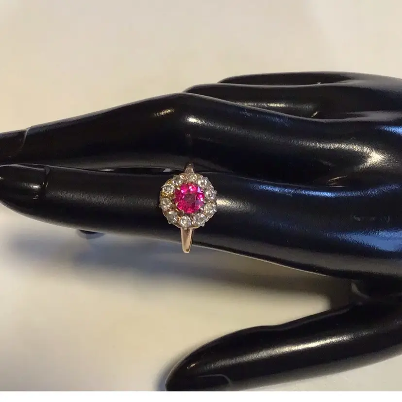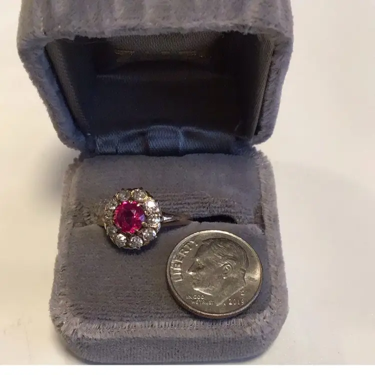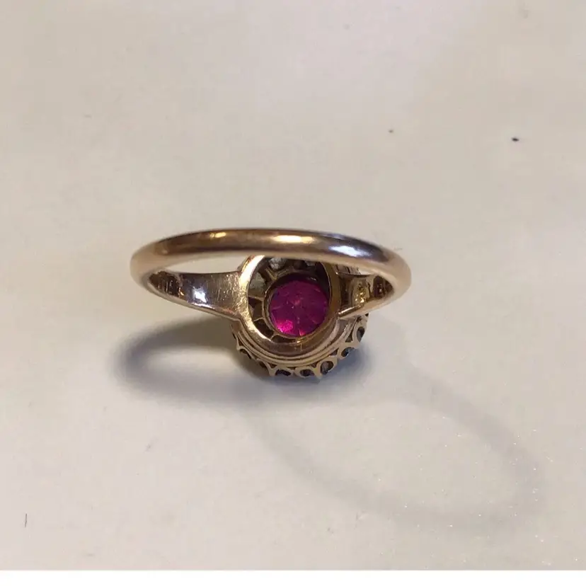 Size 4-1/2 ruby with diamond halo in yellow gold, tested & confirmed 14K. #461