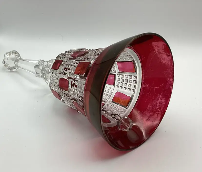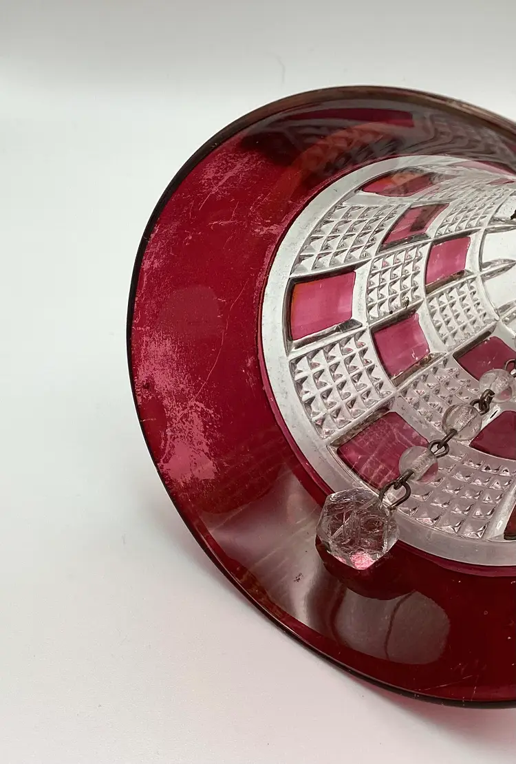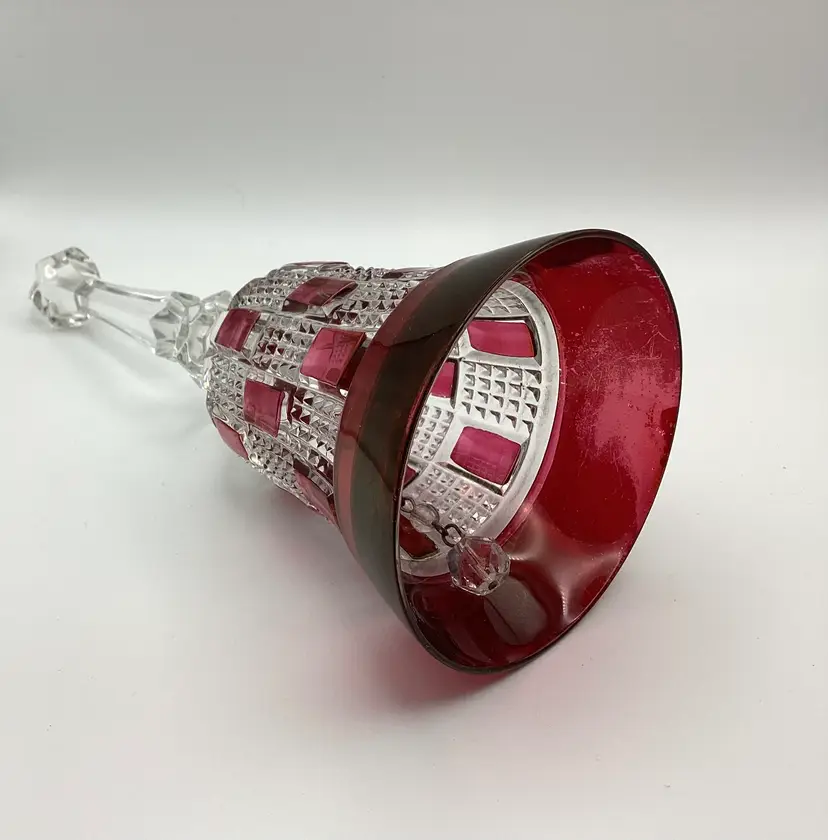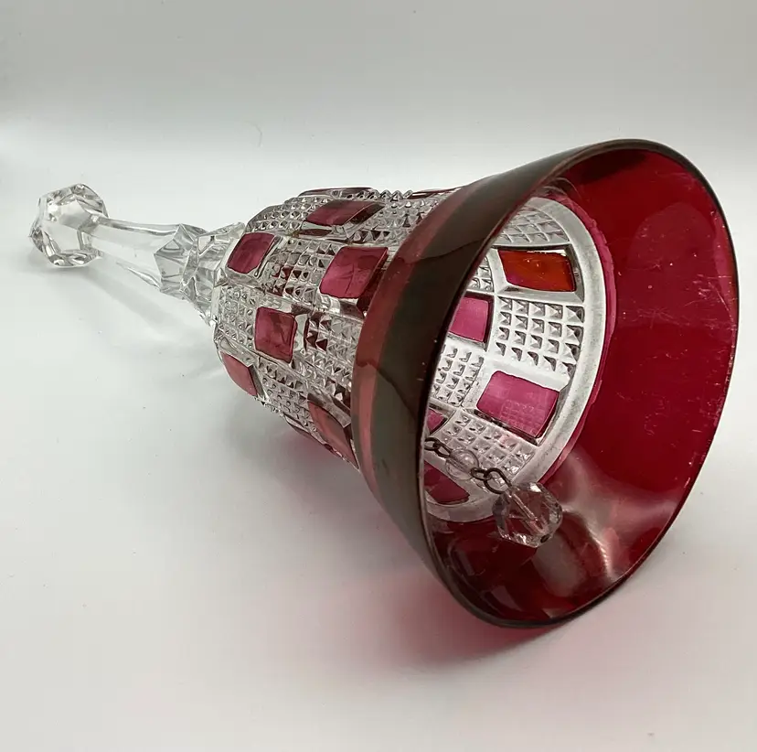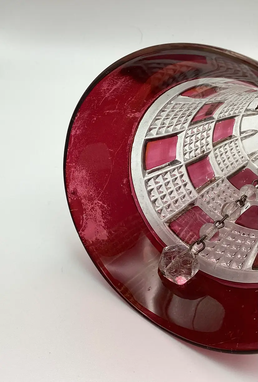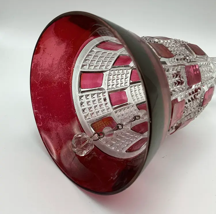 Pattern/Design: Quilted / Checkered / Geometric Color: Ruby Flash to Clear Glass (Crystal?) Measurements: Height - 7” Width - 3”